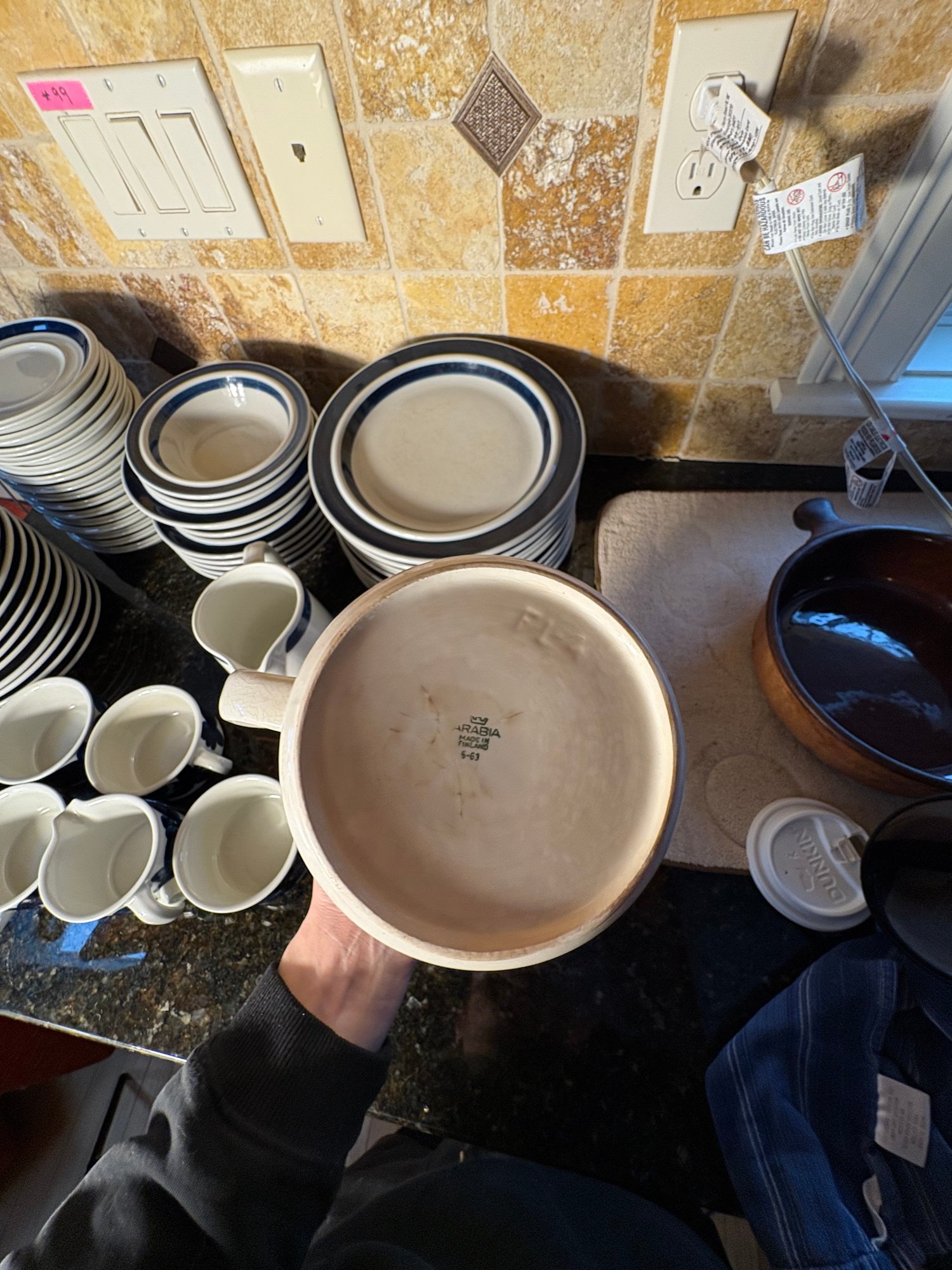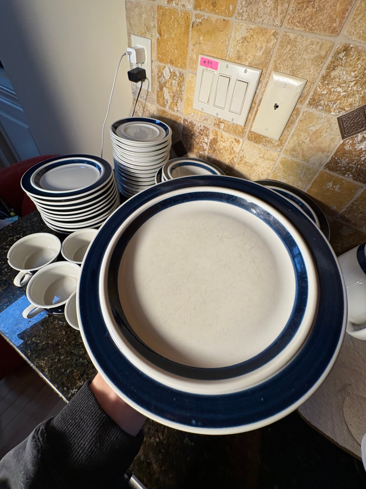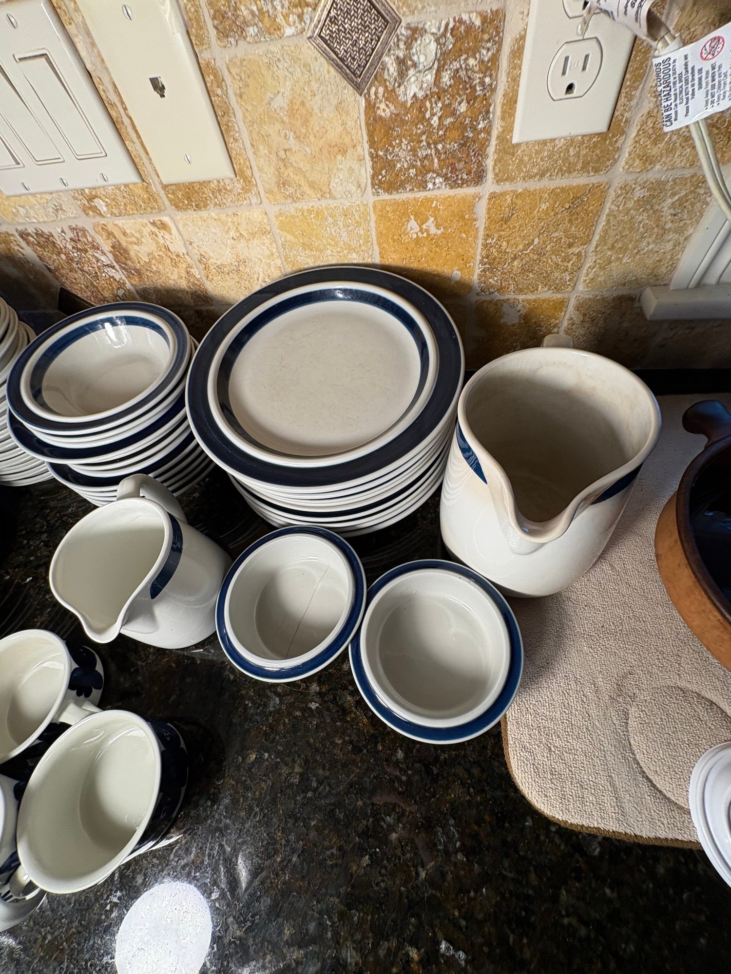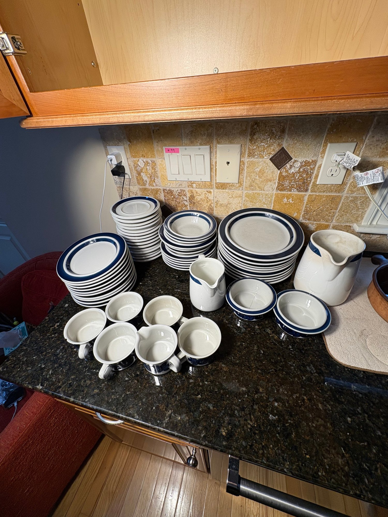 Dimensions approximately large china plate 9 pc diameter 10 inches. Medium plate 10pc 8 inches in diameter. Small plate 15pc 6.5 inches in diameter. Small bowl 4pc 7 inches in diameter. Large bowl 6pc 8 inches in diameter. Medium tea cup 4.5 inches in diameter 5.25 inches tall. Small tea cup 4 pc 4 inches in diameter. Ramekin 4 inches in diameter. Large tea cup 6 inches in diameter 7.5 inches tall