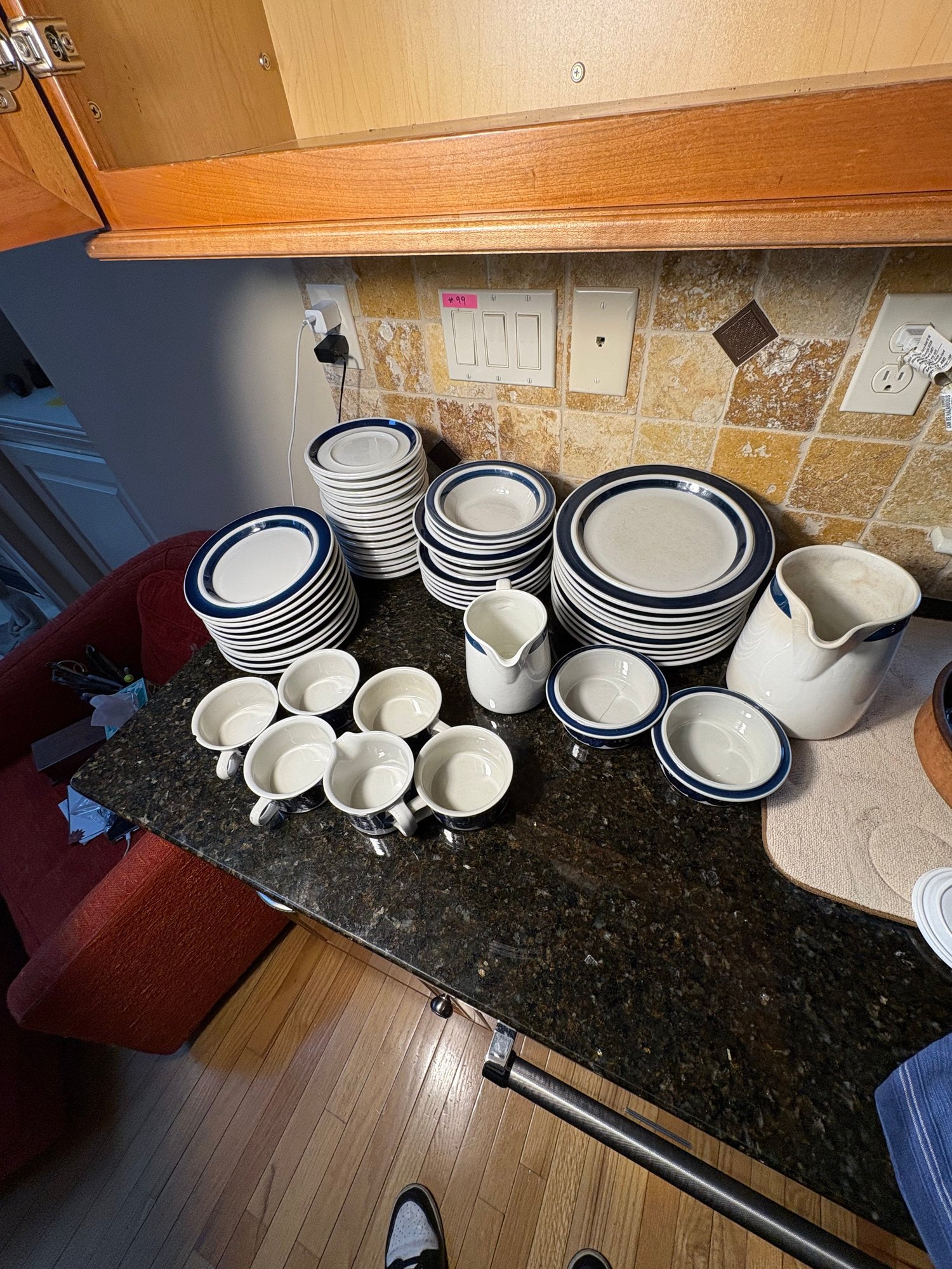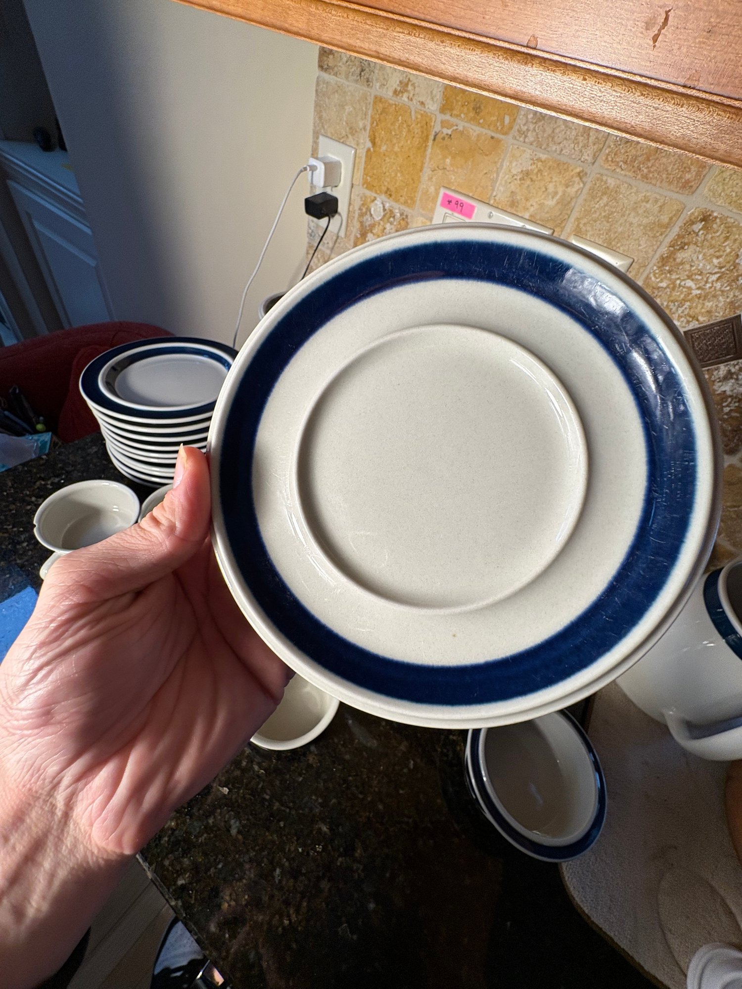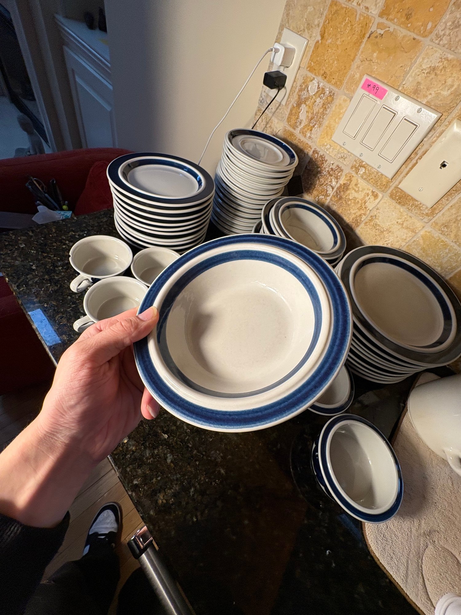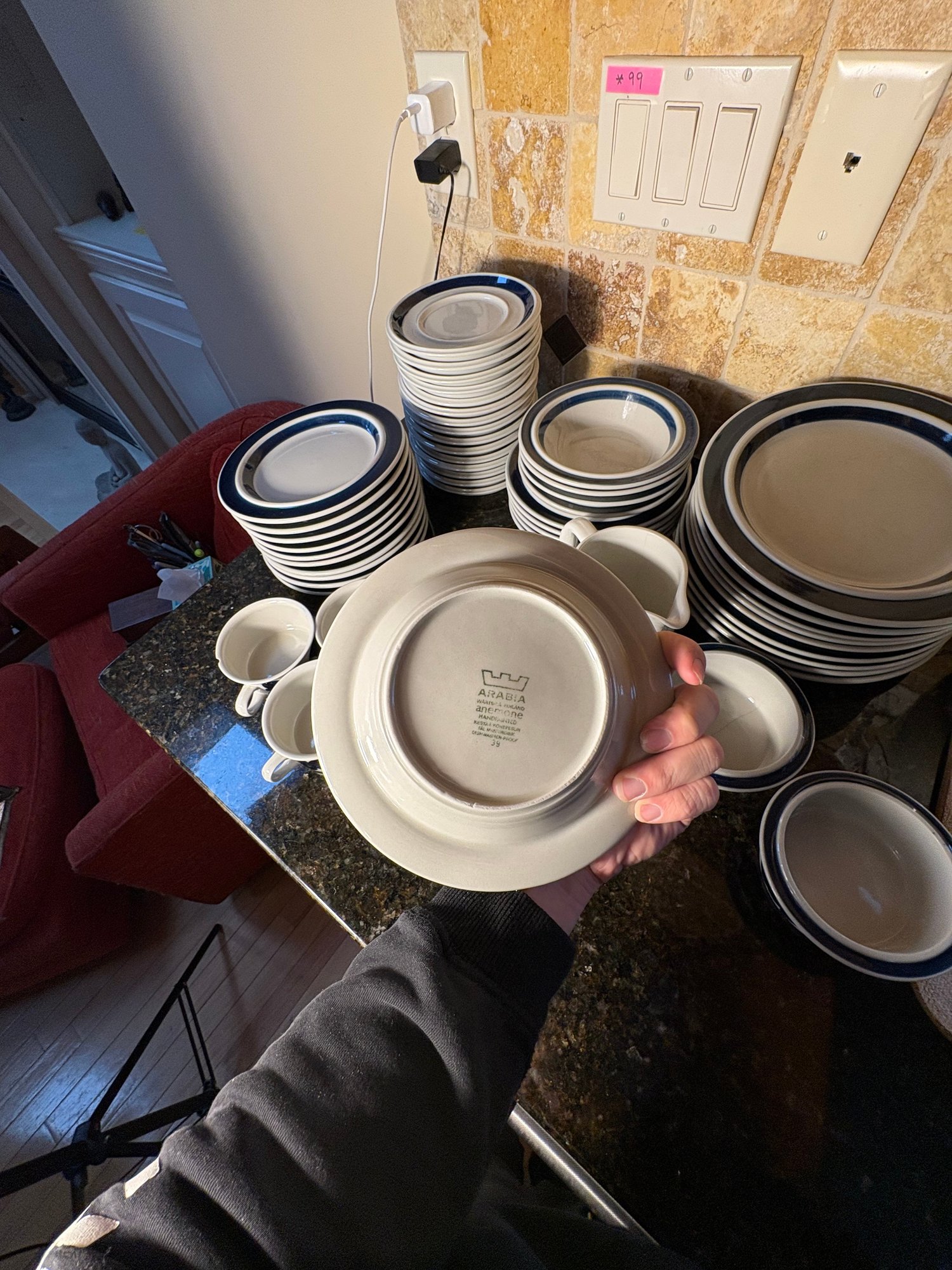 Dimensions approximately large china plate 9 pc diameter 10 inches. Medium plate 10pc 8 inches in diameter. Small plate 15pc 6.5 inches in diameter. Small bowl 4pc 7 inches in diameter. Large bowl 6pc 8 inches in diameter. Medium tea cup 4.5 inches in diameter 5.25 inches tall. Small tea cup 4 pc 4 inches in diameter. Ramekin 4 inches in diameter. Large tea cup 6 inches in diameter 7.5 inches tall