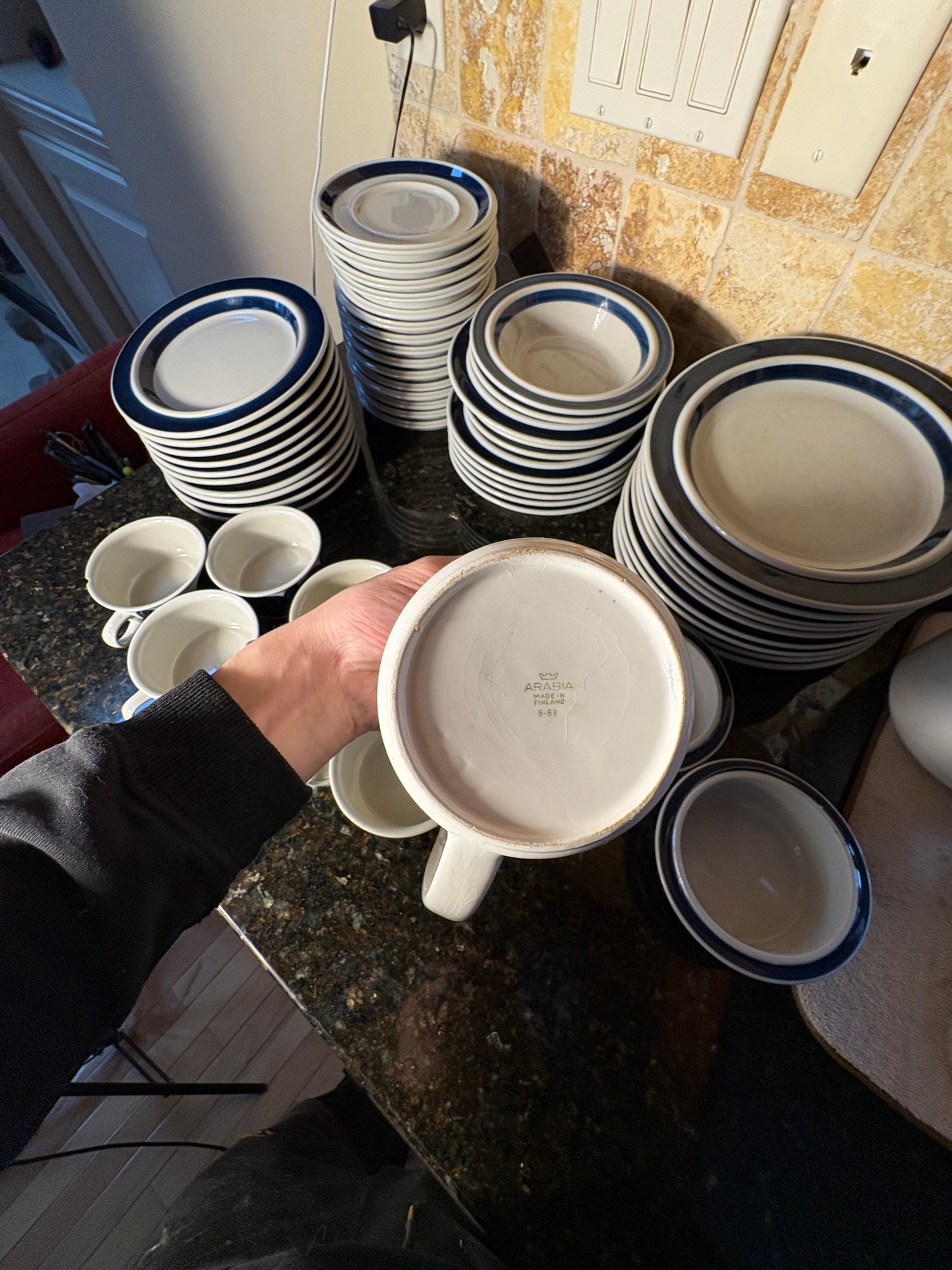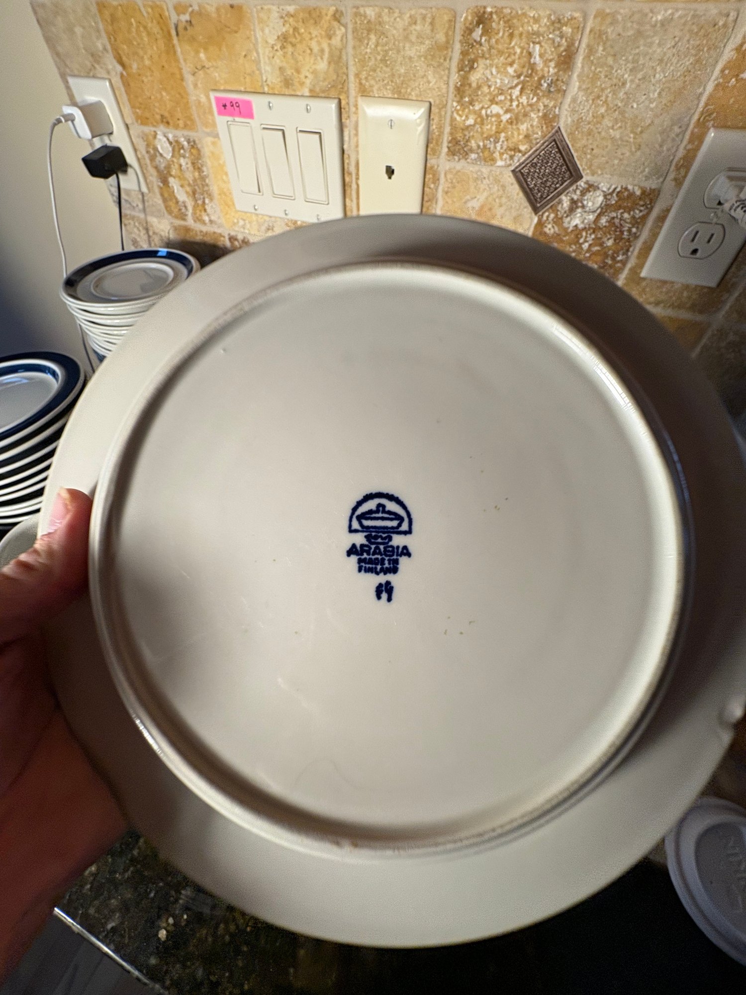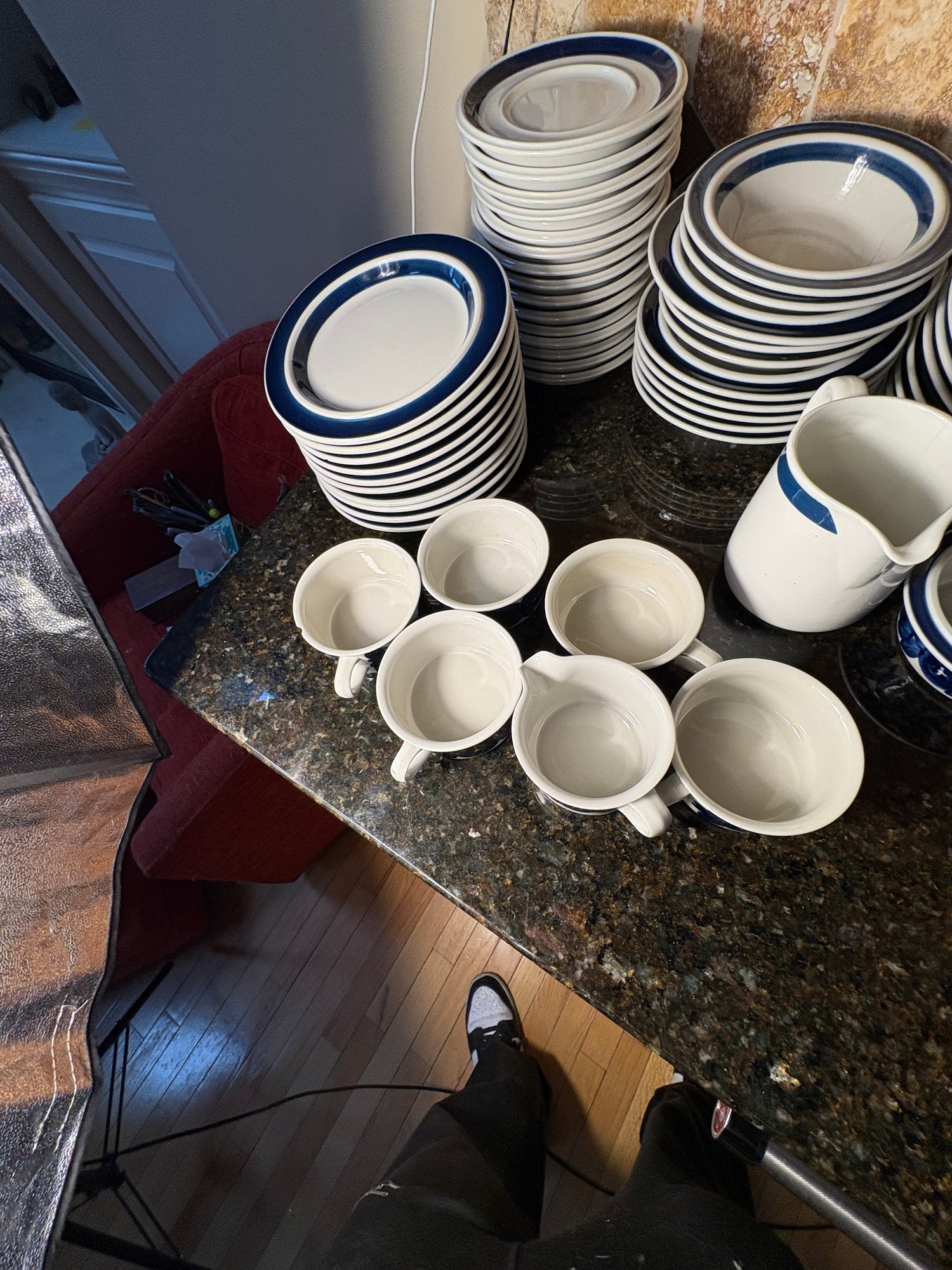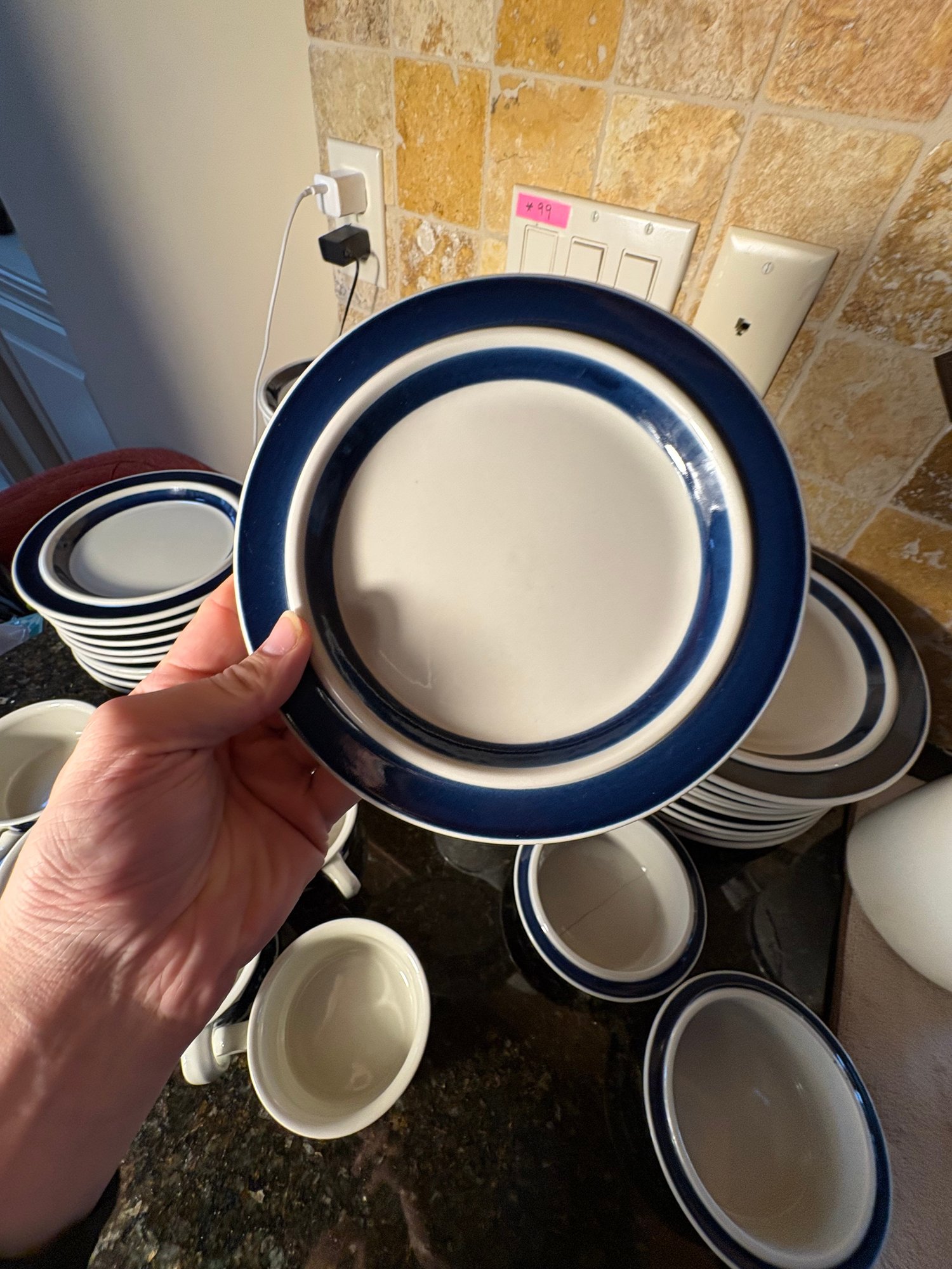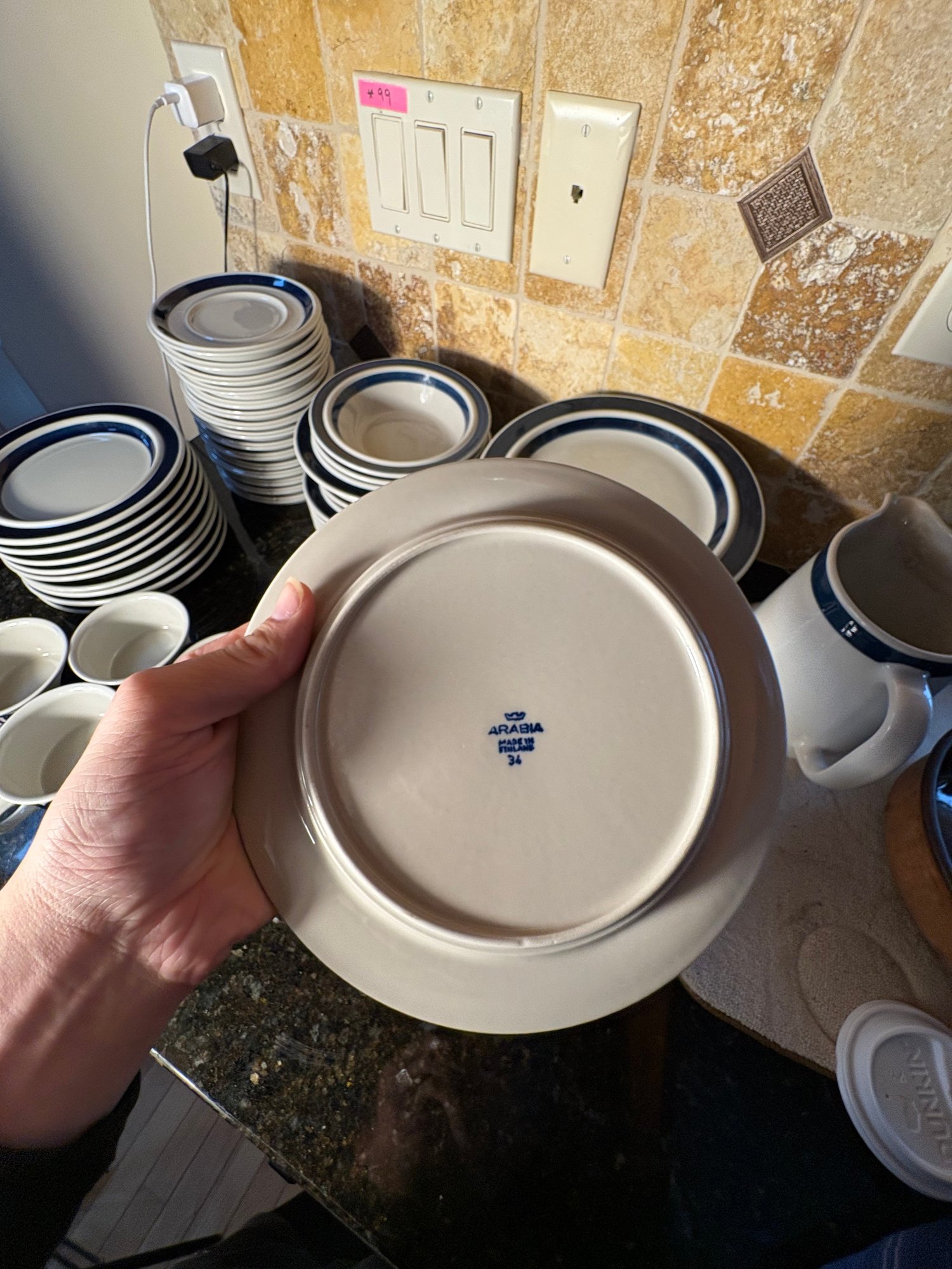Dimensions approximately large china plate 9 pc diameter 10 inches. Medium plate 10pc 8 inches in diameter. Small plate 15pc 6.5 inches in diameter. Small bowl 4pc 7 inches in diameter. Large bowl 6pc 8 inches in diameter. Medium tea cup 4.5 inches in diameter 5.25 inches tall. Small tea cup 4 pc 4 inches in diameter. Ramekin 4 inches in diameter. Large tea cup 6 inches in diameter 7.5 inches tall