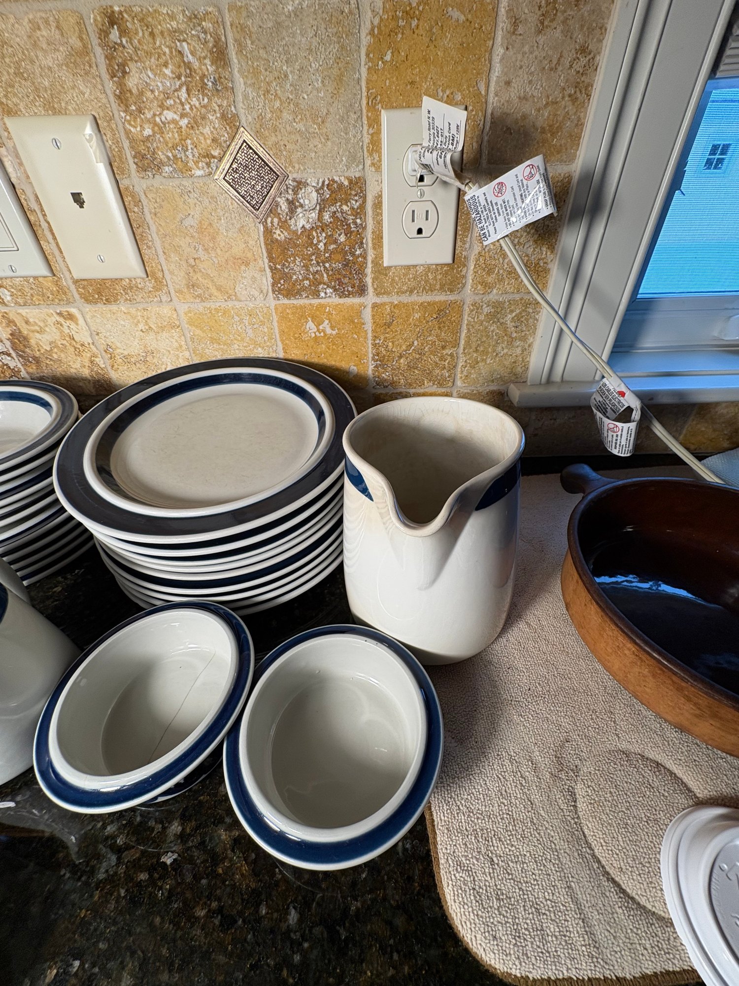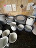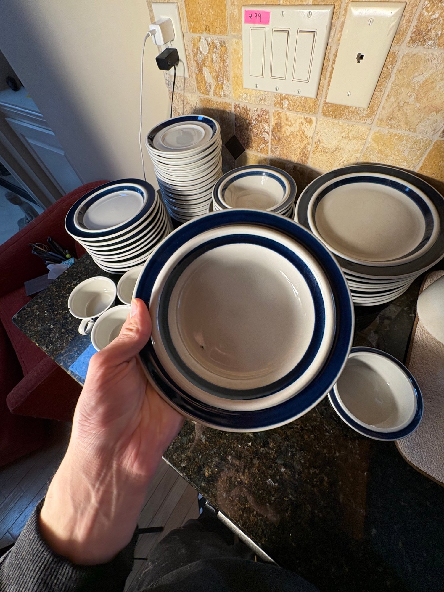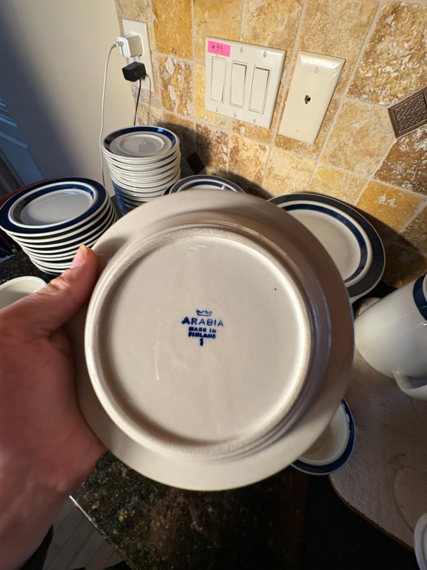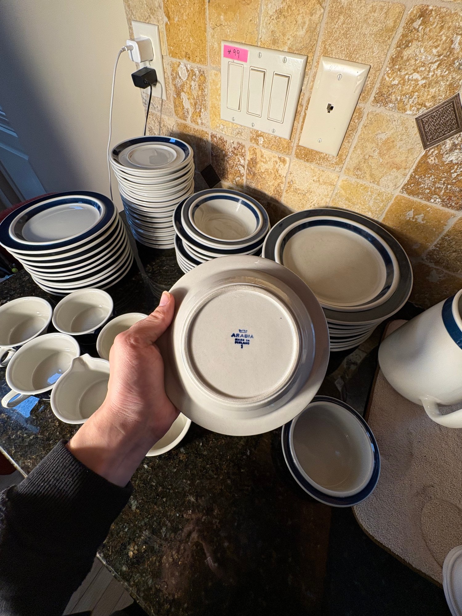 Dimensions approximately large china plate 9 pc diameter 10 inches. Medium plate 10pc 8 inches in diameter. Small plate 15pc 6.5 inches in diameter. Small bowl 4pc 7 inches in diameter. Large bowl 6pc 8 inches in diameter. Medium tea cup 4.5 inches in diameter 5.25 inches tall. Small tea cup 4 pc 4 inches in diameter. Ramekin 4 inches in diameter. Large tea cup 6 inches in diameter 7.5 inches tall