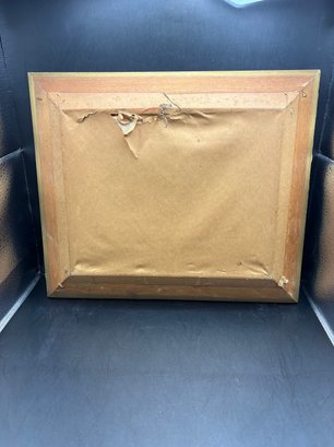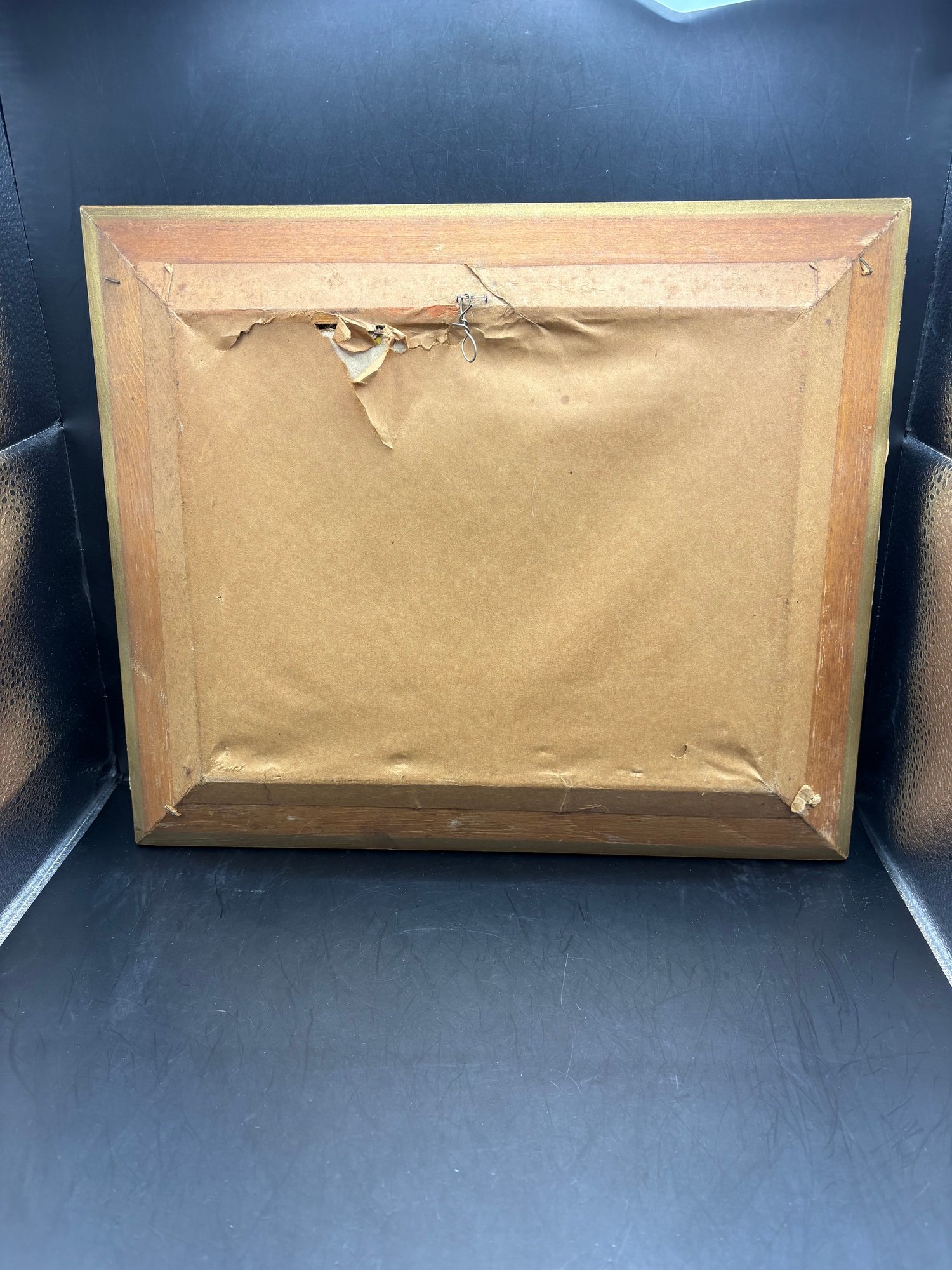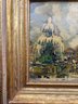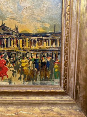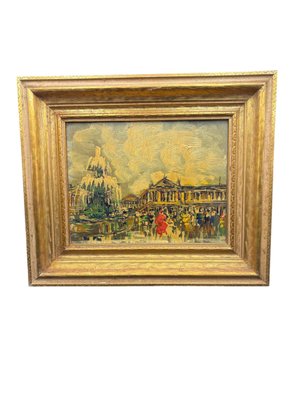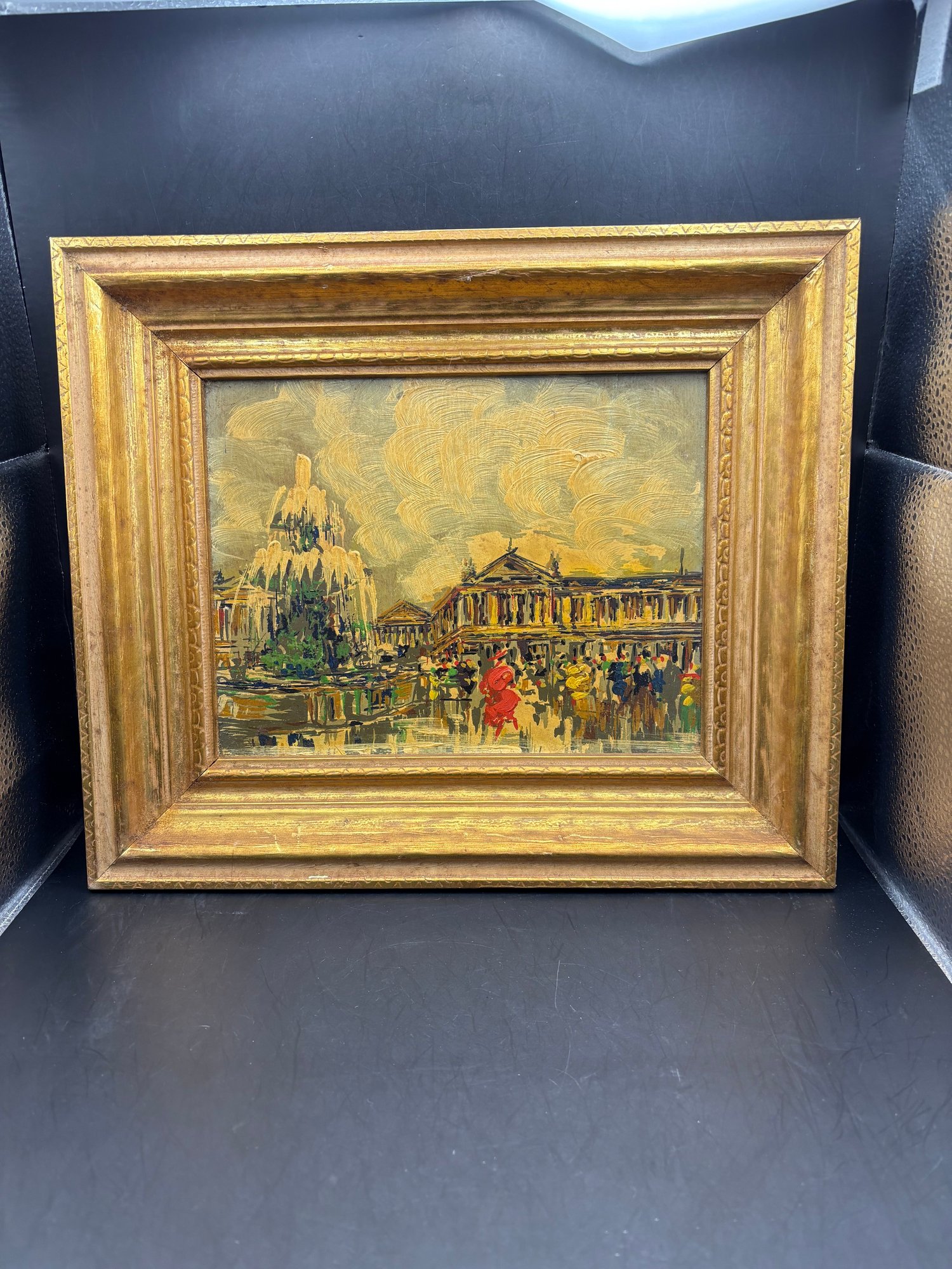 Acrylic on wood 13 x 11“ it’s a scene with a fountain and an outdoor space