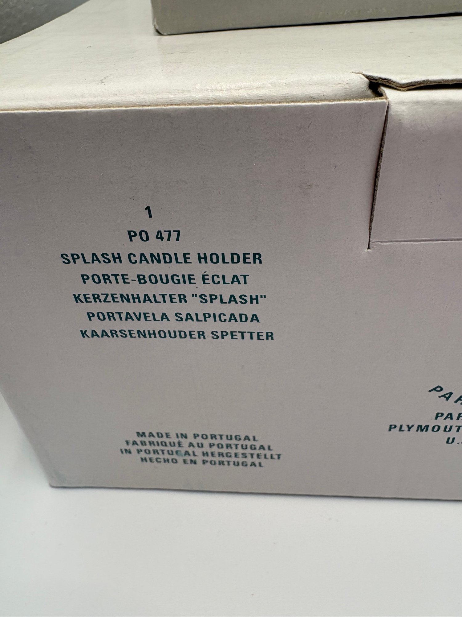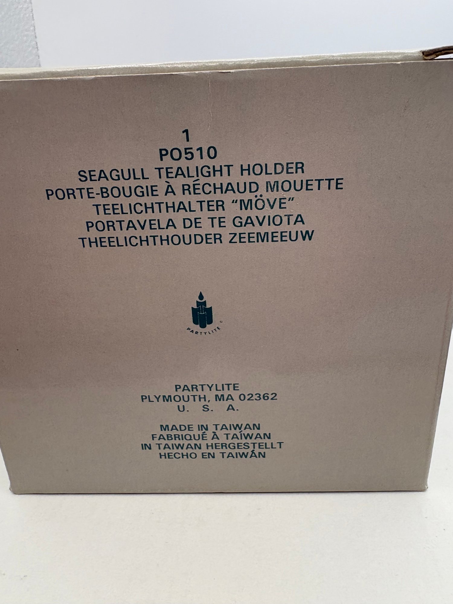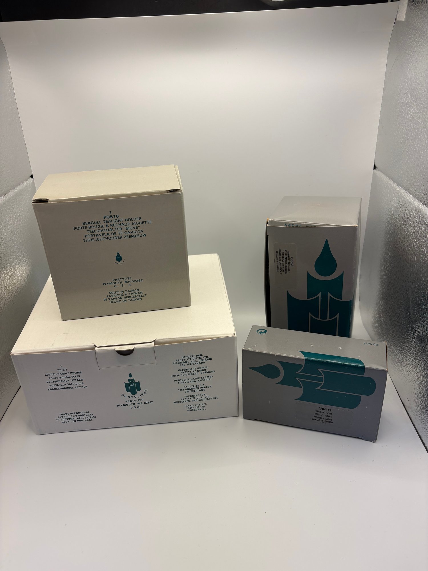 There’s four items from the party light candle company in the original boxes there’s vanilla votives 12 there’s one raspberry round candle not two only one seagull tea light holder, and there’s also another glass splash candle holder