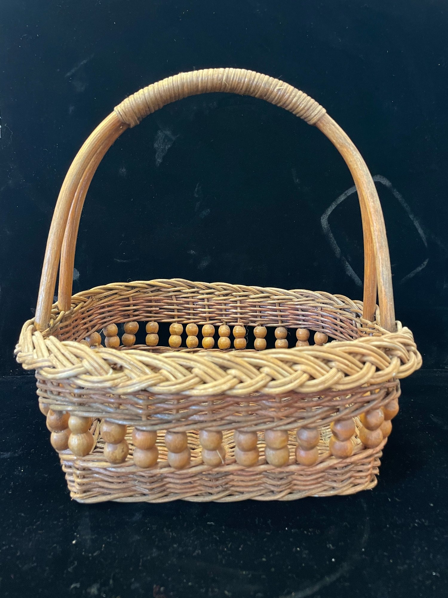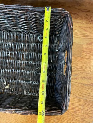 Six assorted wicker baskets of various sizes and shapes.