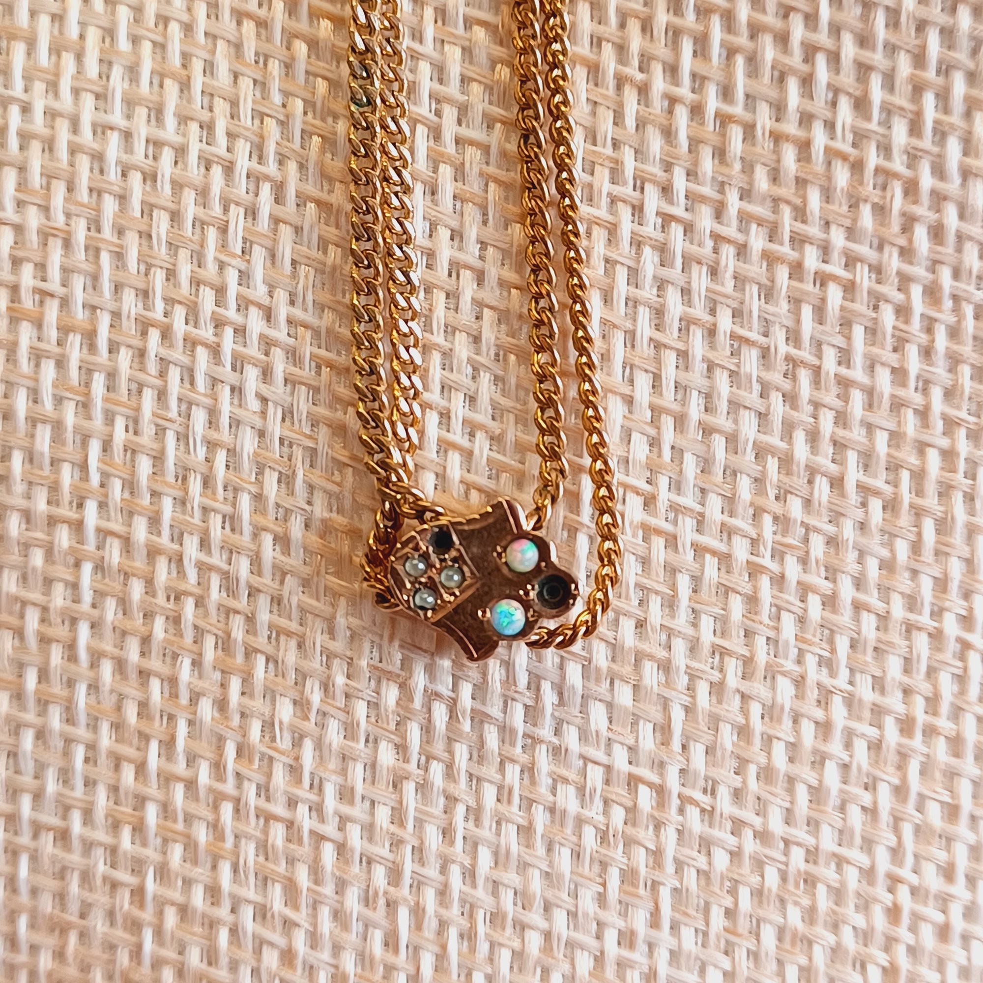 Watch chain has a hampsa slide with seed opals; *2 missing