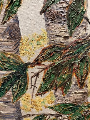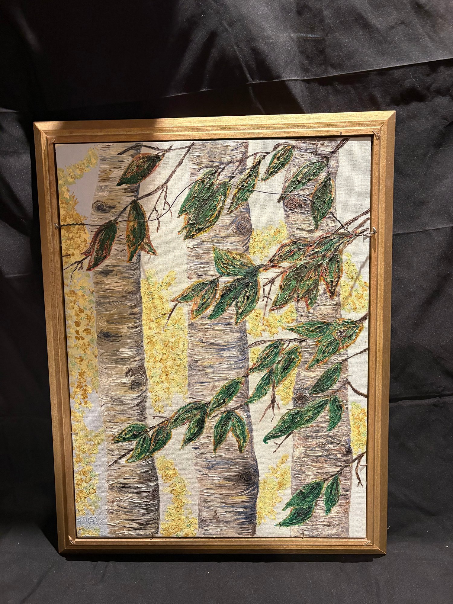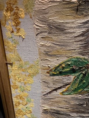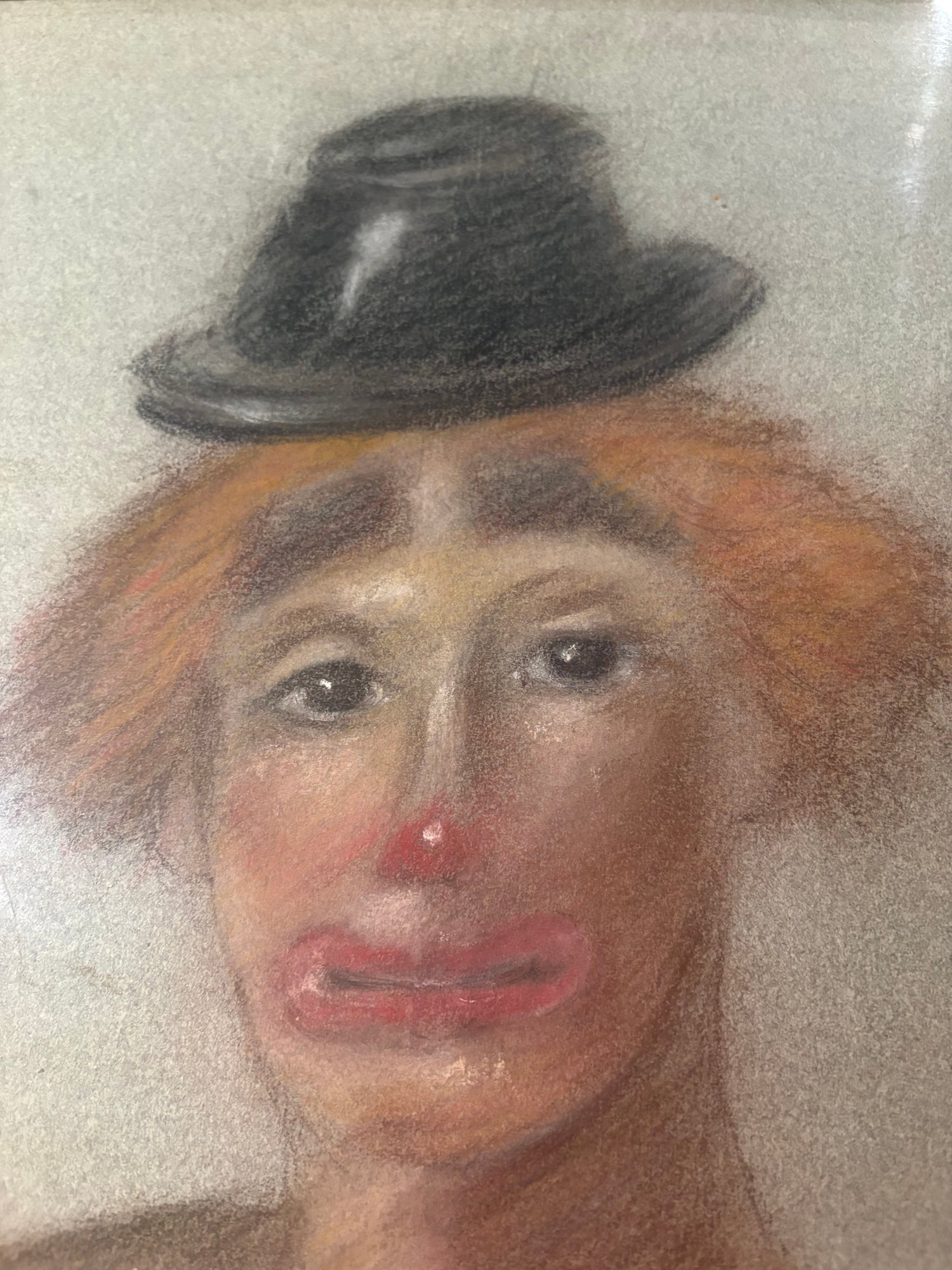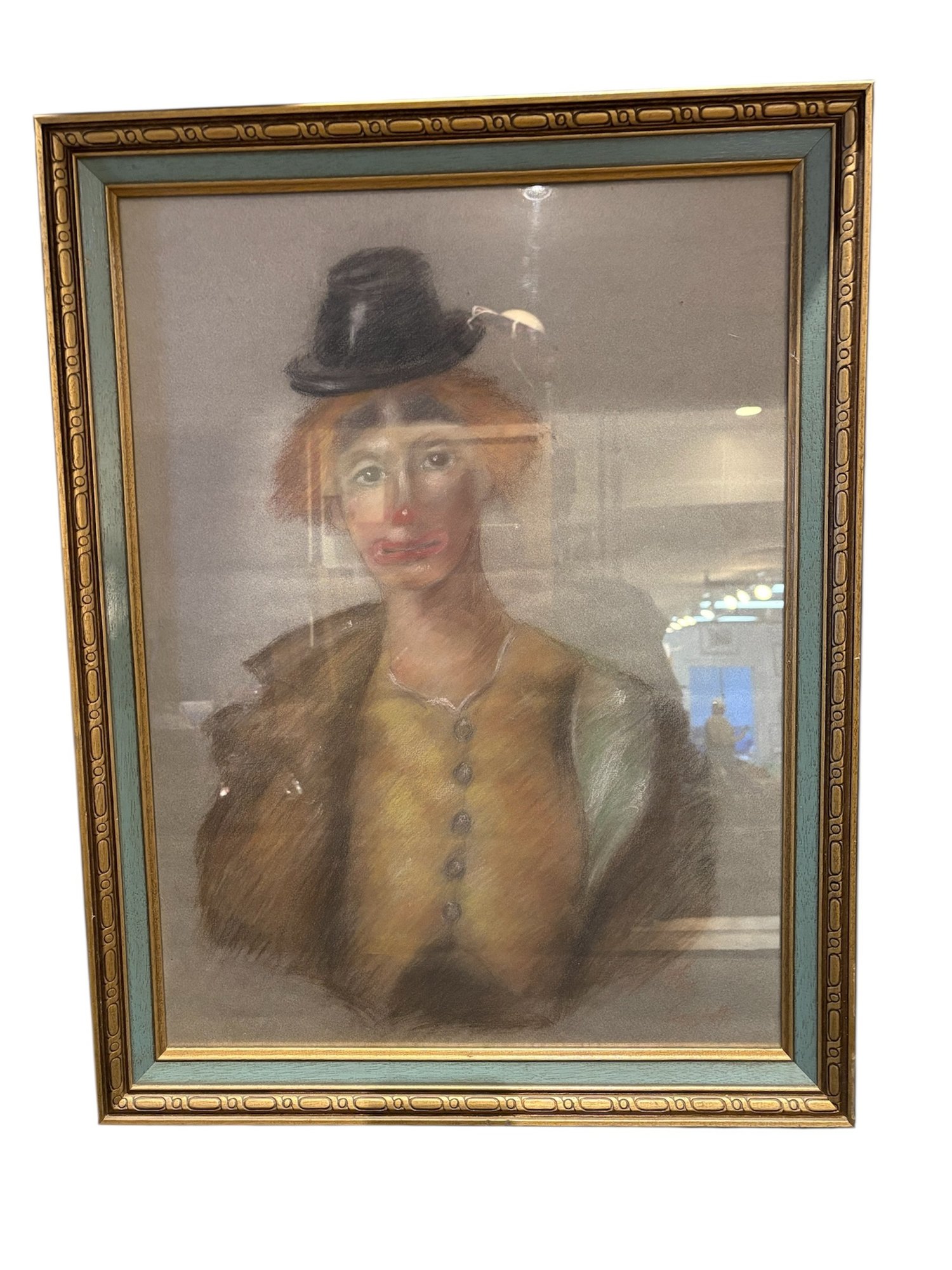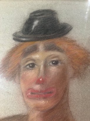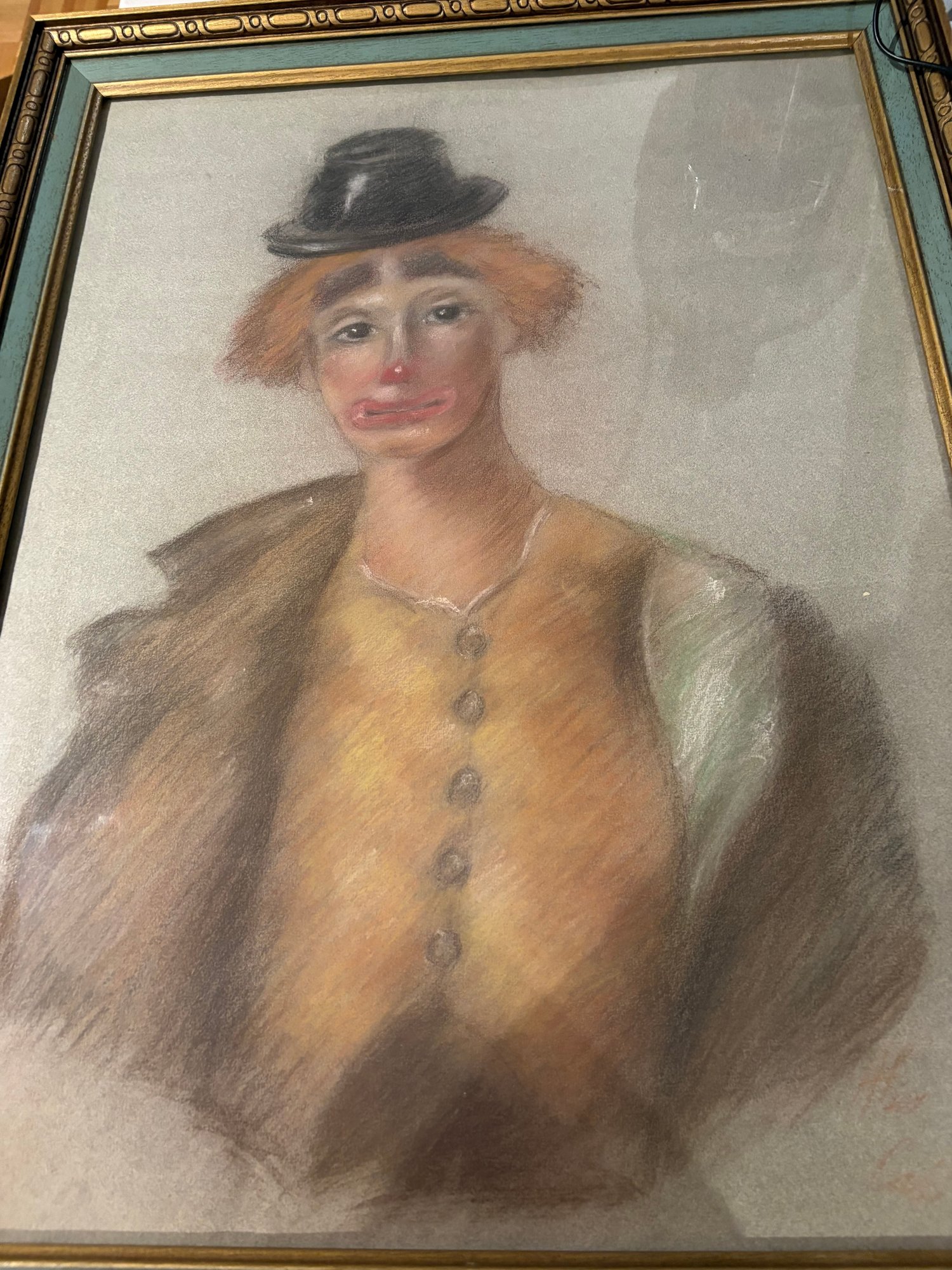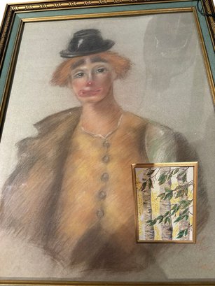 Two sided original art pastel of a clown. There’s some chipping on the frame see pictures and the other side is birch trees acrylic on canvas. 27 by 21