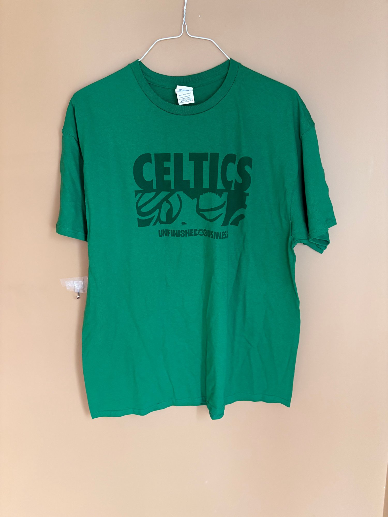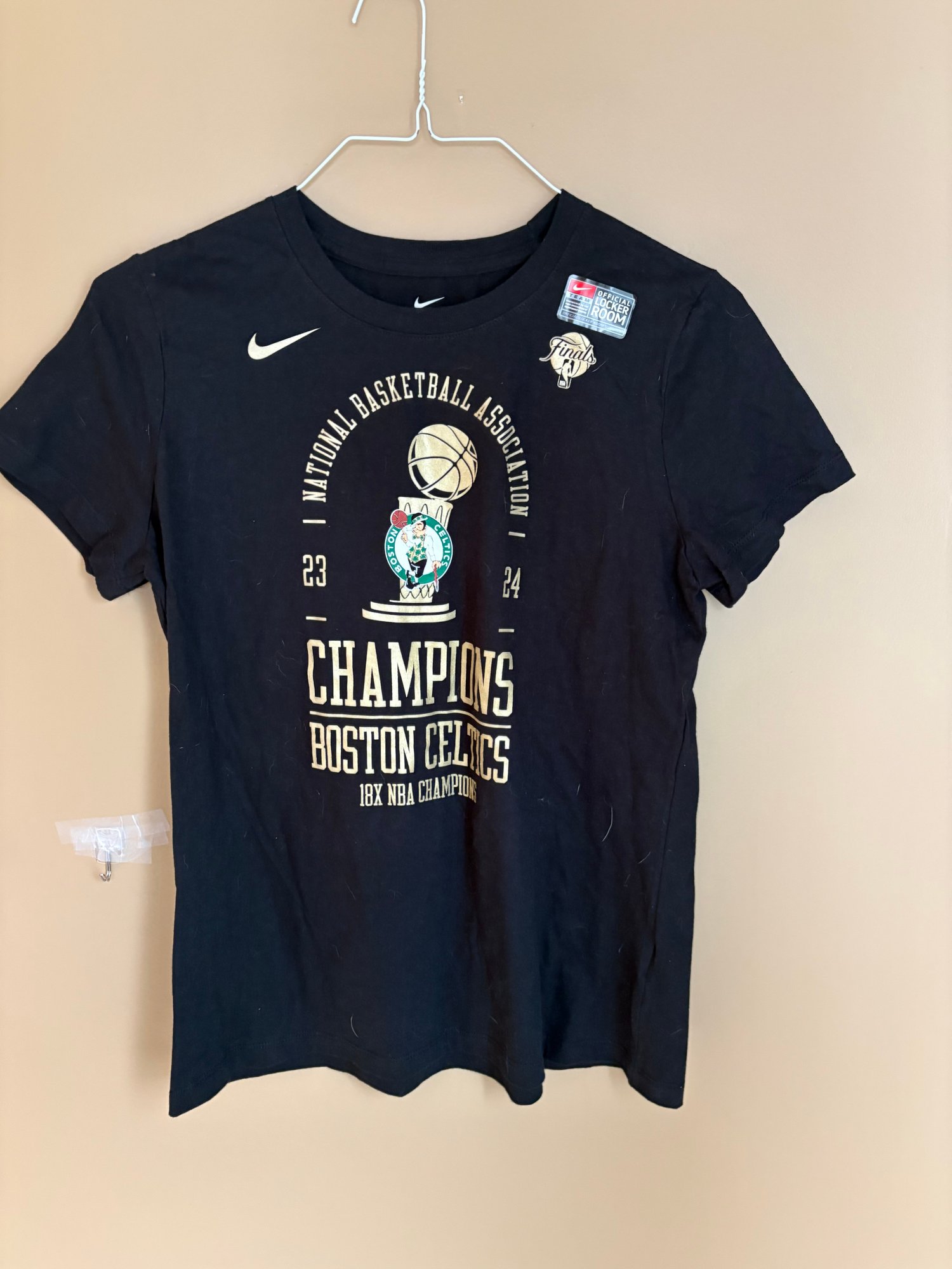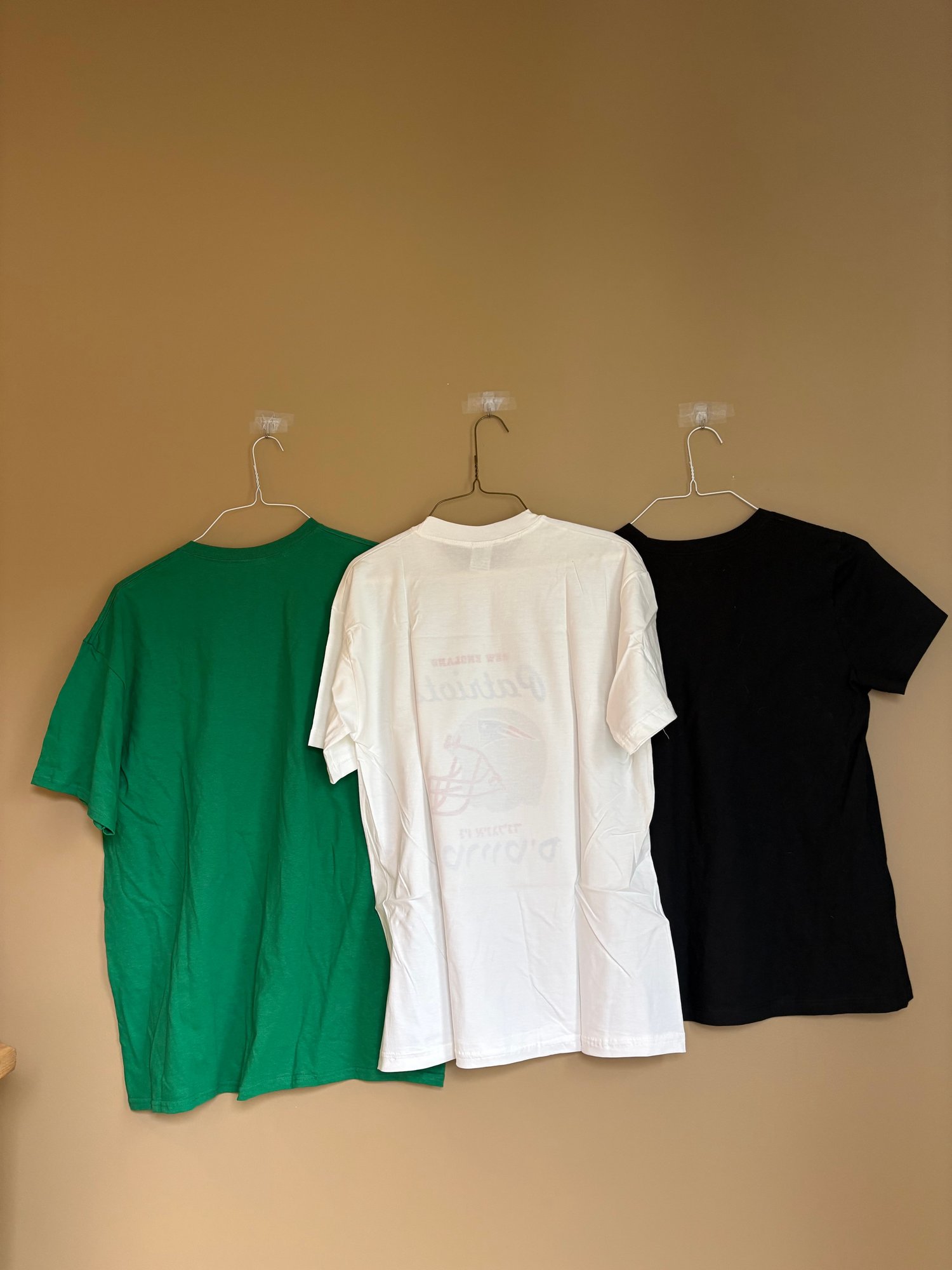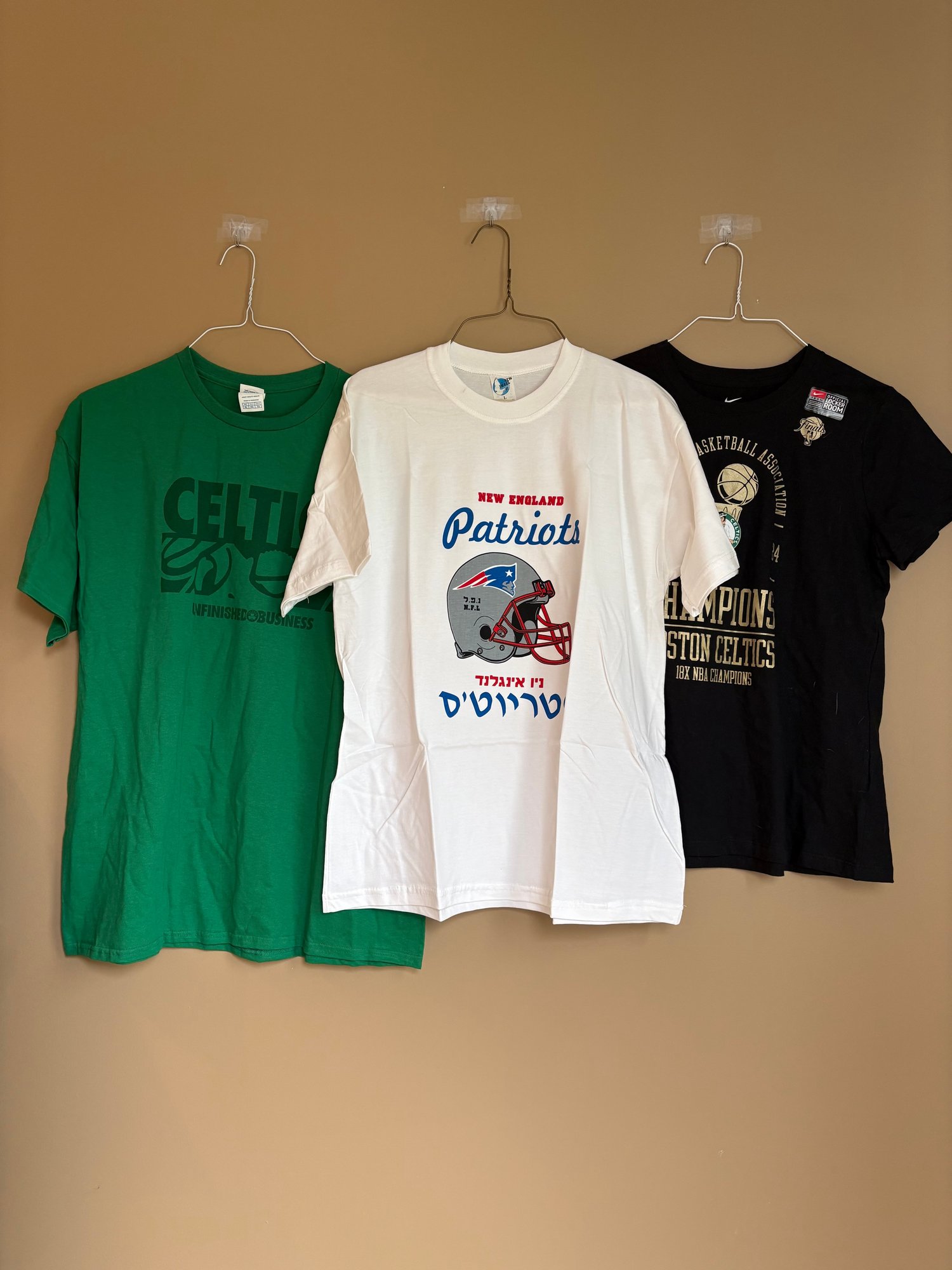 Three sports T-shirts black Nike one is large. The white patriot shirt never worn size large the Nike one also looks un worn but the third is a green Celtics team. It’s extra large and it has been worn.