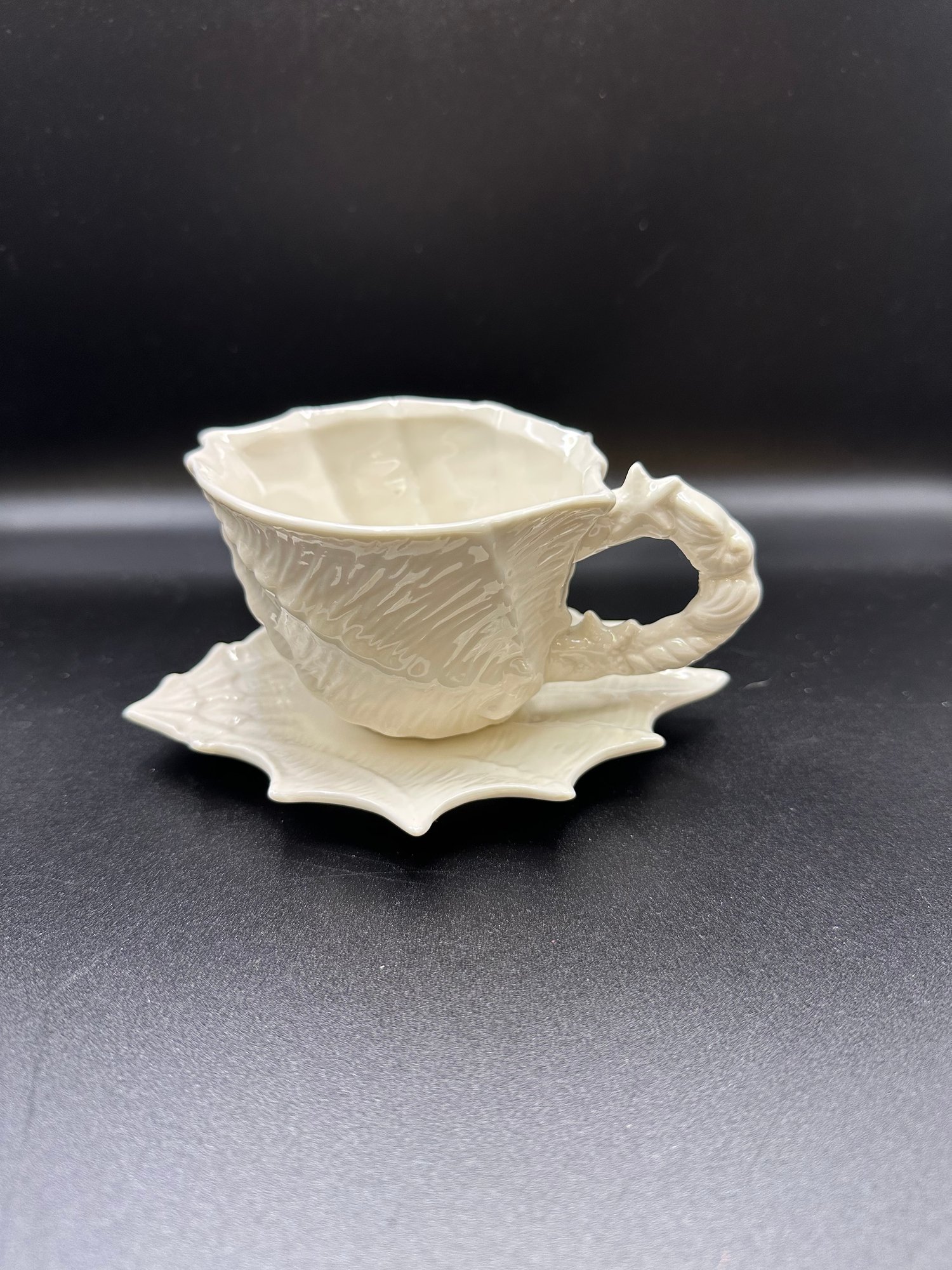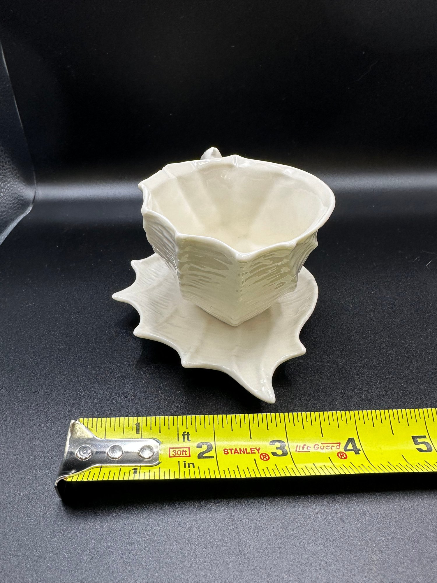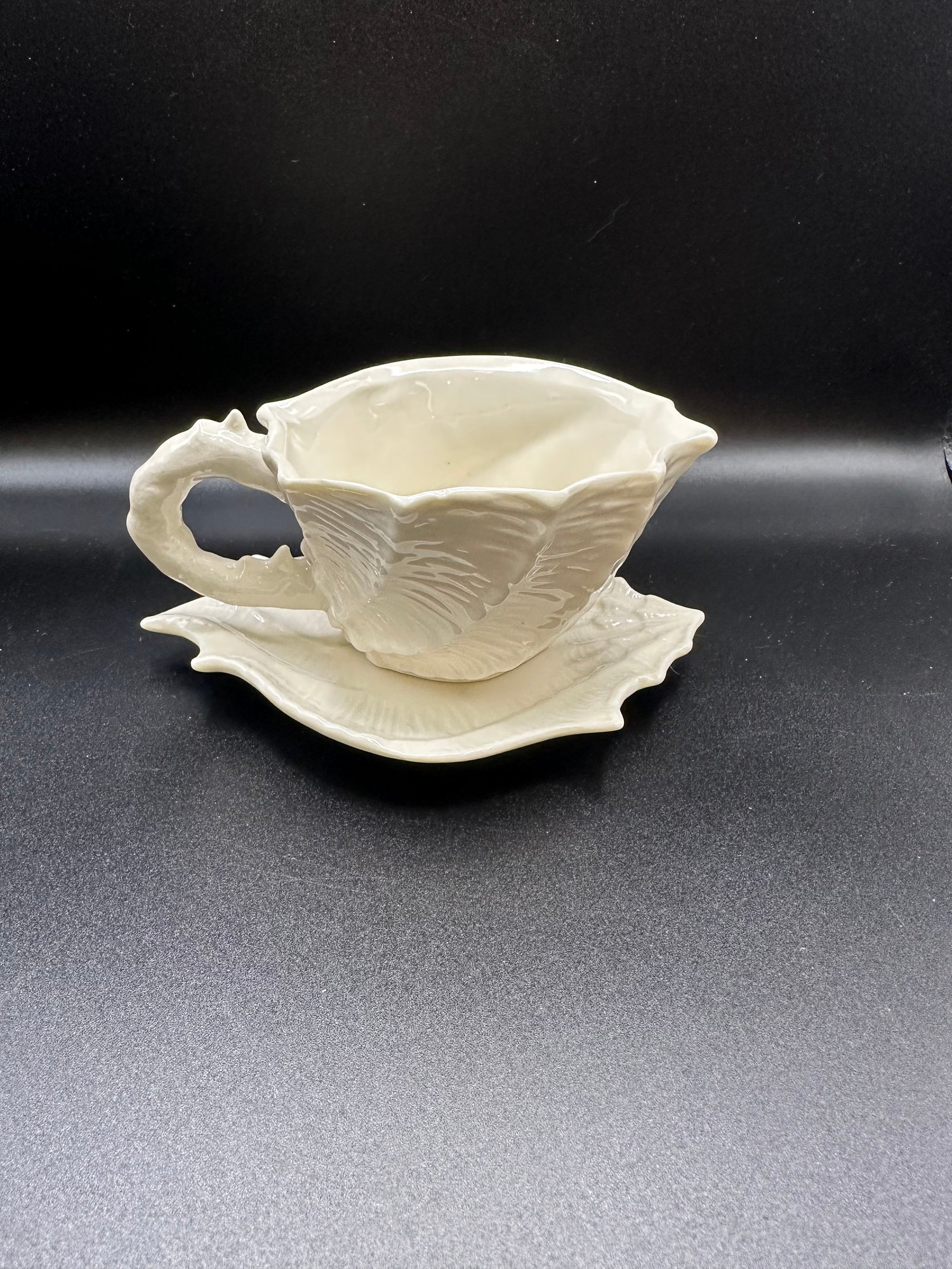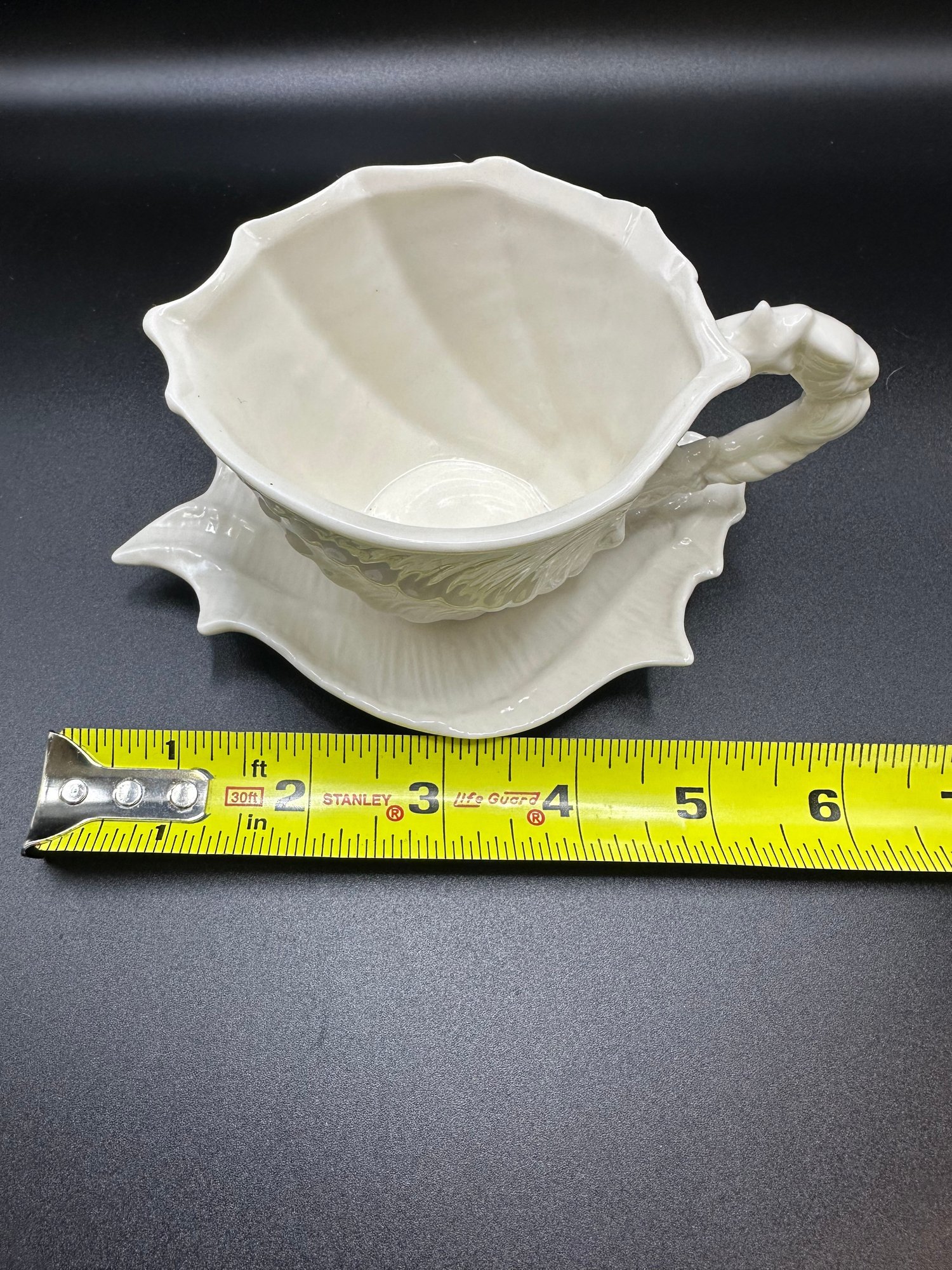 Dimensions tea cup 5 inches long. Saucer 6 inches long