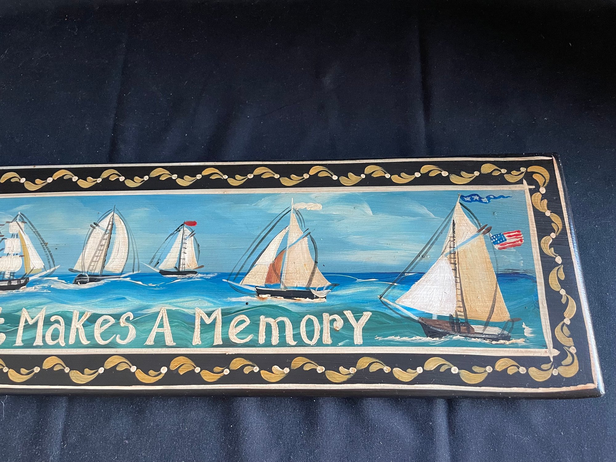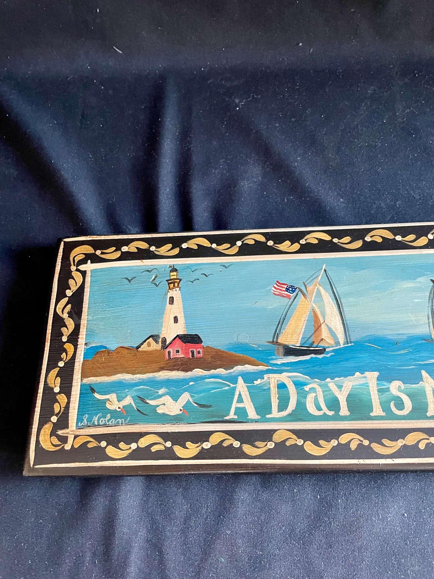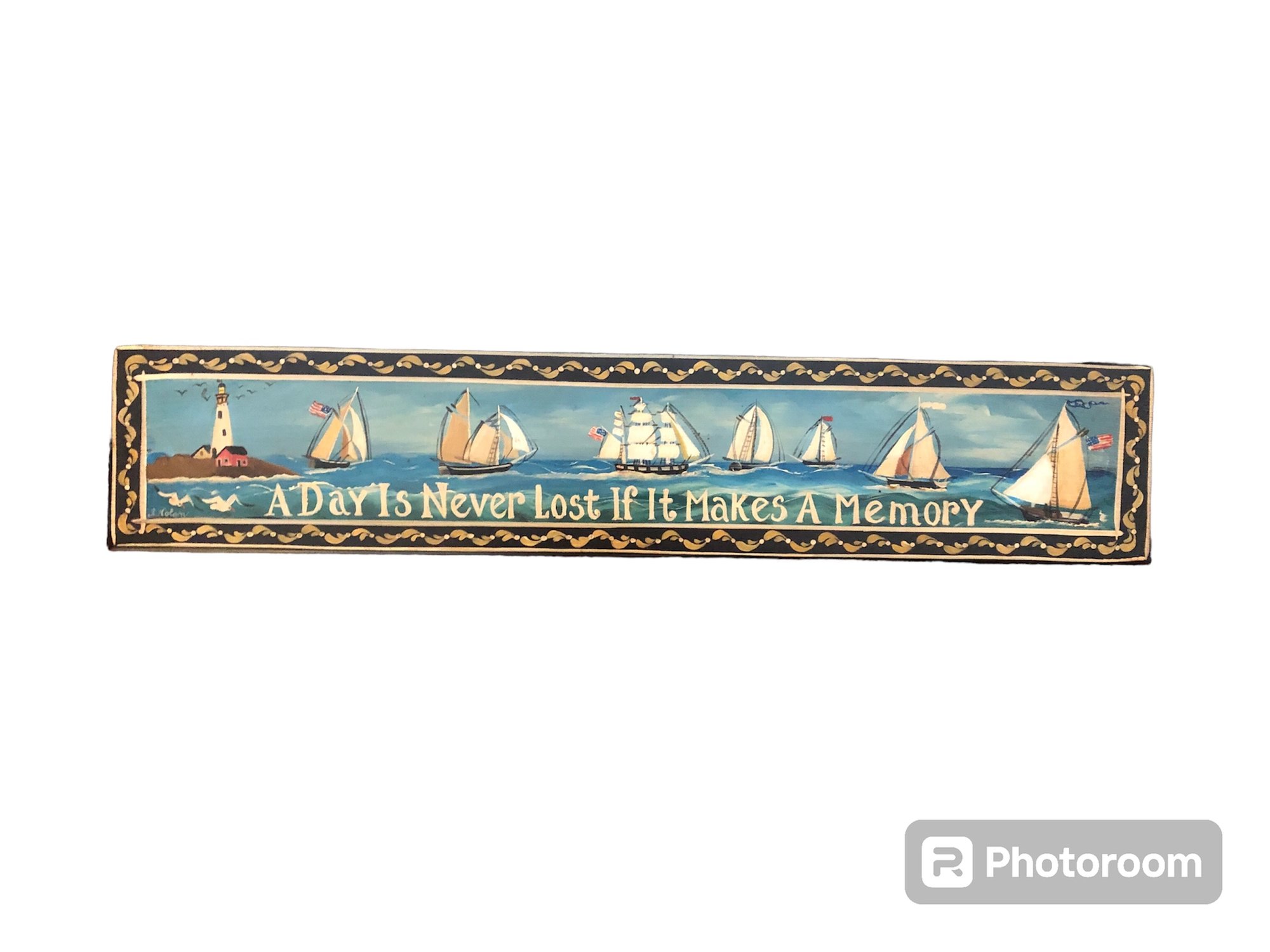 Wood-painted sailboats and lighthouse with nautical wood boarder; hanging horizontal piece