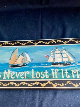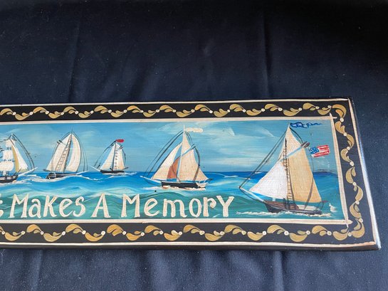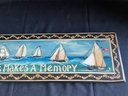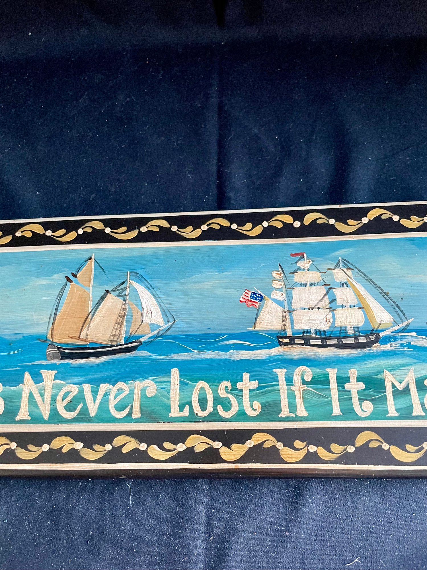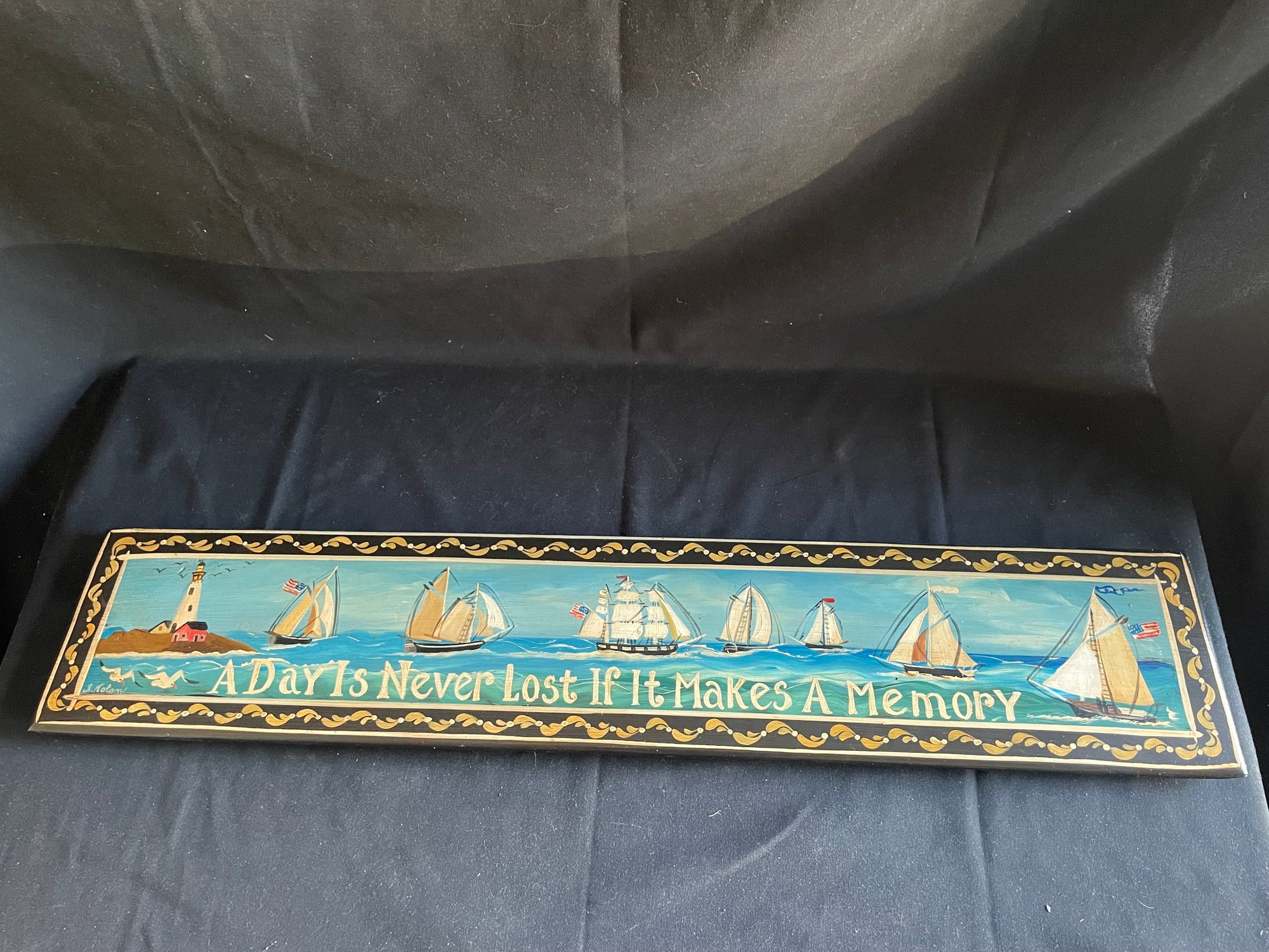 Wood-painted sailboats and lighthouse with nautical wood boarder; hanging horizontal piece