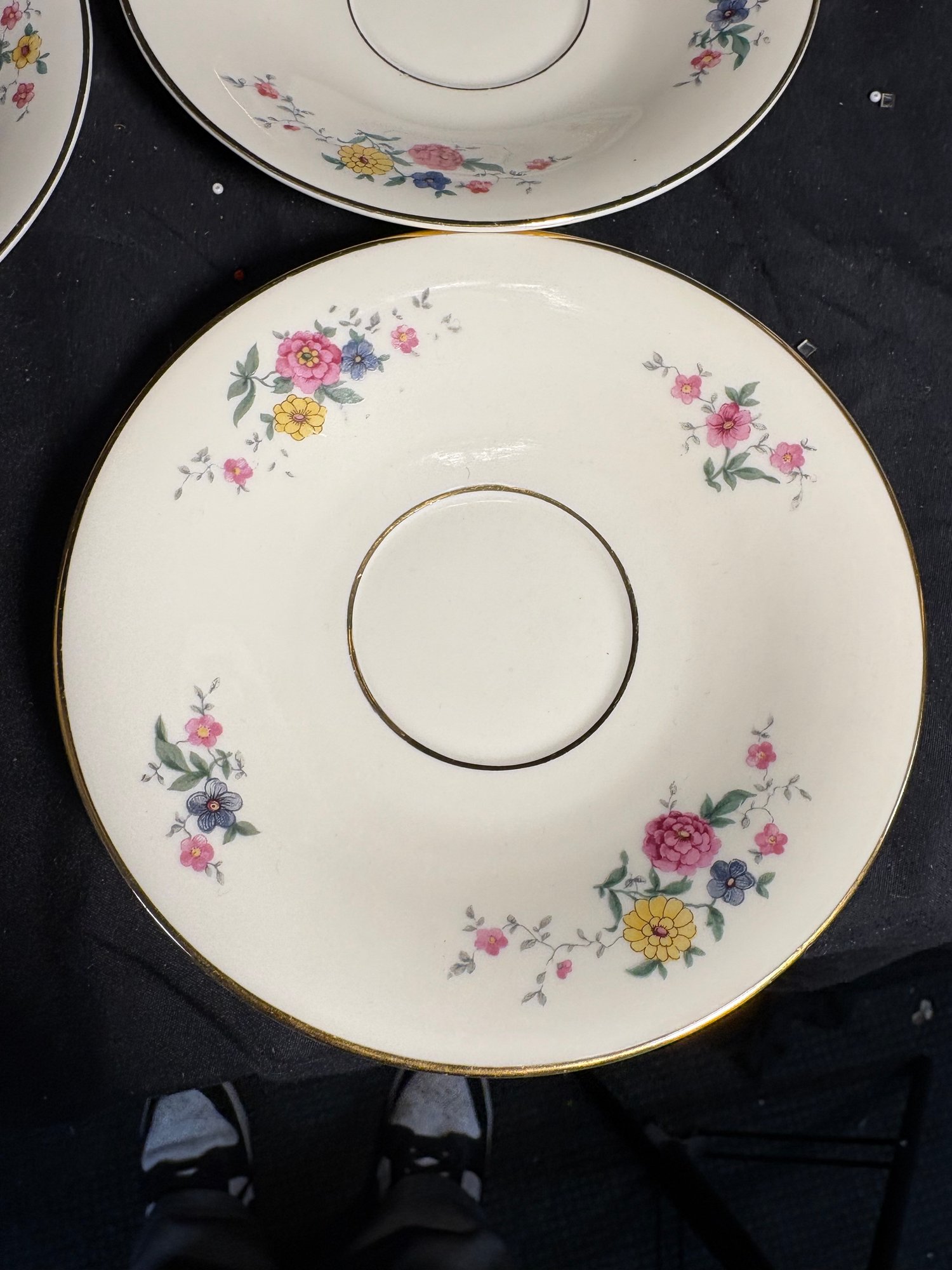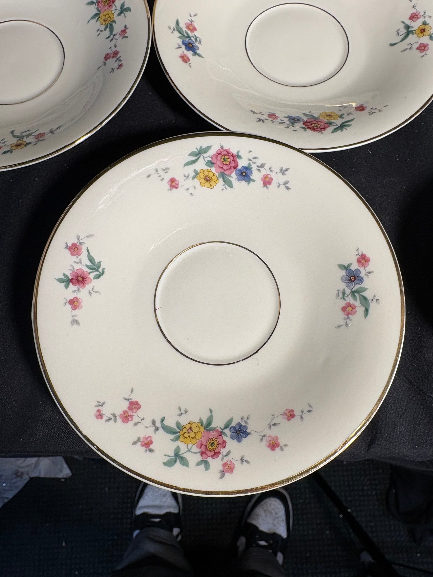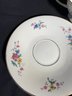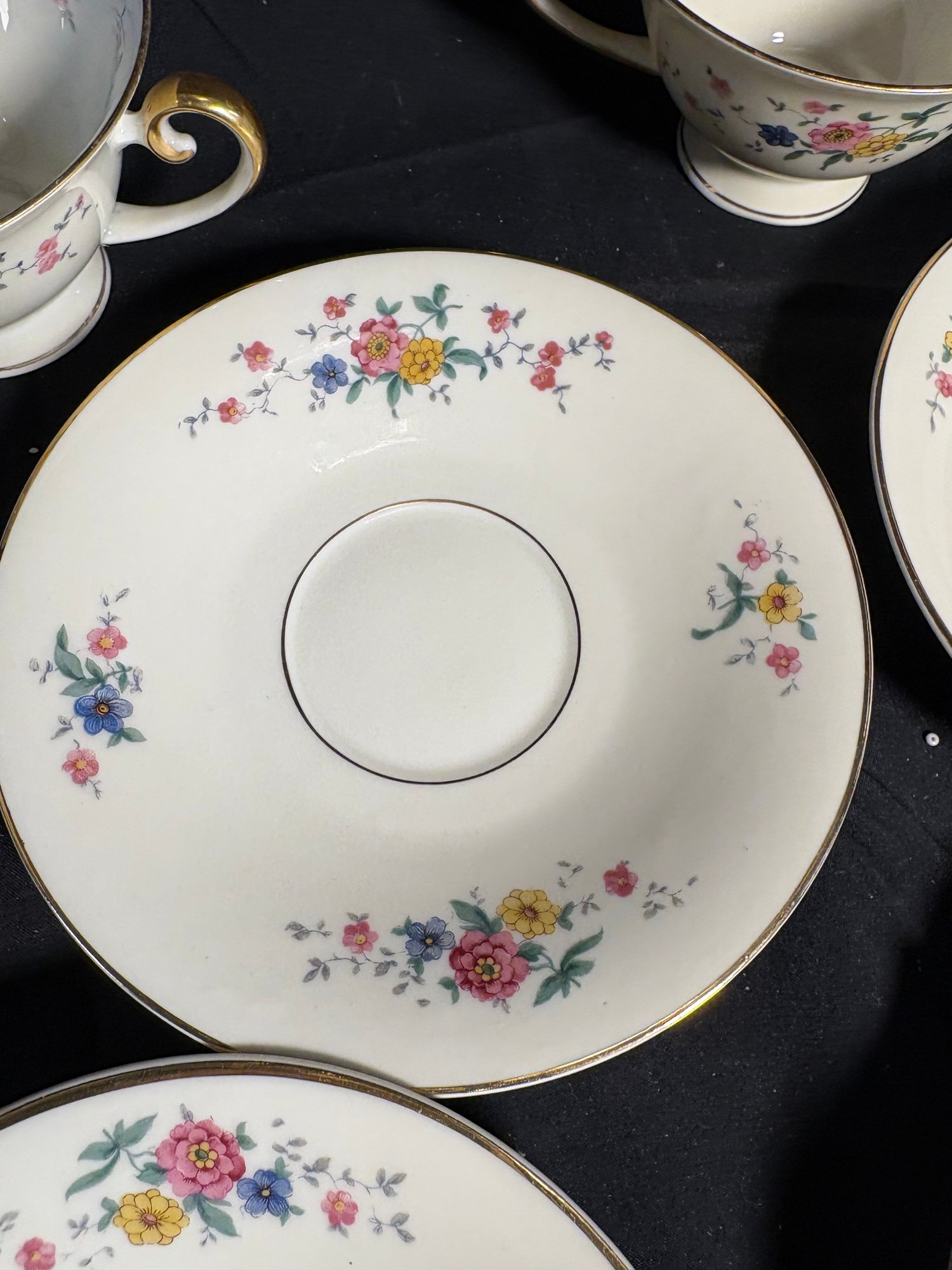 Dimensions saucers approximately 6 inches in diameter. Tea cups 4 inches in diameter and 2.25 inches tall. Total item count 7