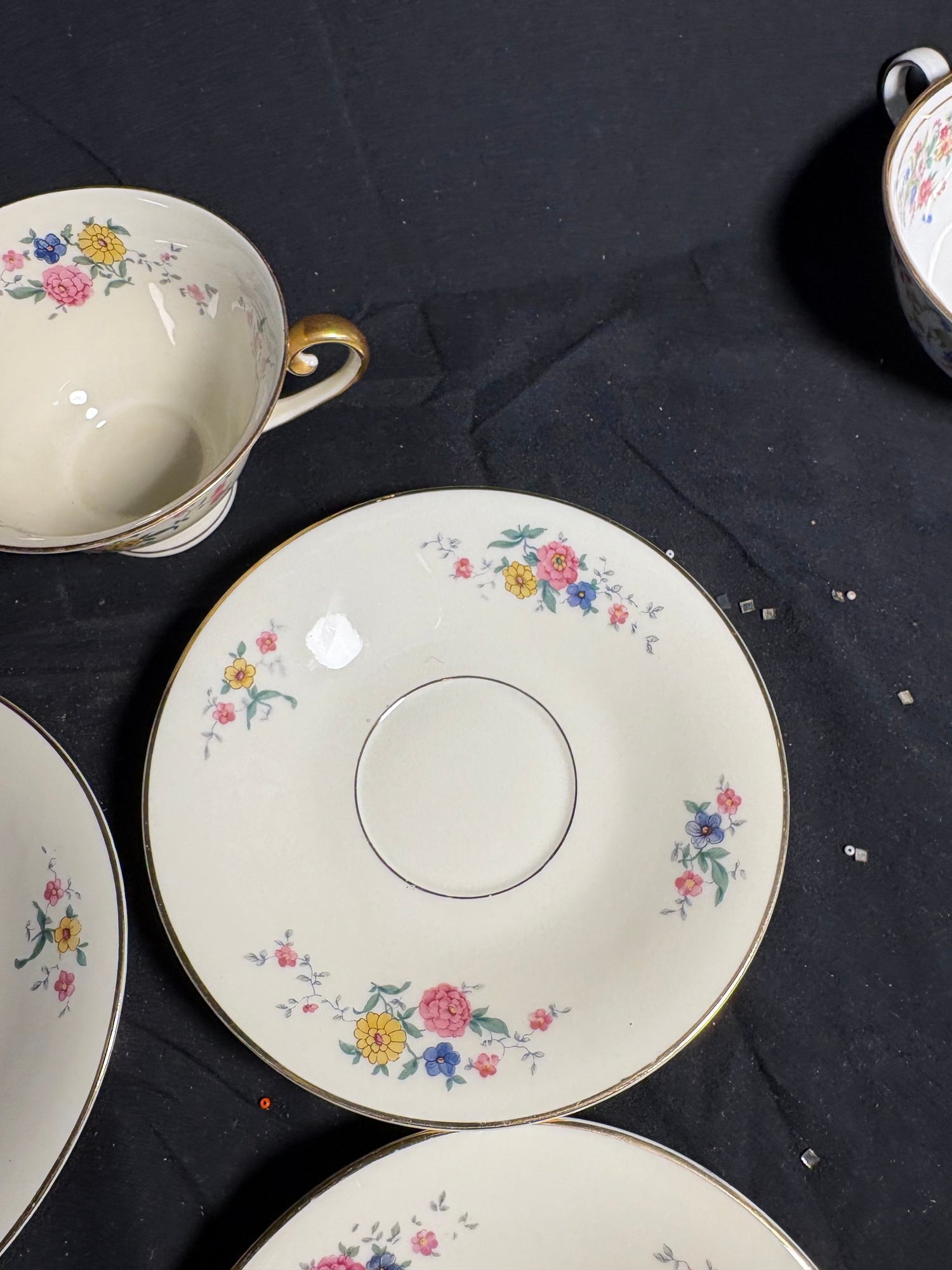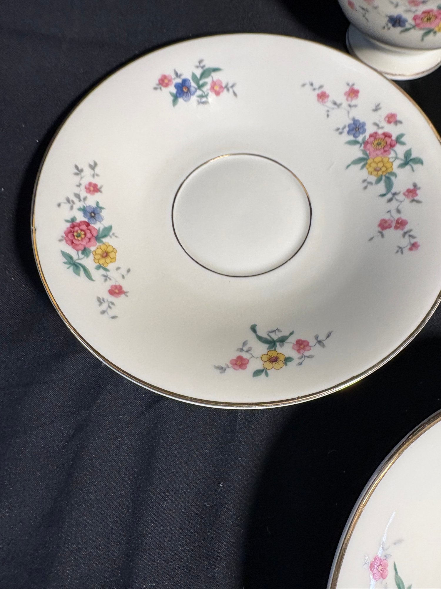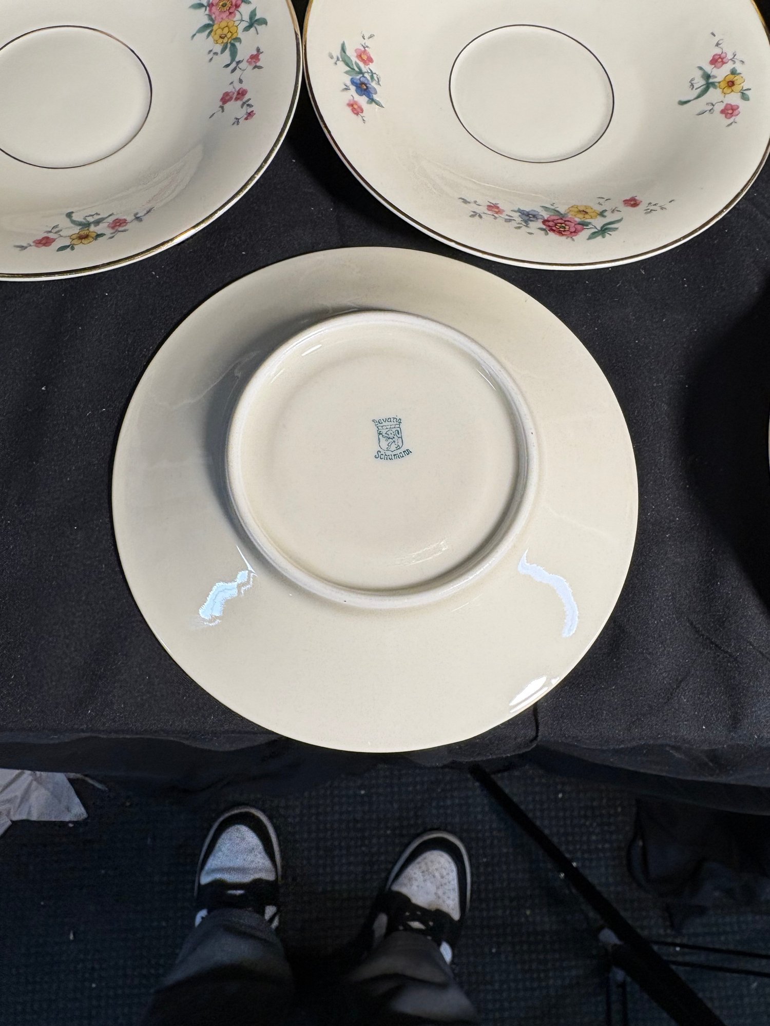 Dimensions saucers approximately 6 inches in diameter. Tea cups 4 inches in diameter and 2.25 inches tall. Total item count 7