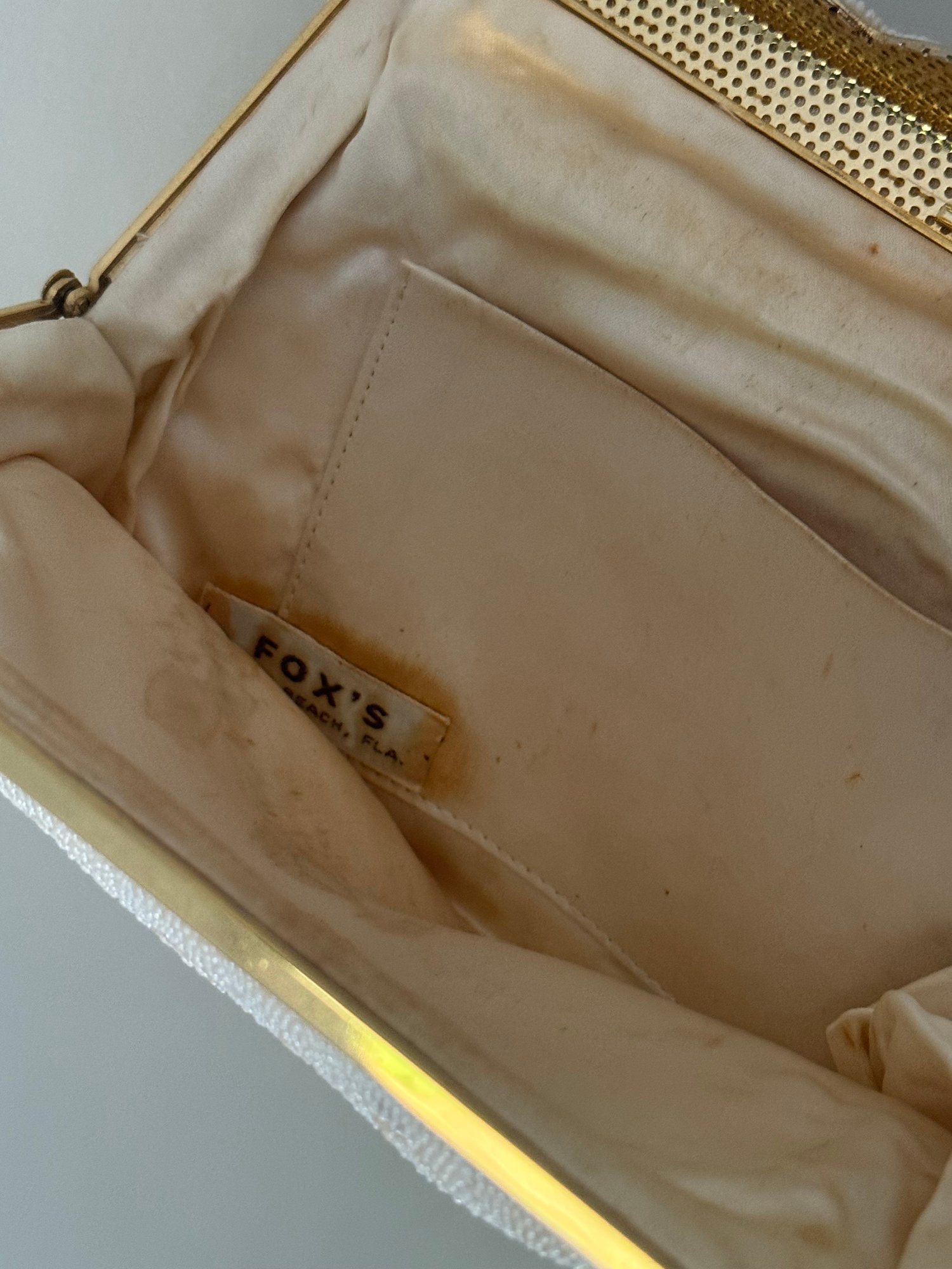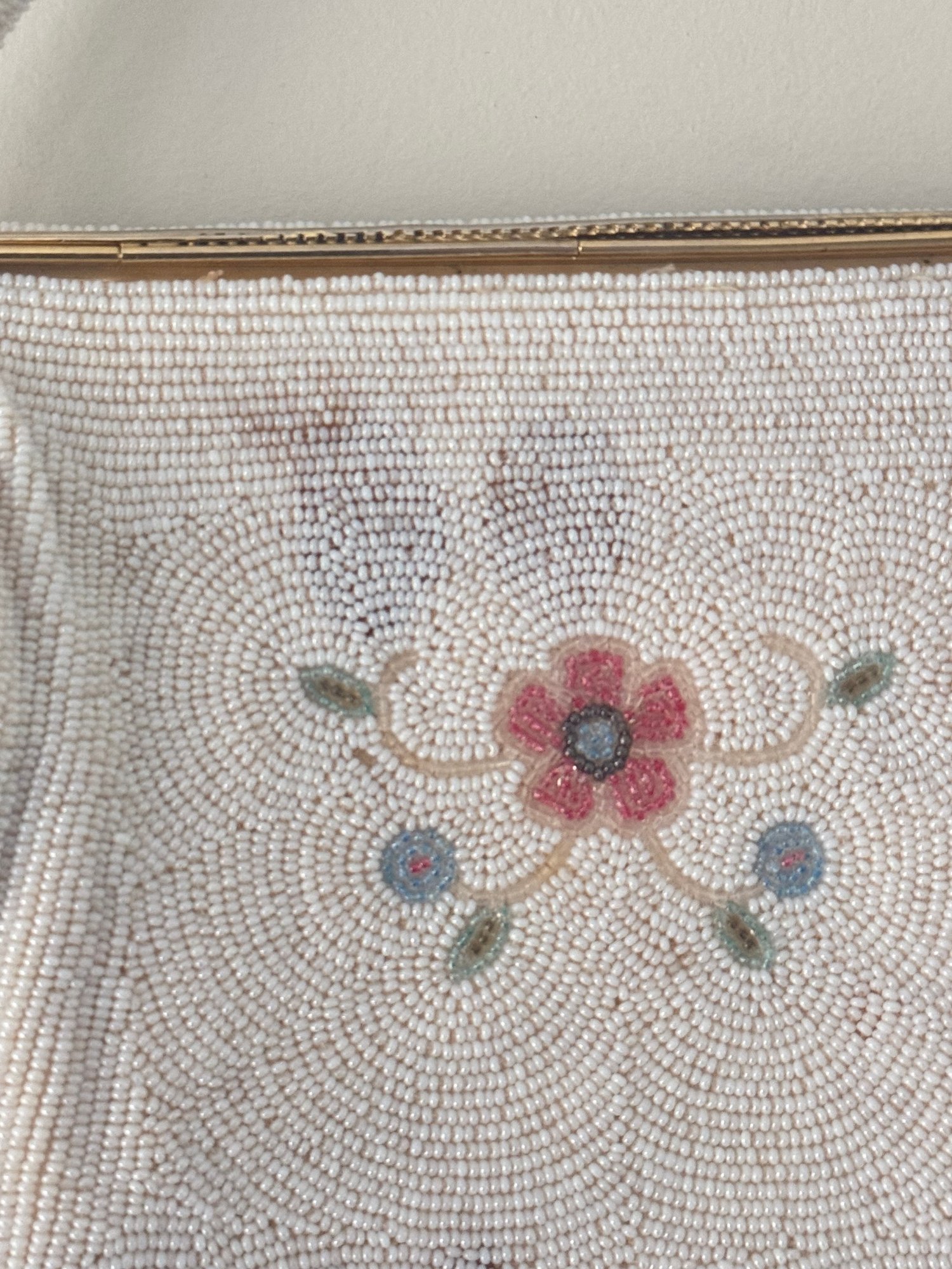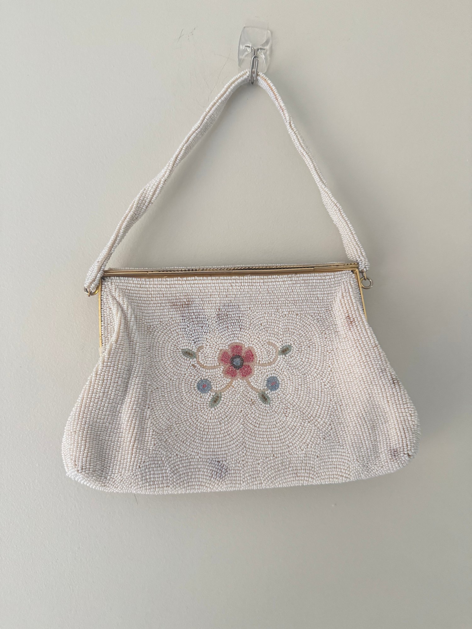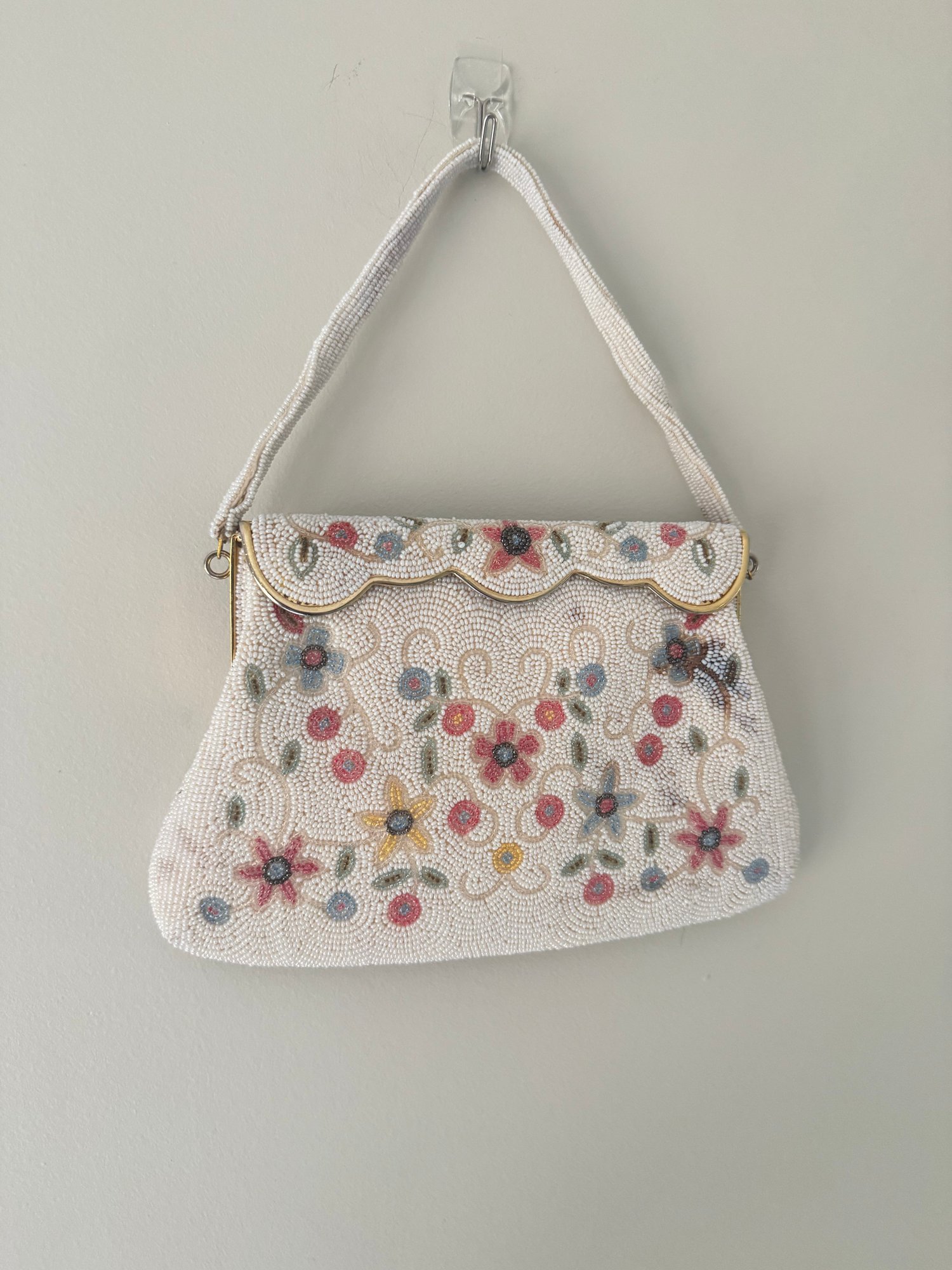 Style: White, floral beaded clutch, magnet closure