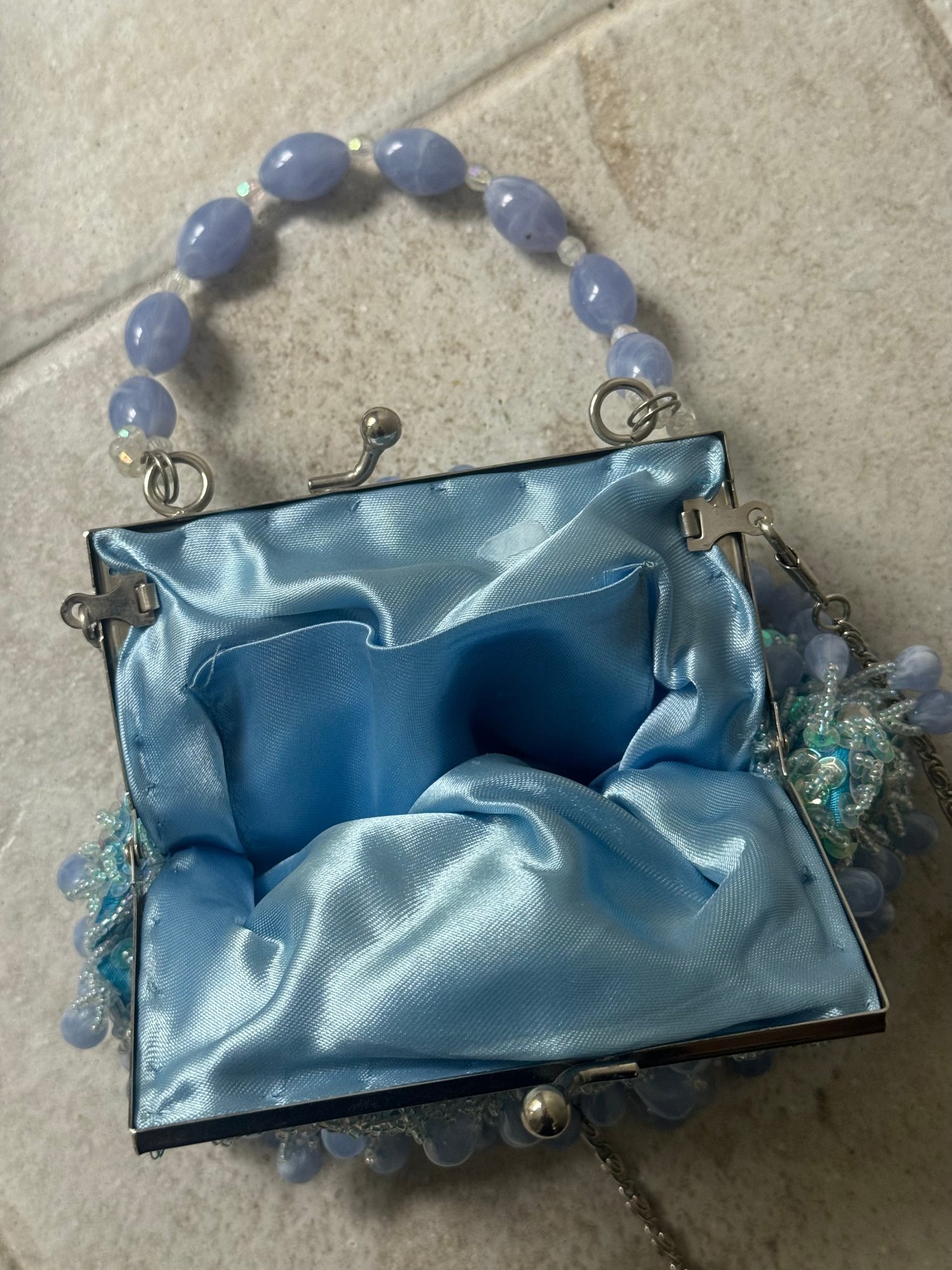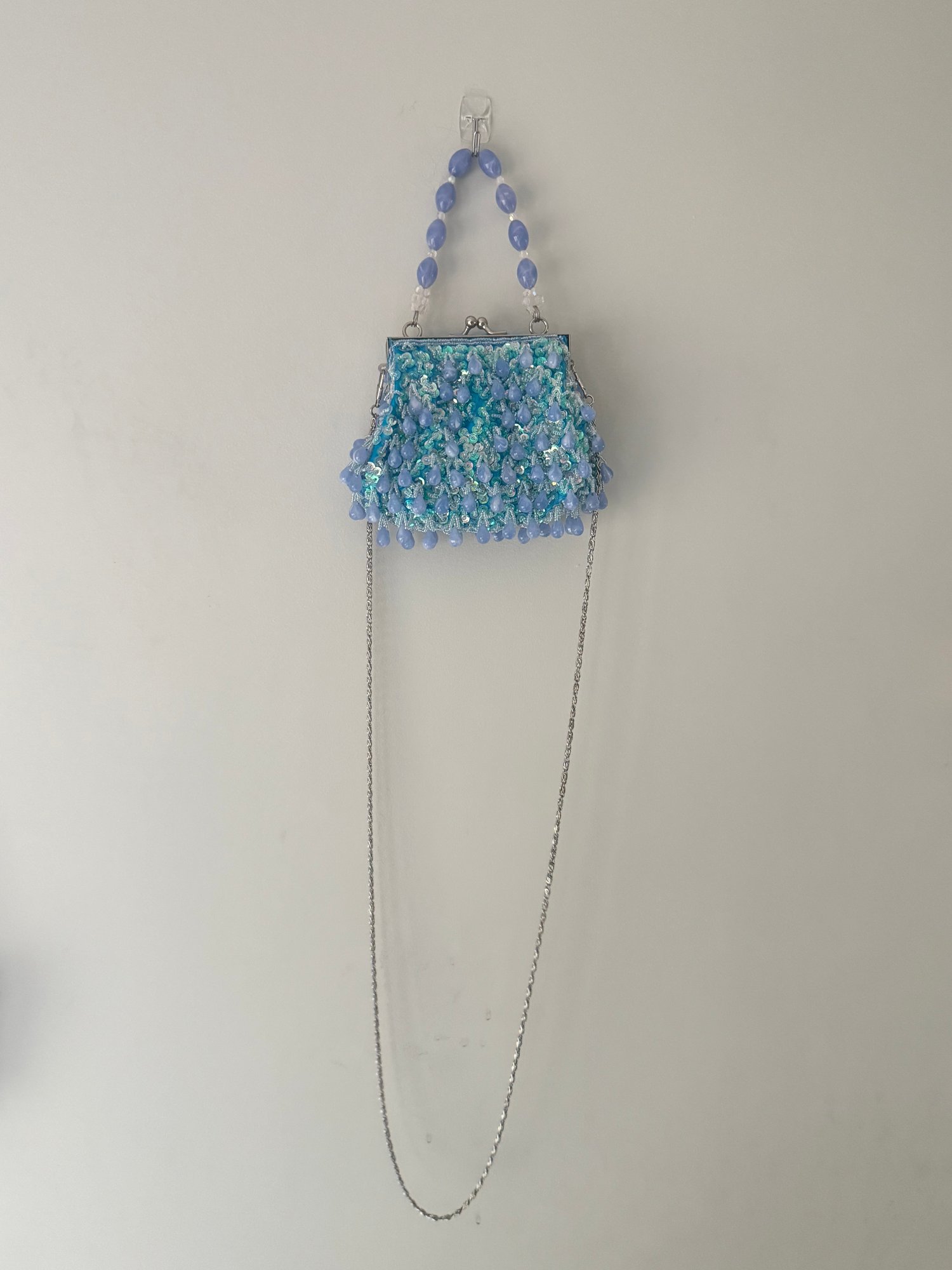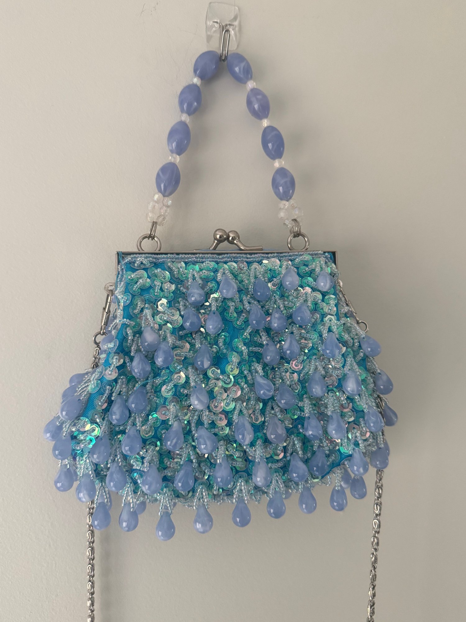 Style: Blue, mermaid vibes, beaded bag with crossbody chain and short handle