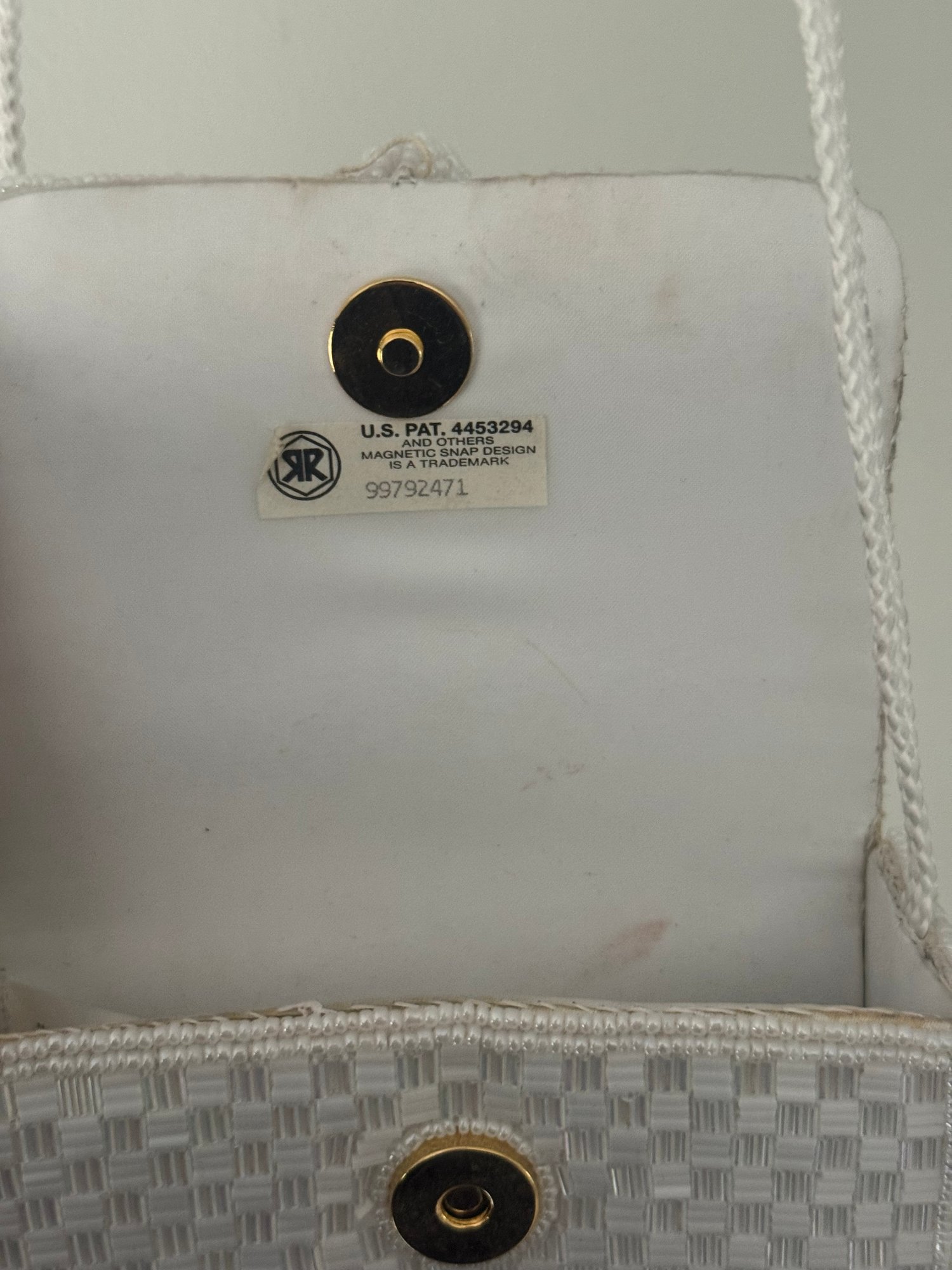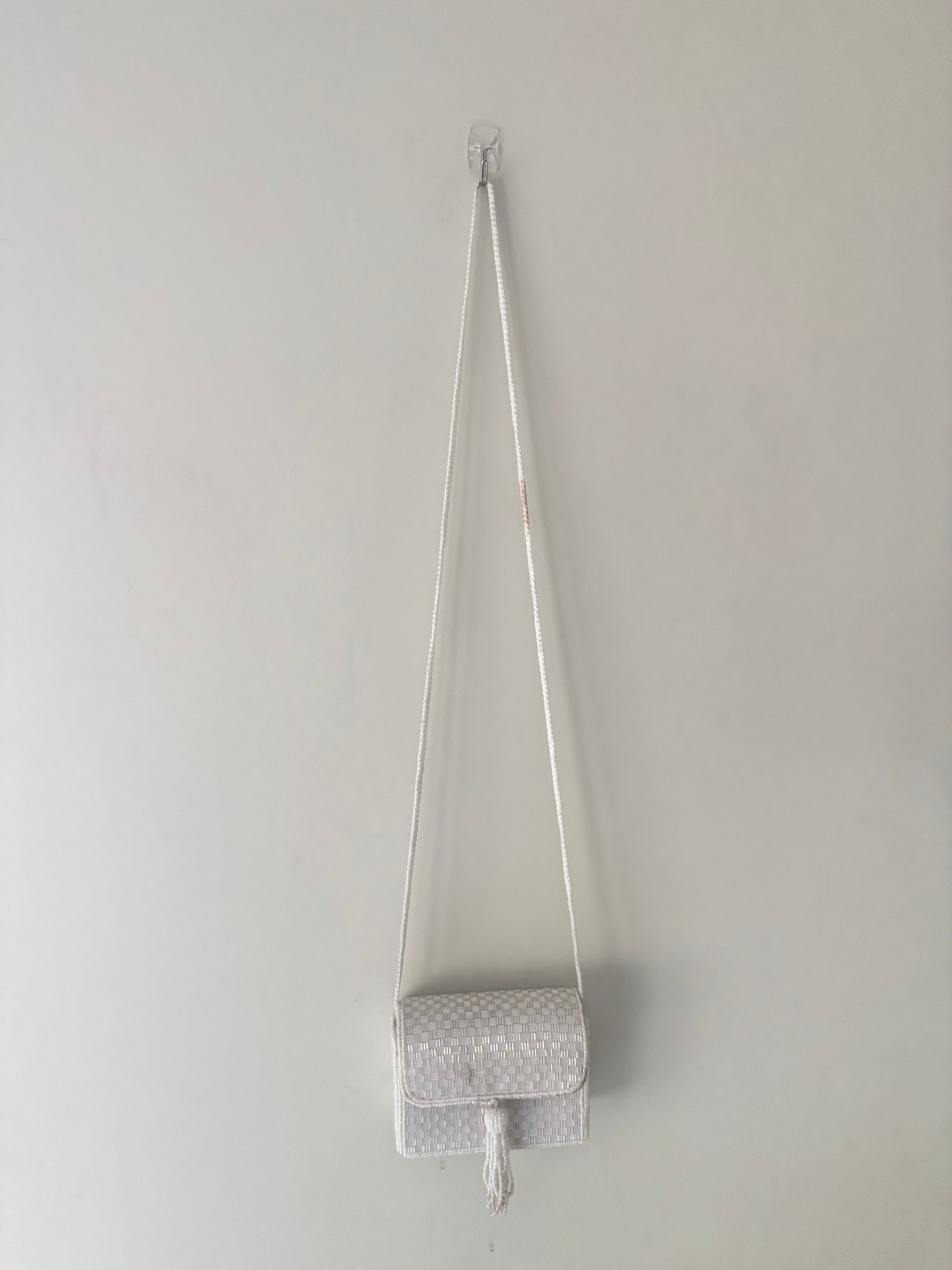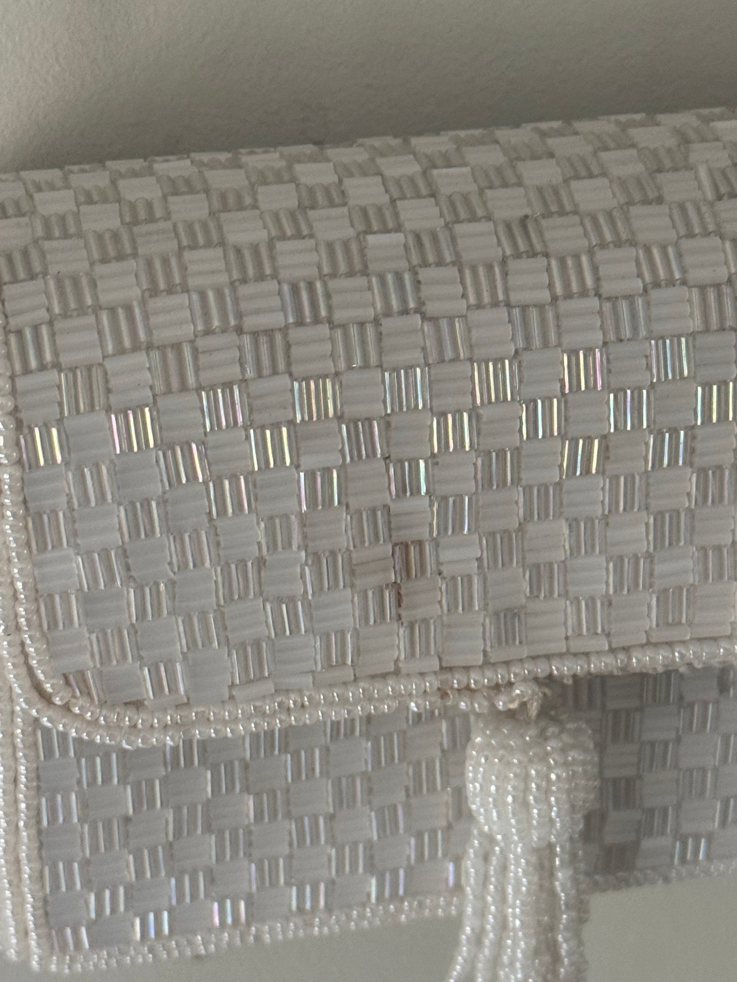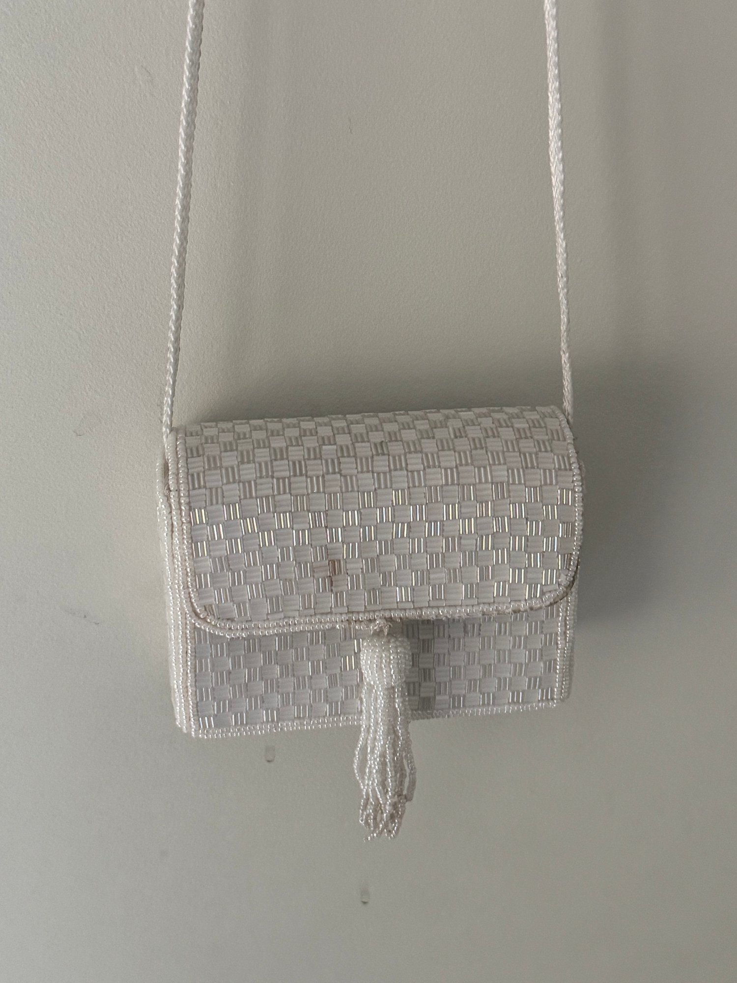 Style: White Beaded crossbody bag with button closure.