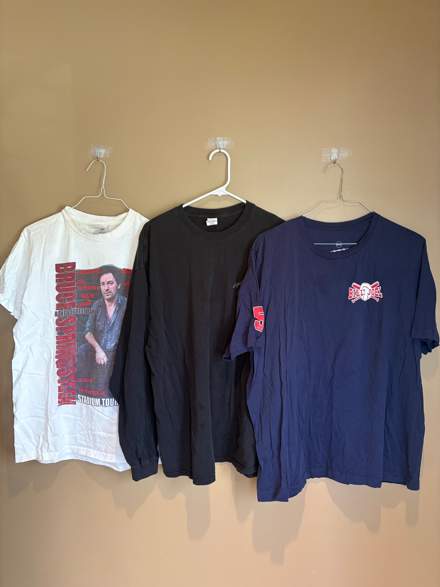 Three concert tees the white Billy Joel one is a large the long sleeve black eagles is a 2X and then the Billy Joel blue tee is a 3X