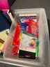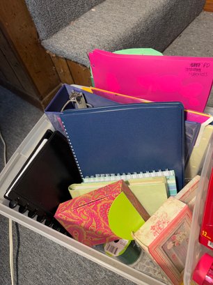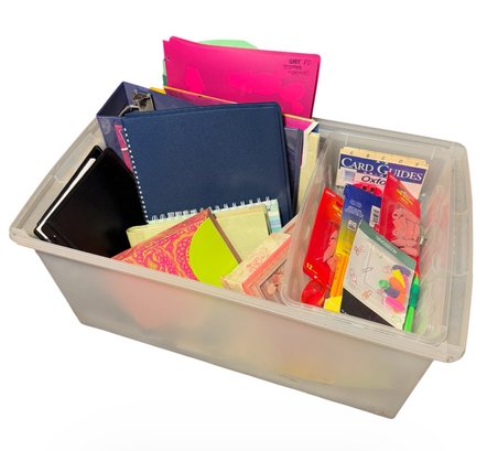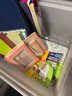 includes an entire bin full of assorted supplies such as erasers, binders, notebooks etc