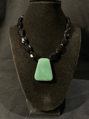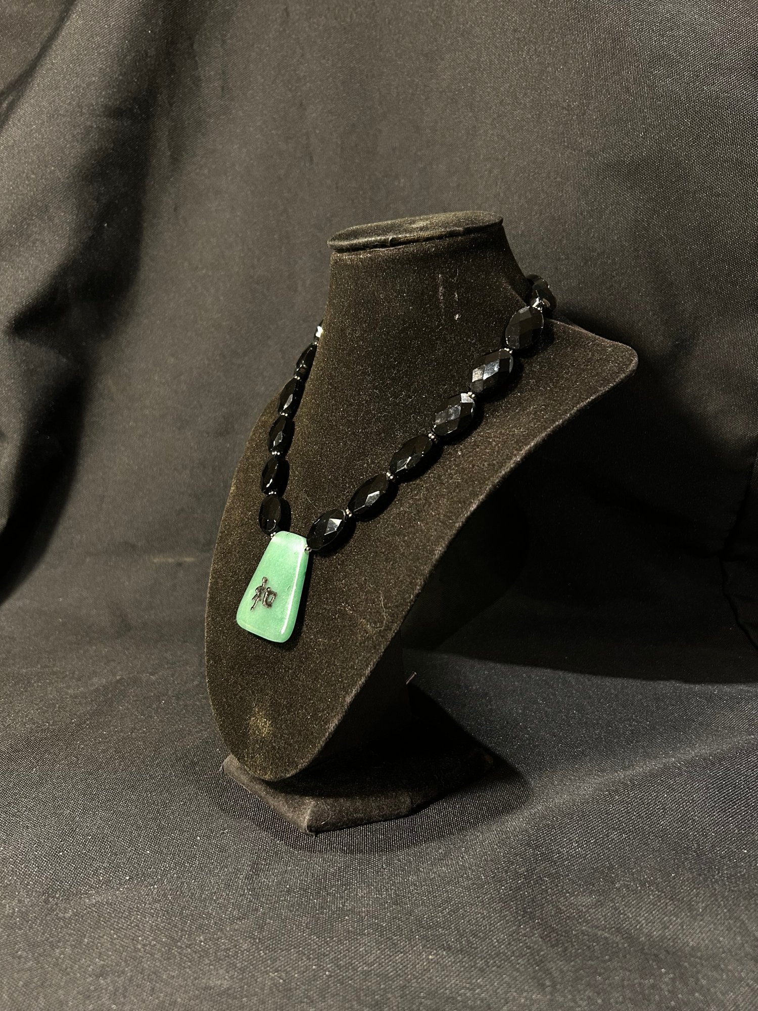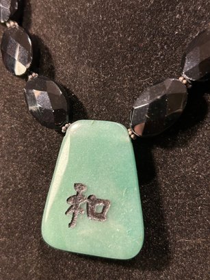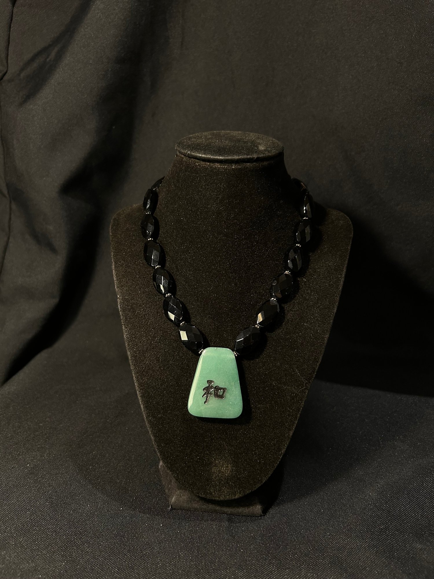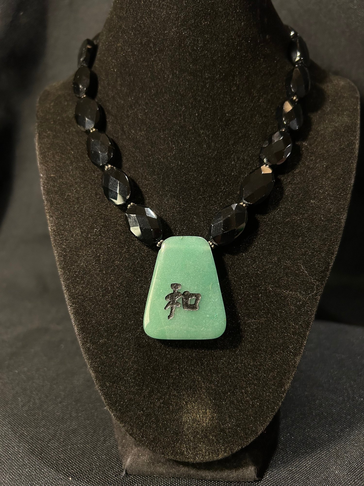 semi precious stones and sterling floral dividers and clasp, asian necklace, jade pendant signifying “peace” or “harmony”