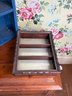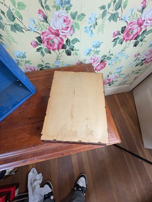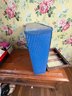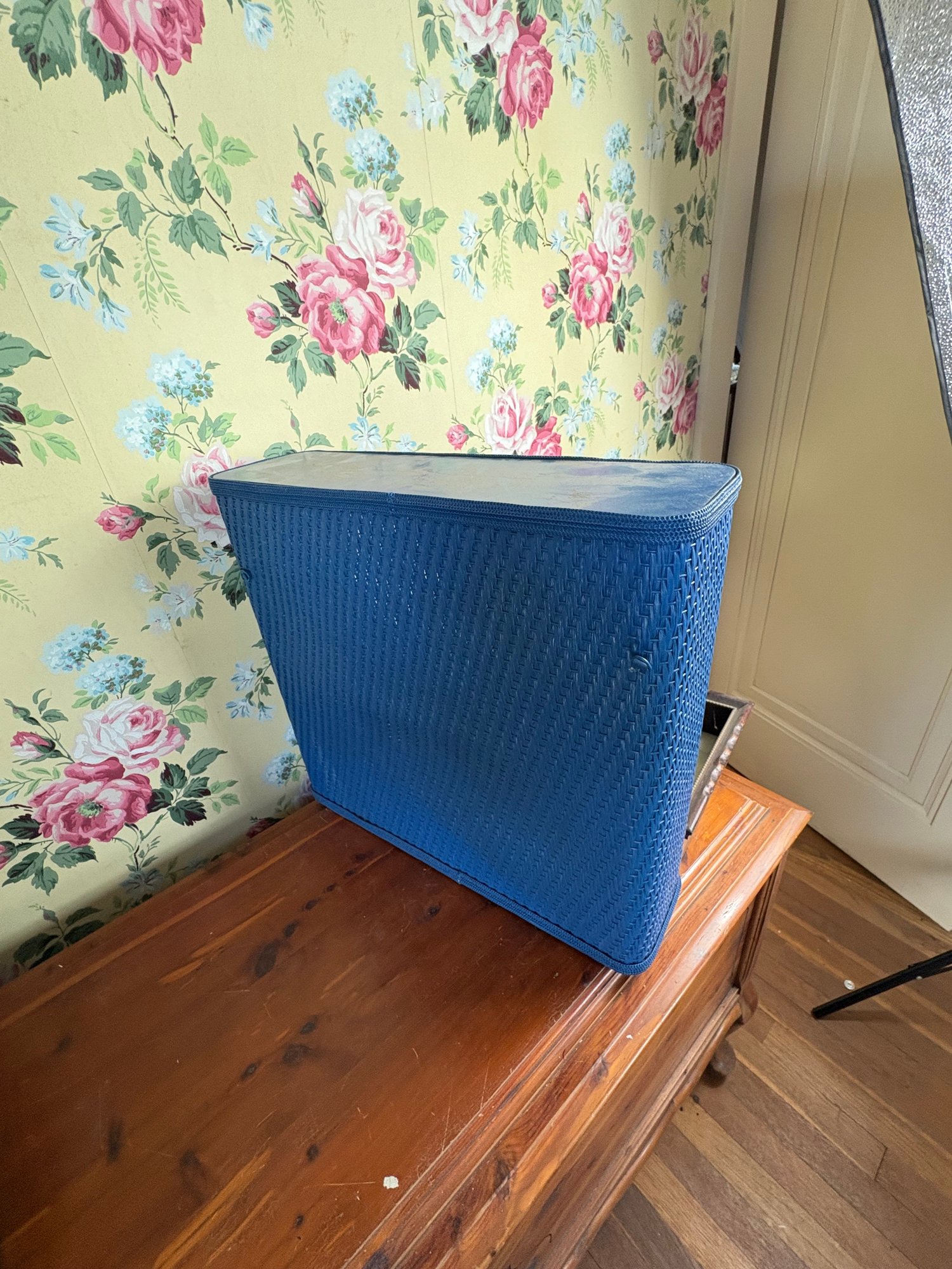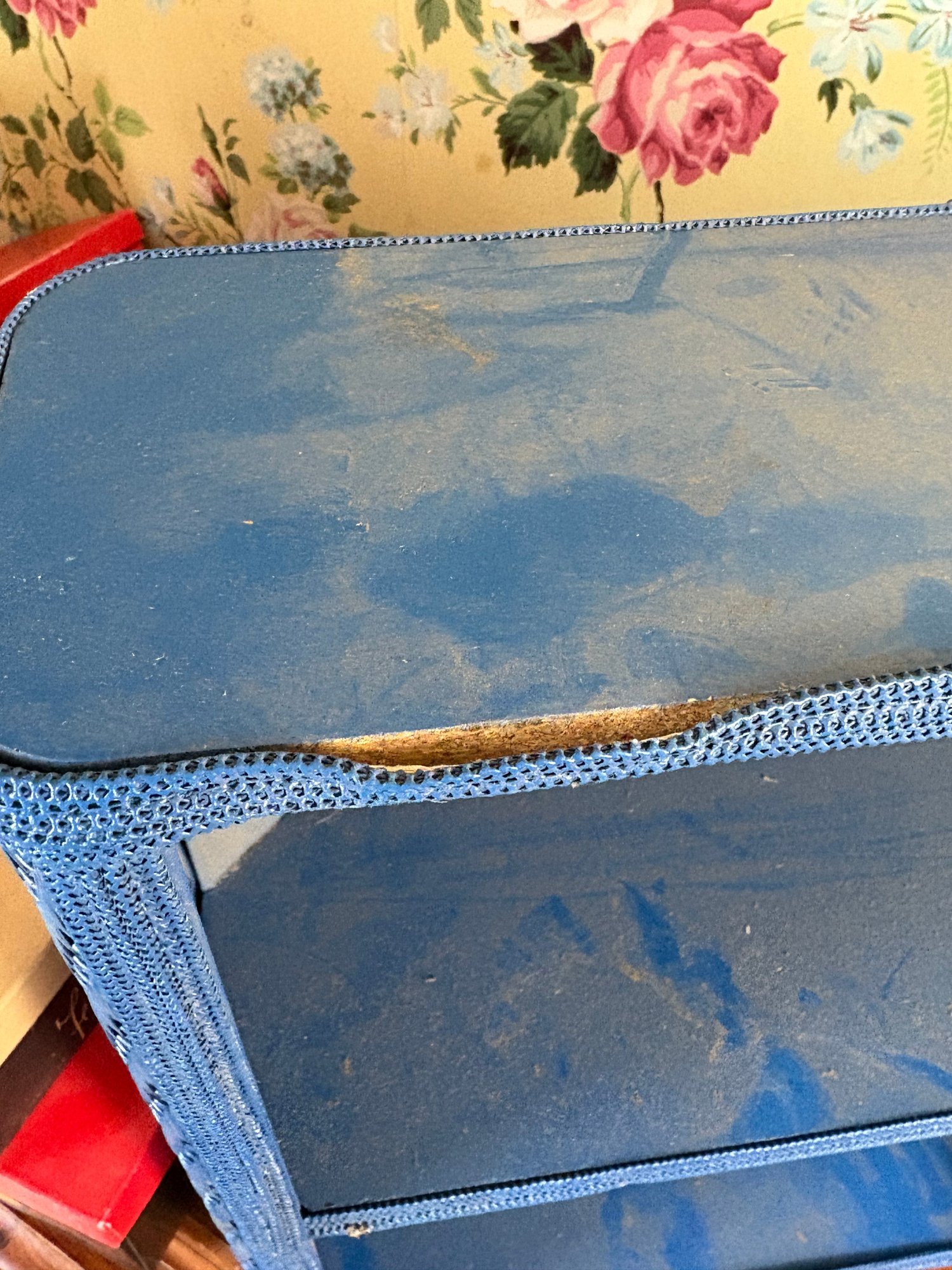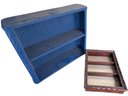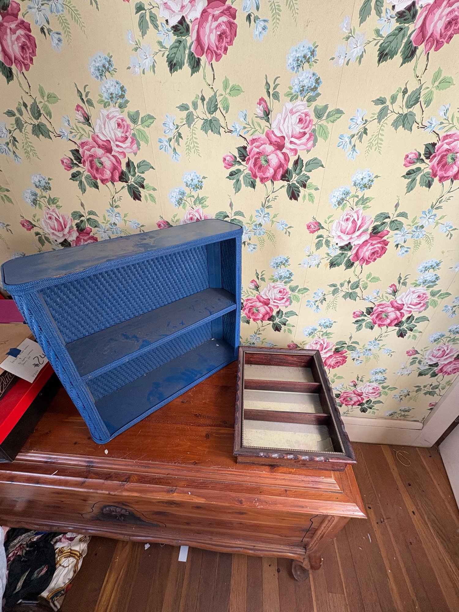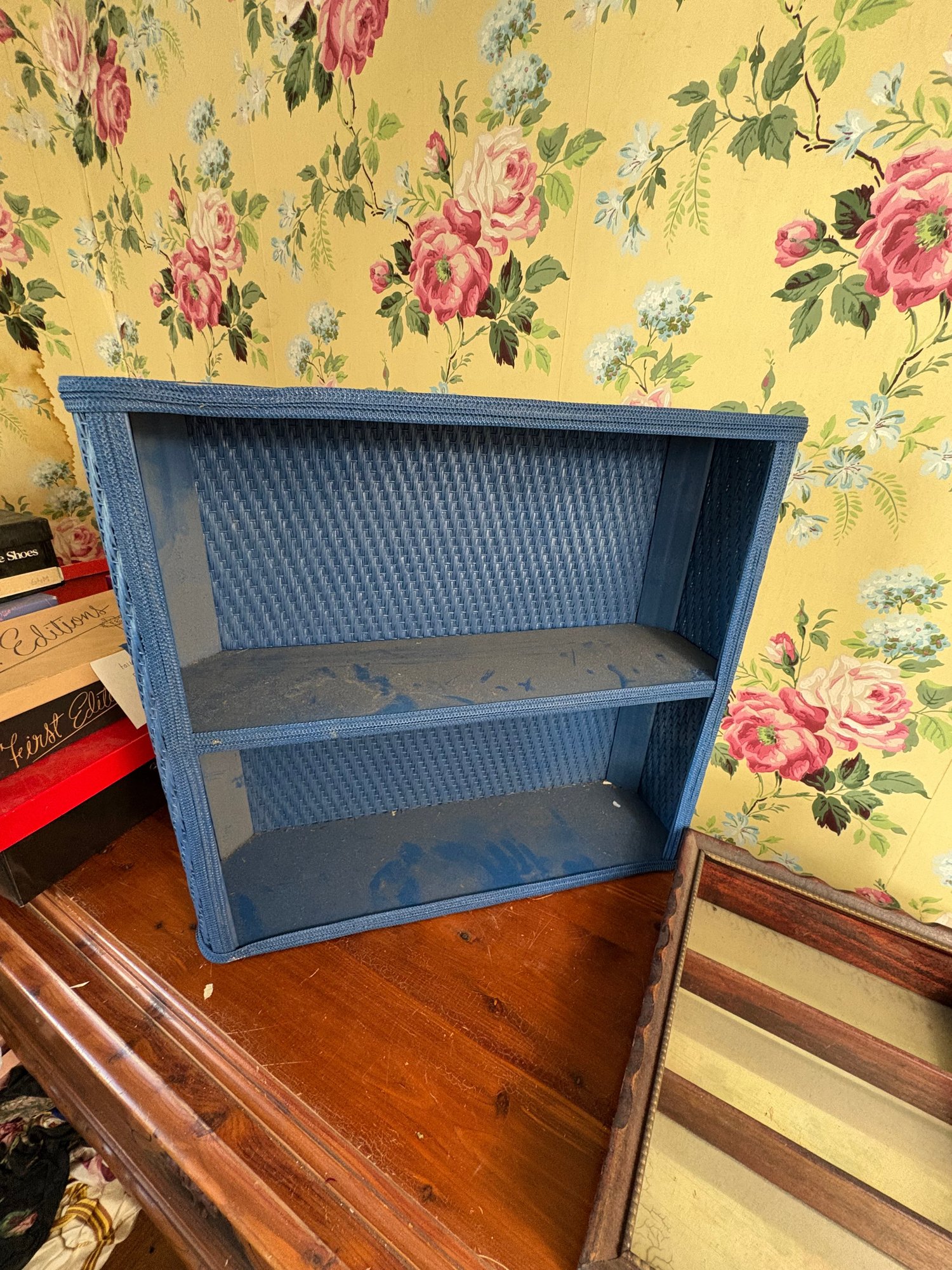 Dimensions approximately blue wicker shelf 5 by 19 by 18 inches tall. Wooden glass shelf 10.25 by 13.5 inches tall