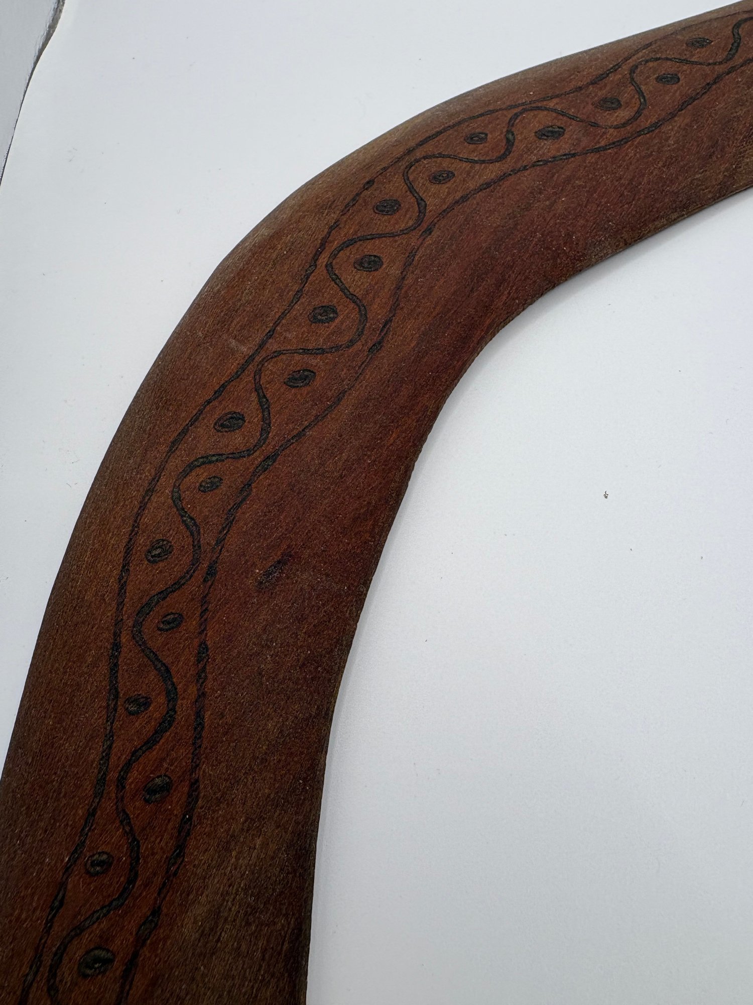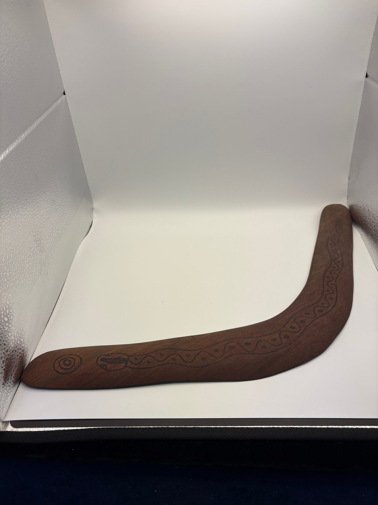 Boomerangs are iconic symbols of Australia and Aboriginal culture. Looks like burnt in snake.