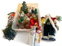 Santa, bulbs, wooden snowman display, ornaments, lights