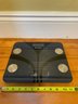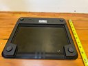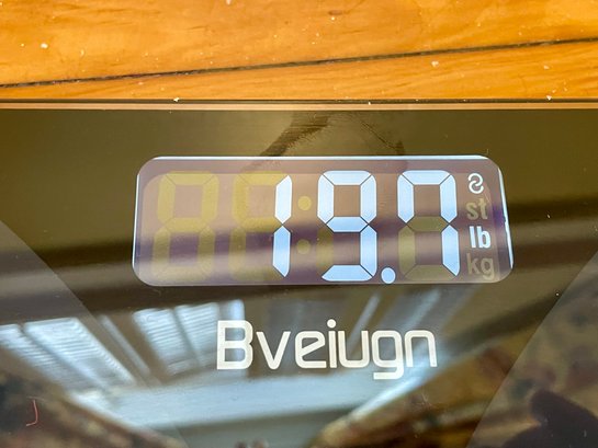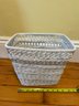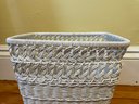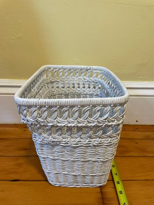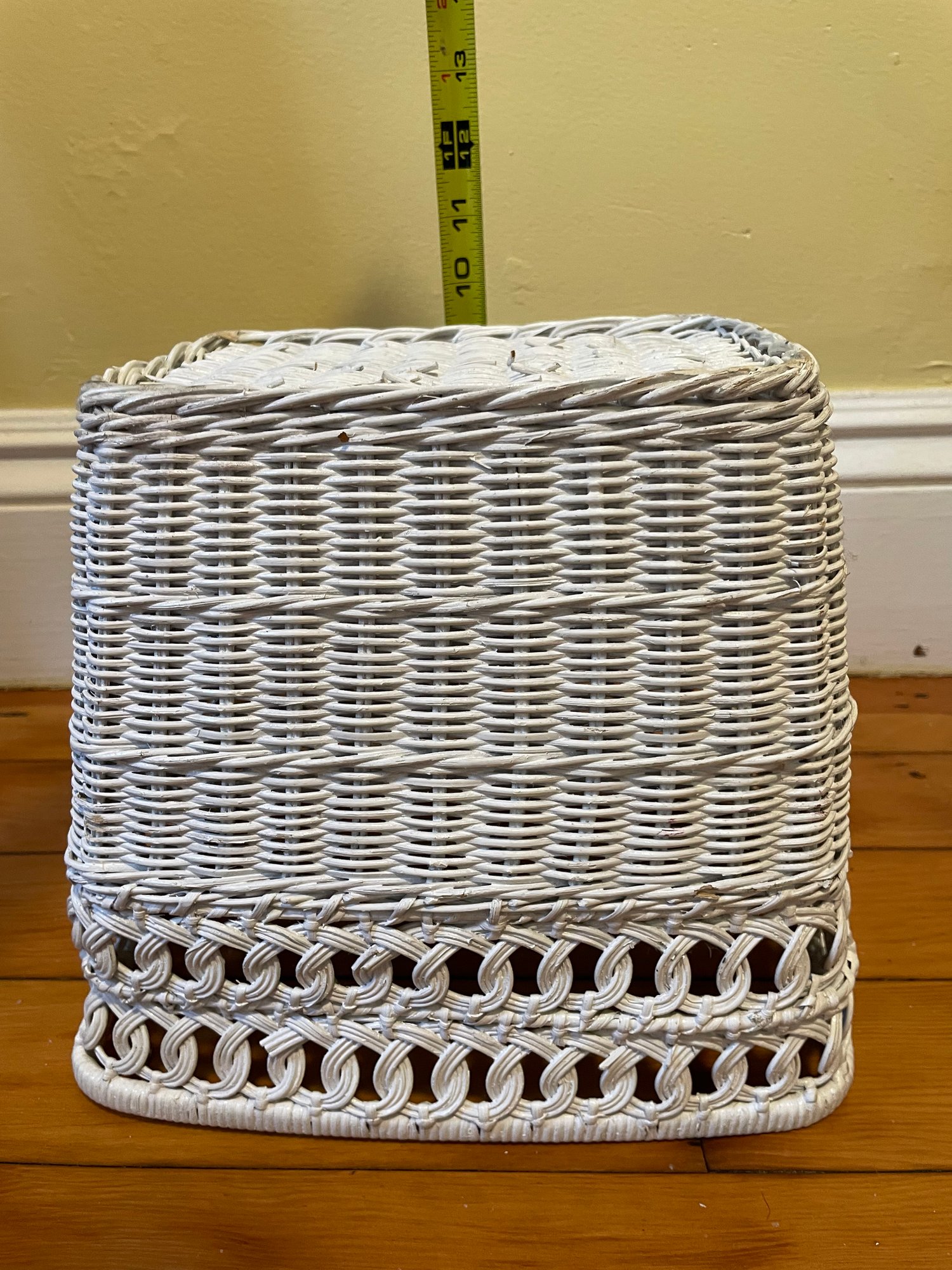 Digital glass Bveiugn scale, vintage white wicker waste basket