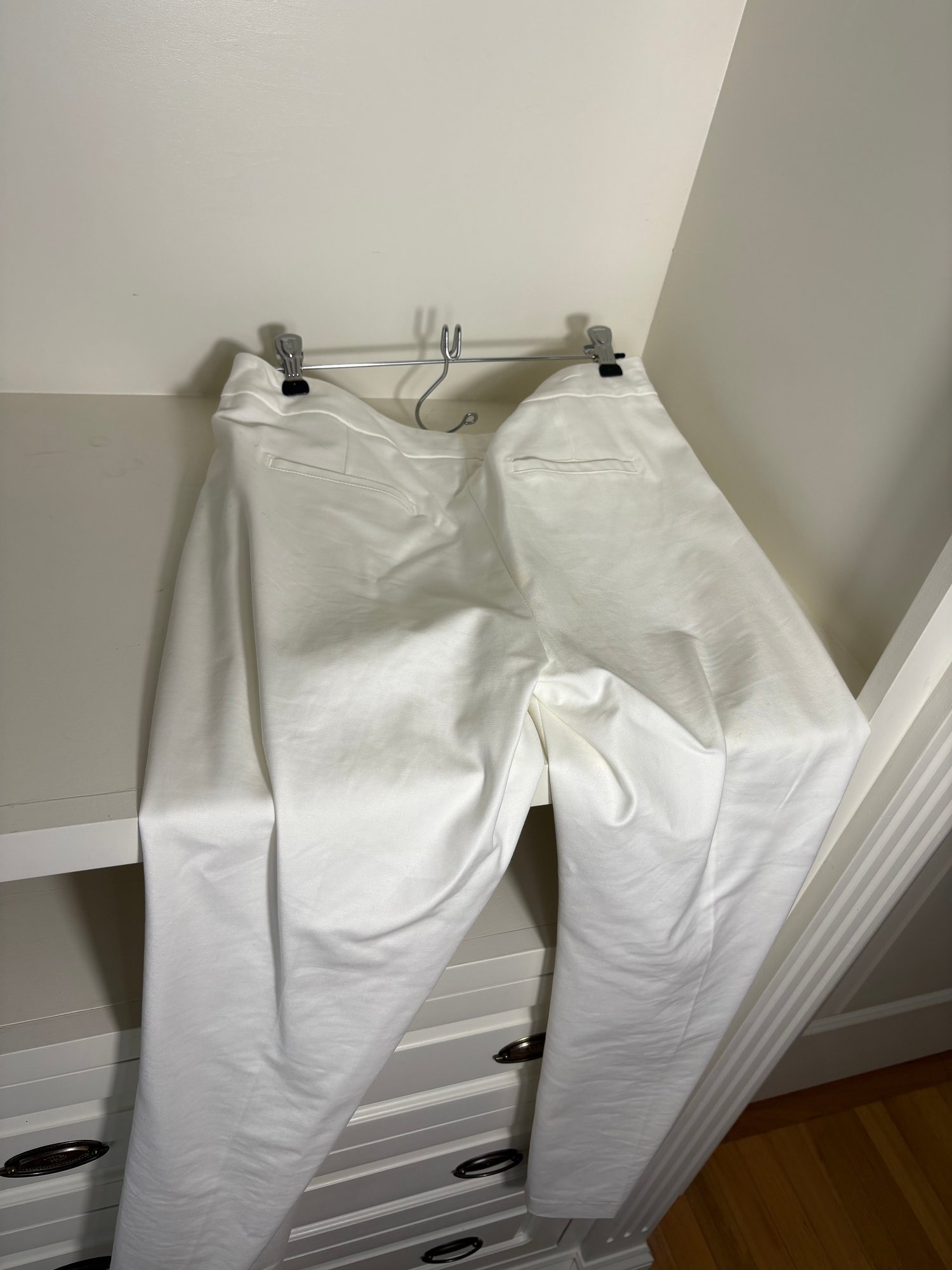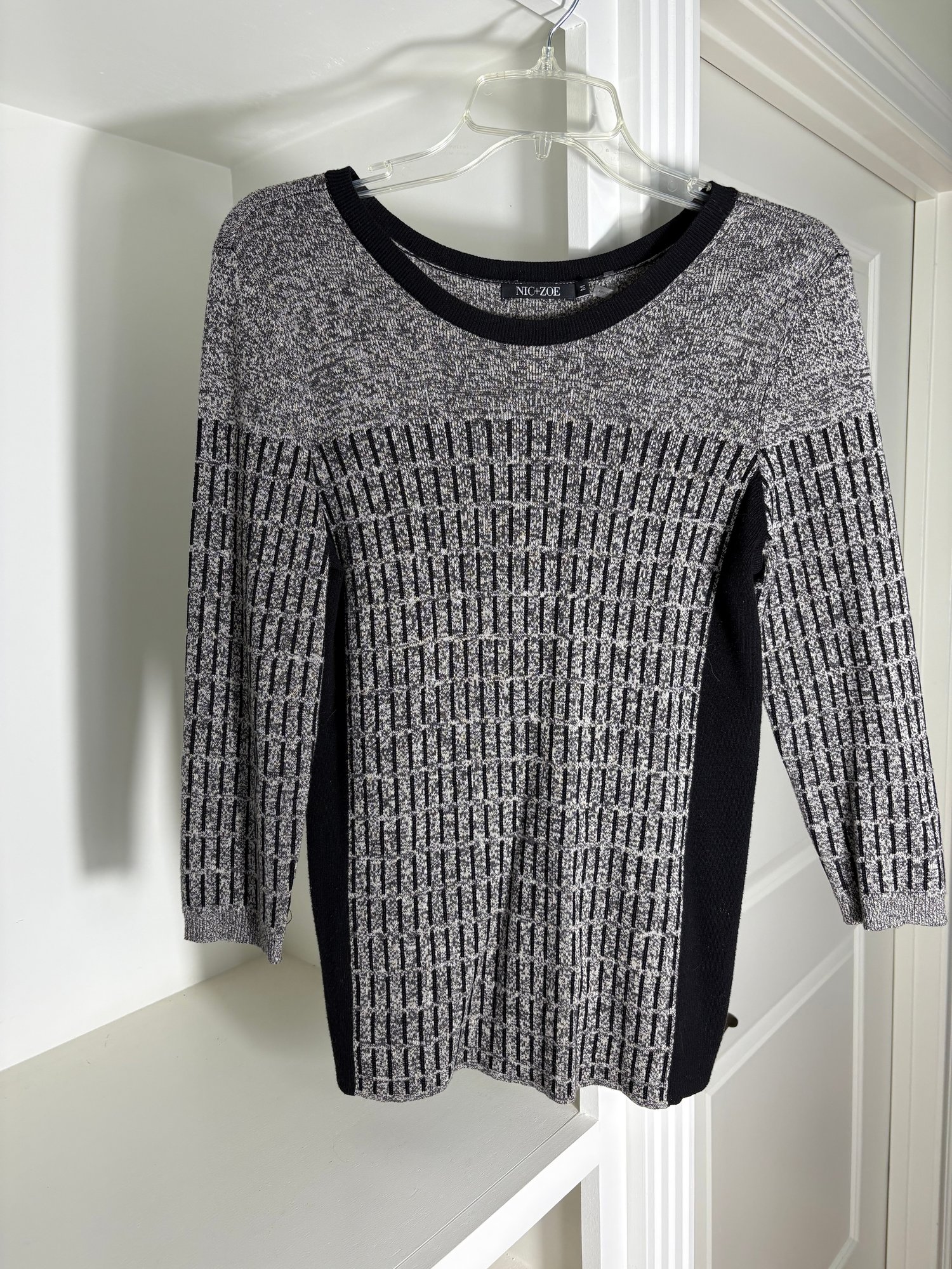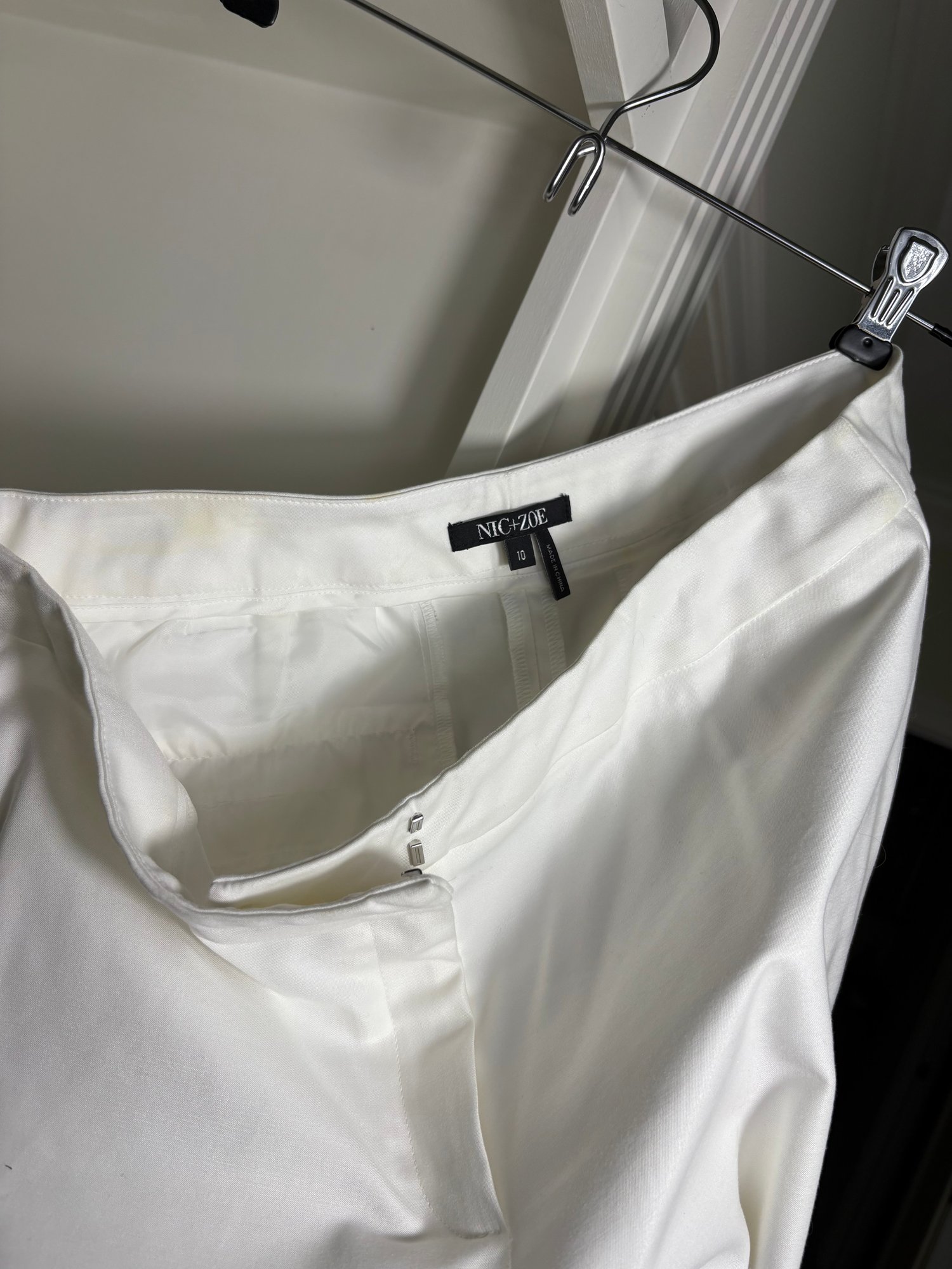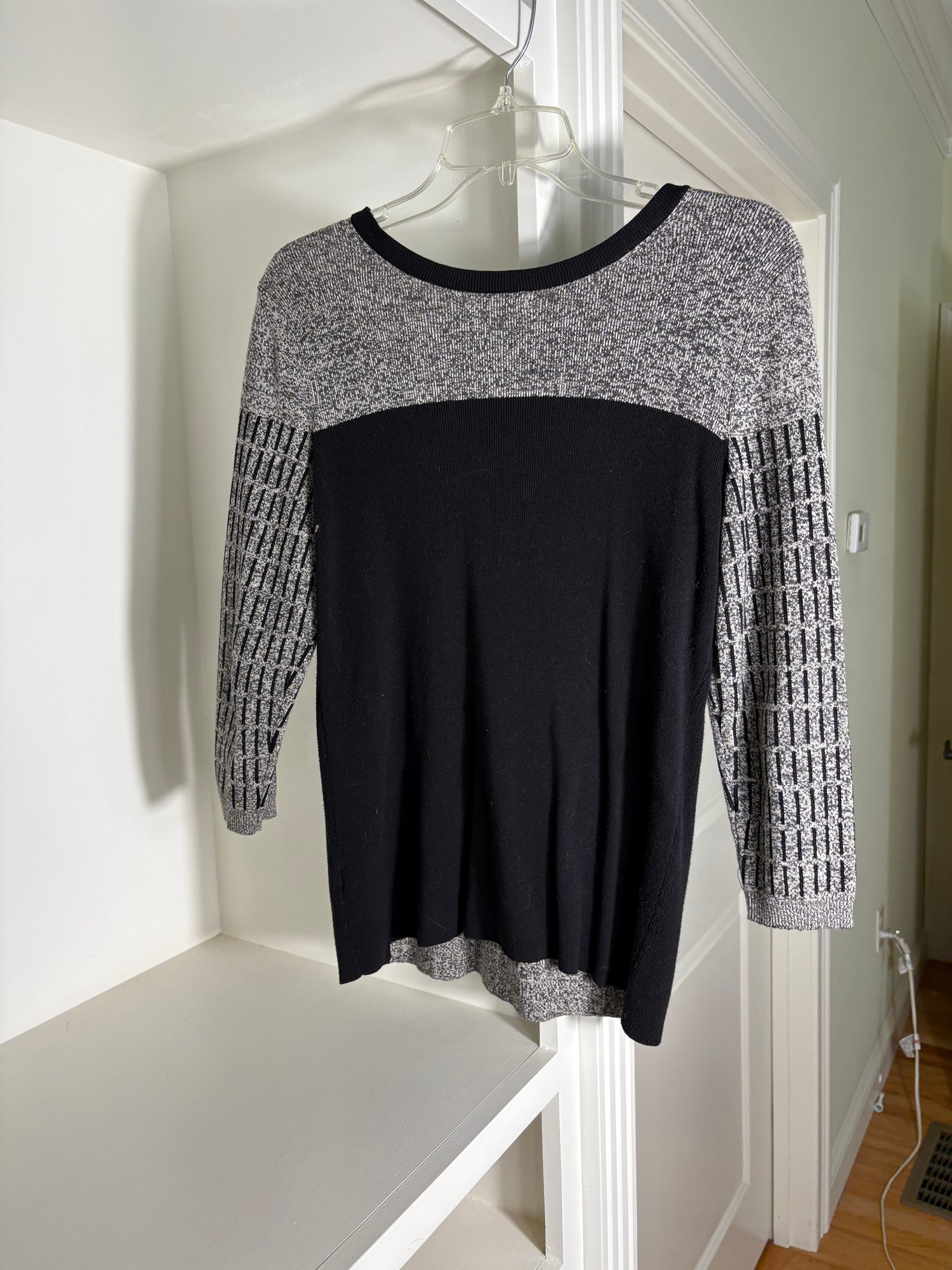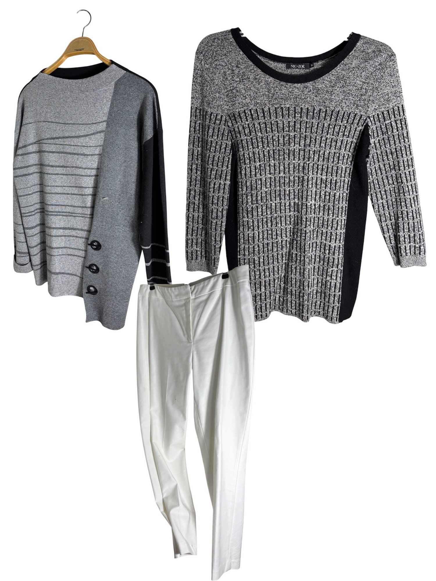 White pants are a size 10. The light gray sweater is a size small. The dark gray sweater is a size medium