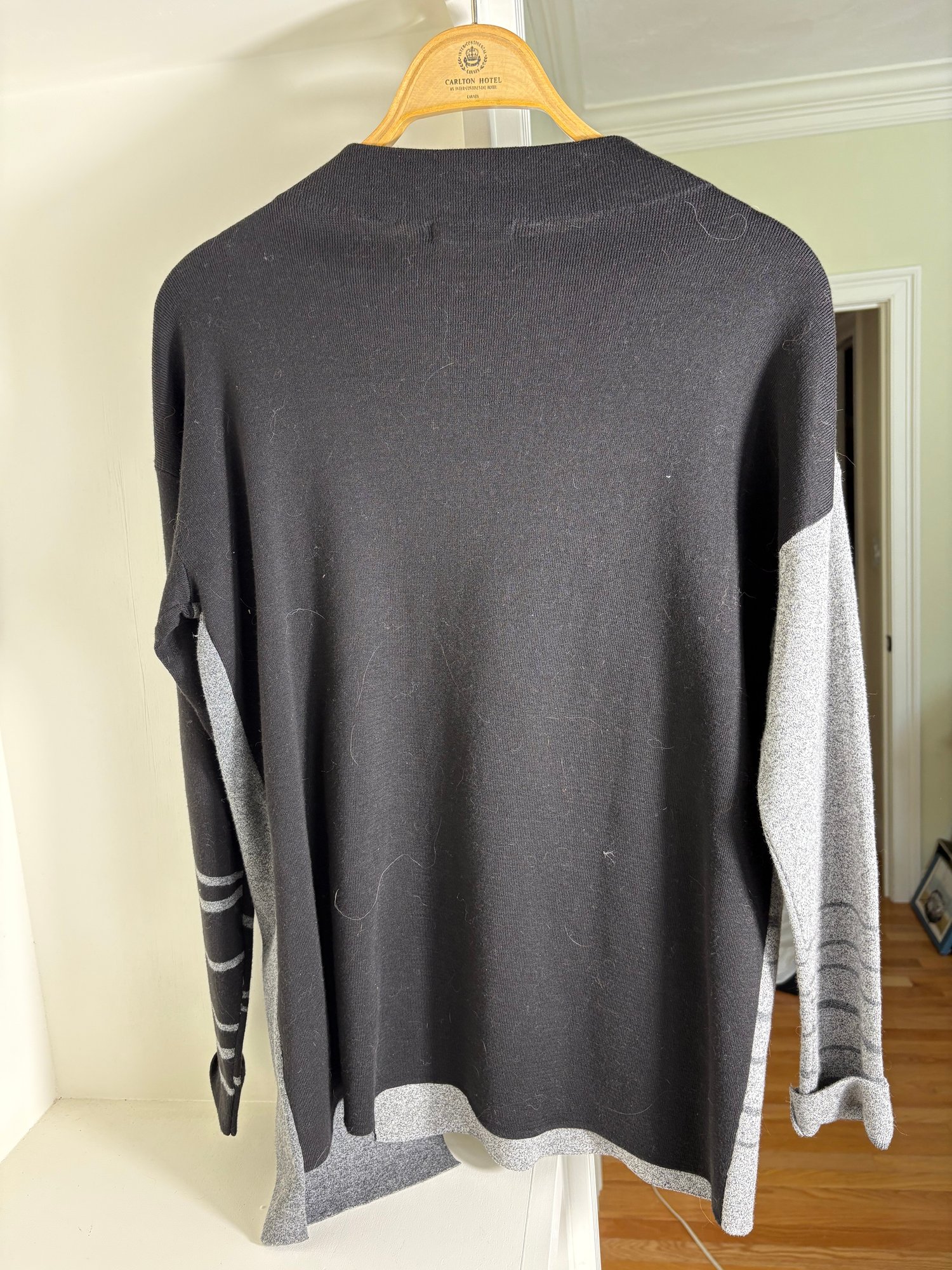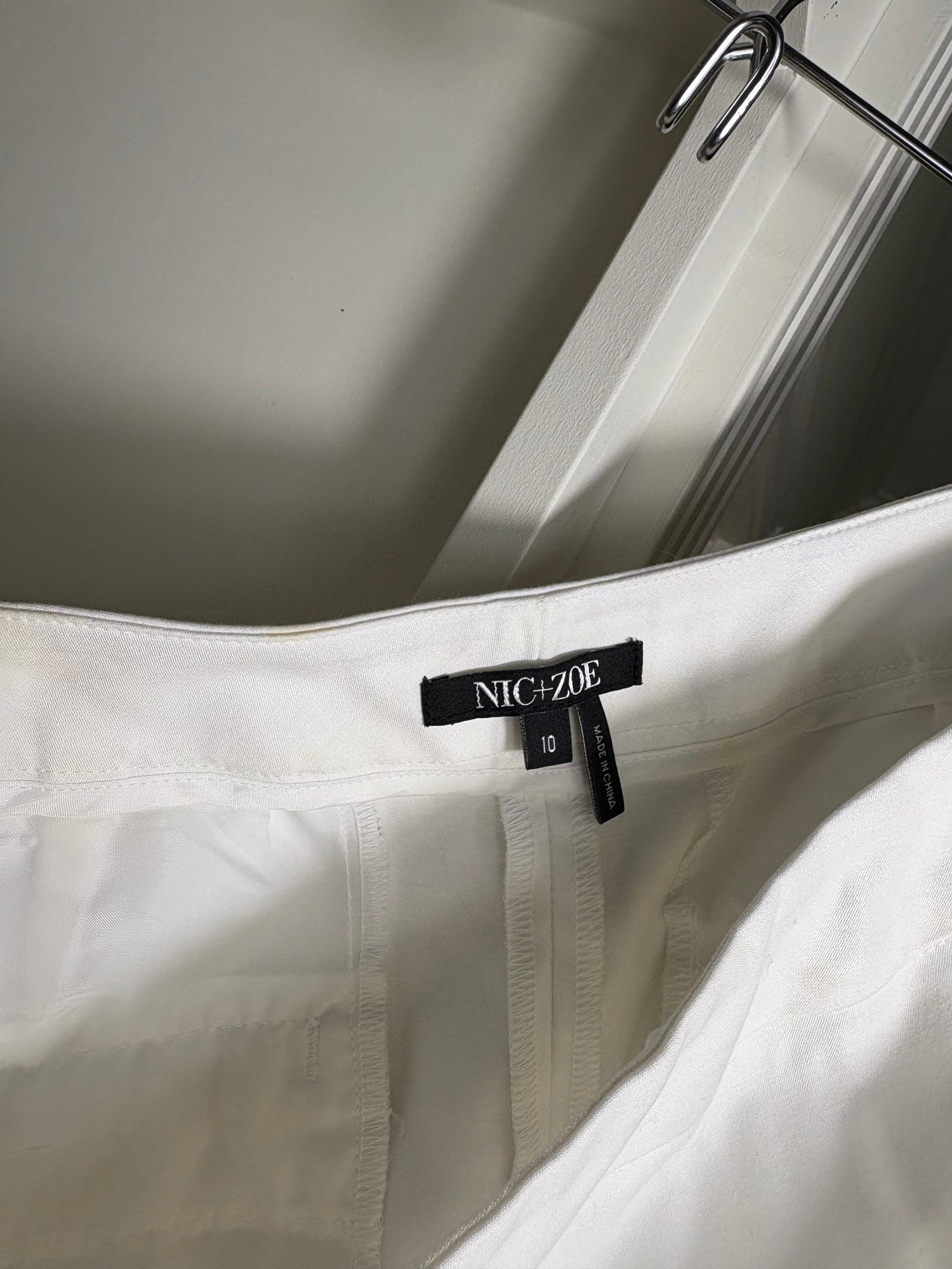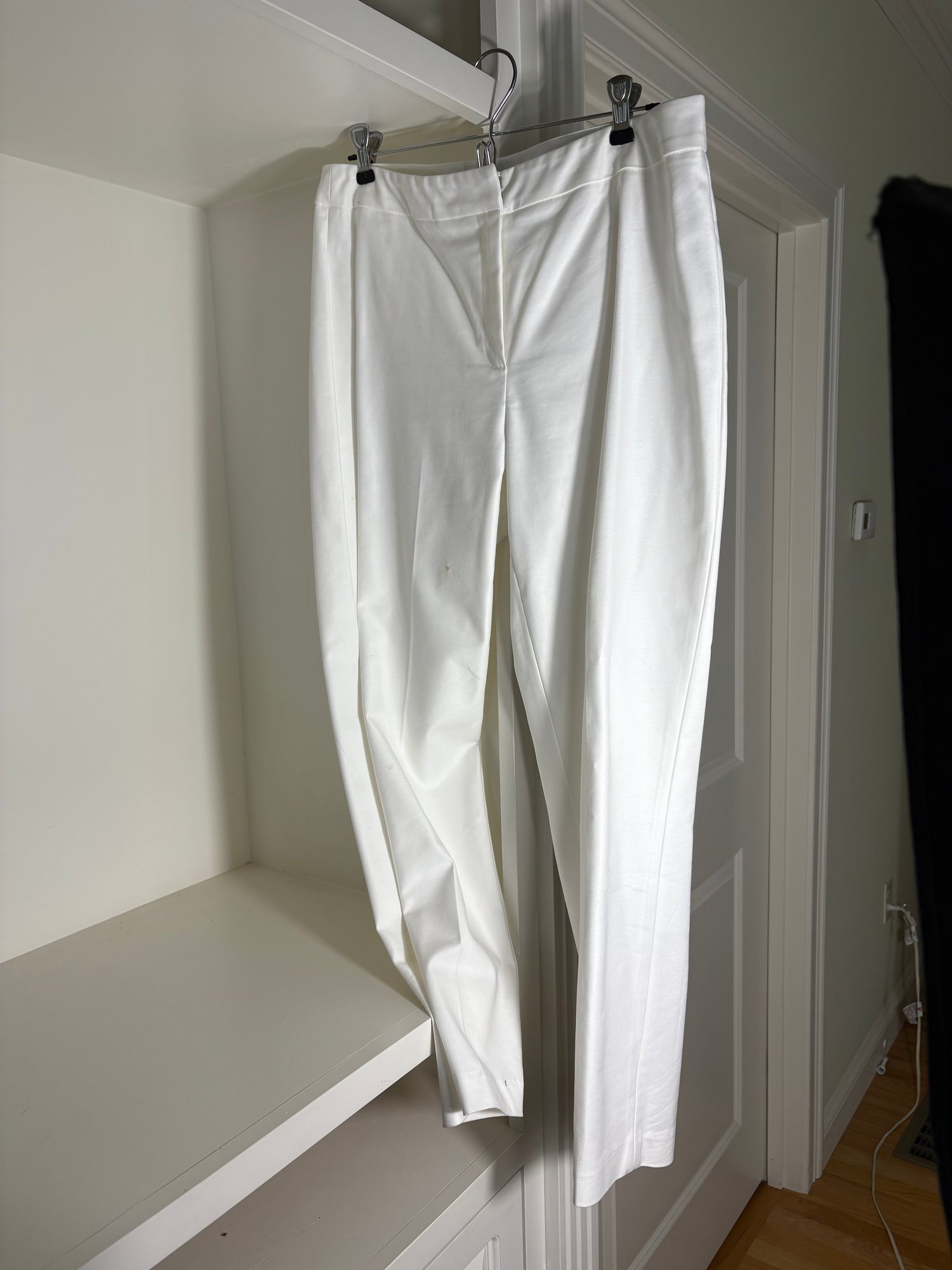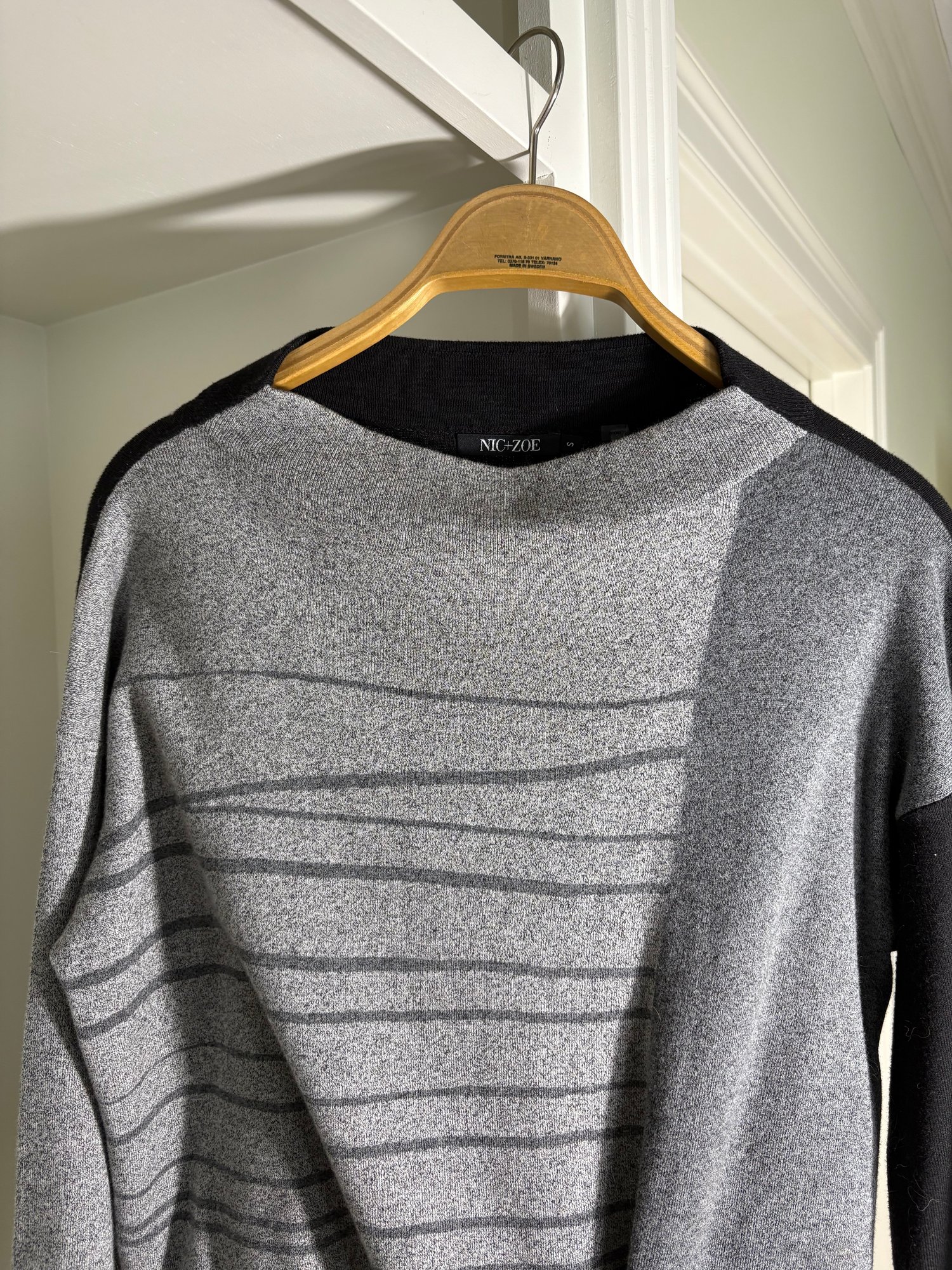 White pants are a size 10. The light gray sweater is a size small. The dark gray sweater is a size medium