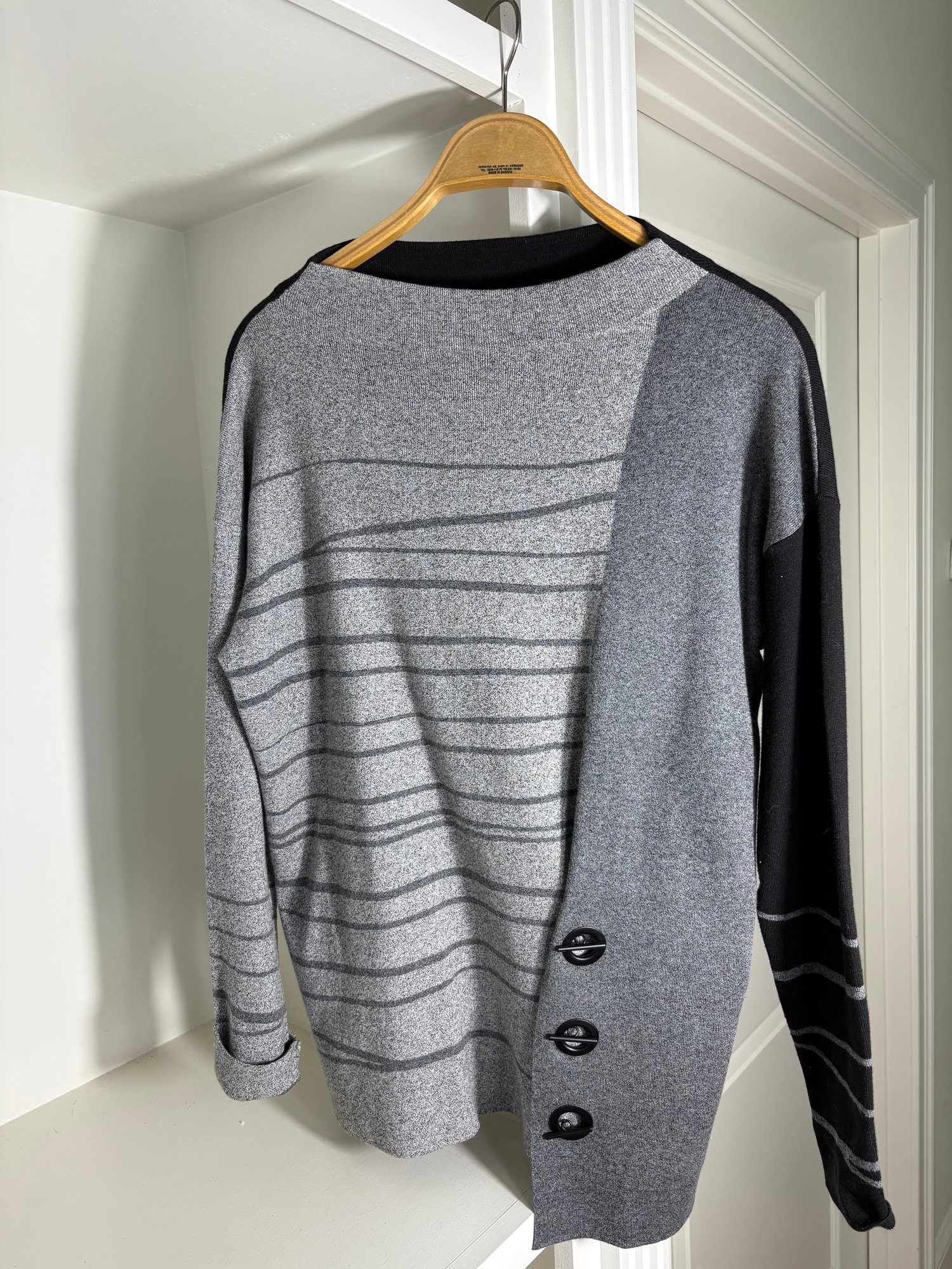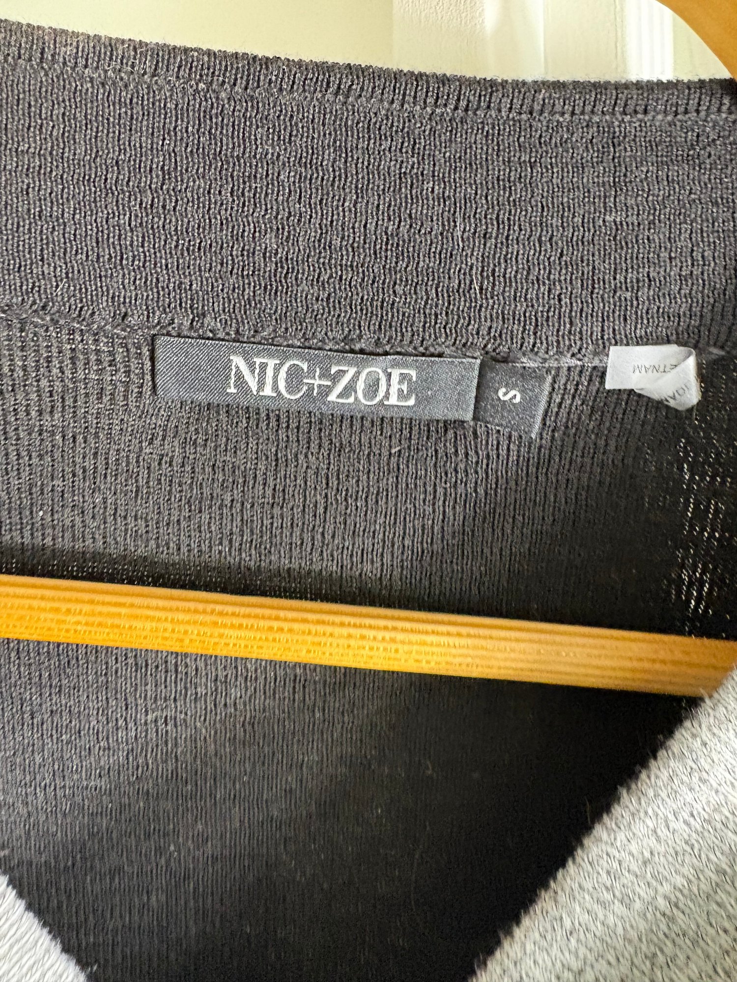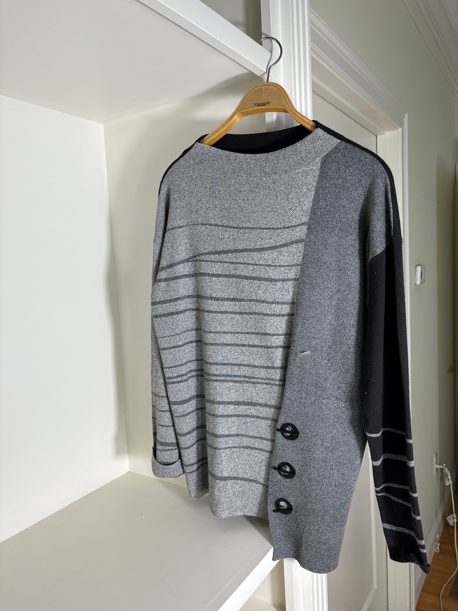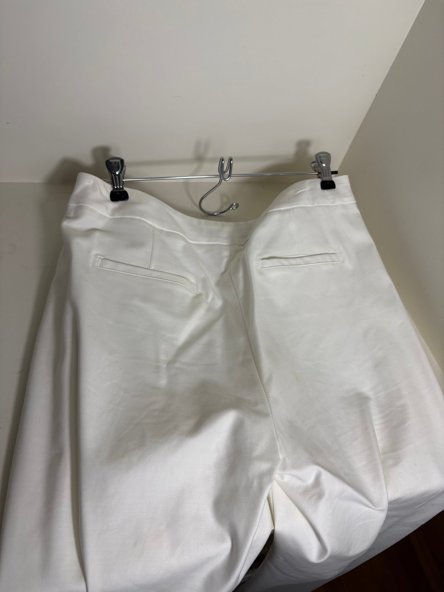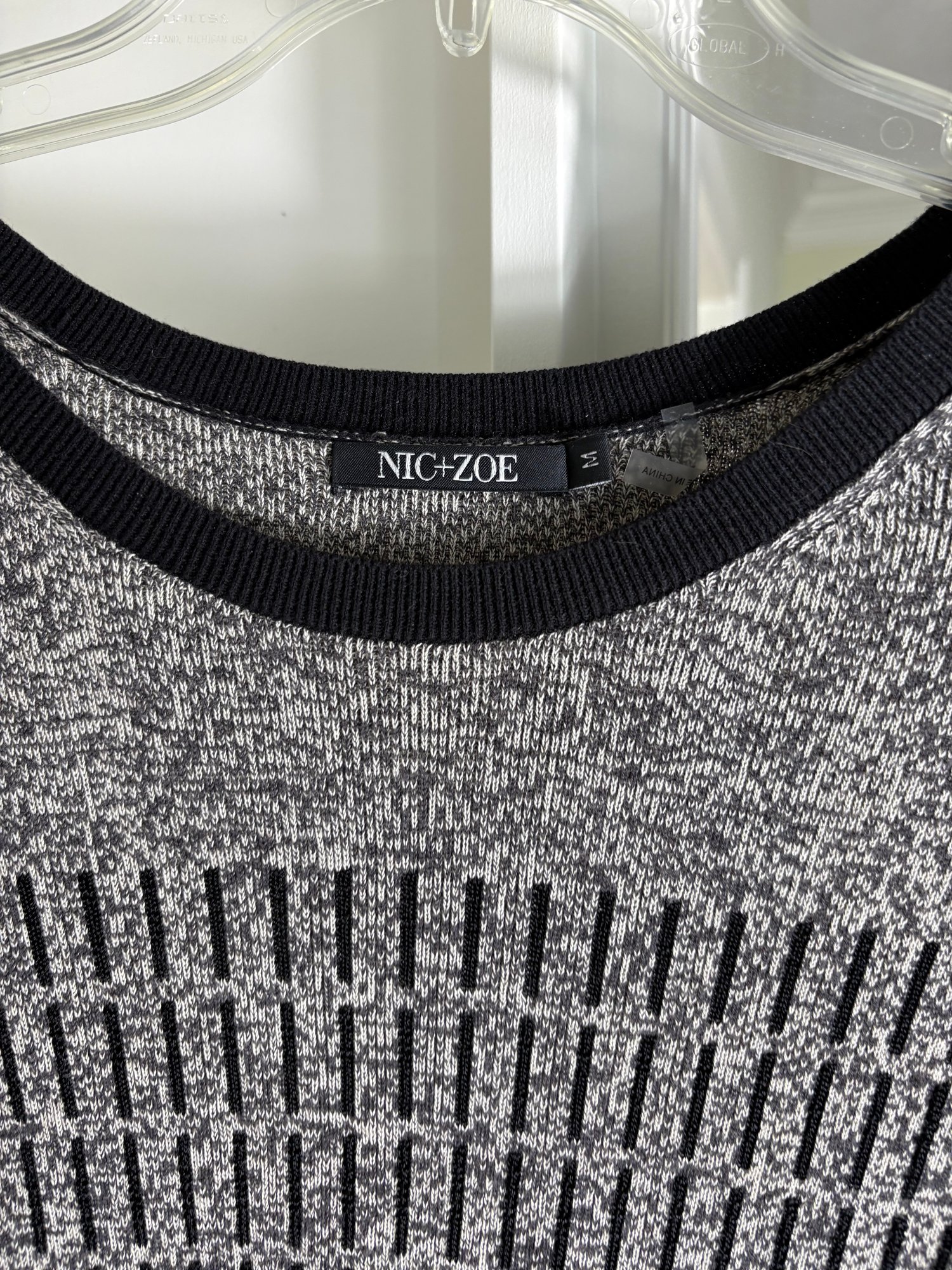 White pants are a size 10. The light gray sweater is a size small. The dark gray sweater is a size medium