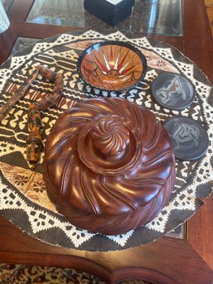 Carved wooden bowl with lid, decorative mat, 2 coasters, 1 wooden snake and 1 small ceramic dish