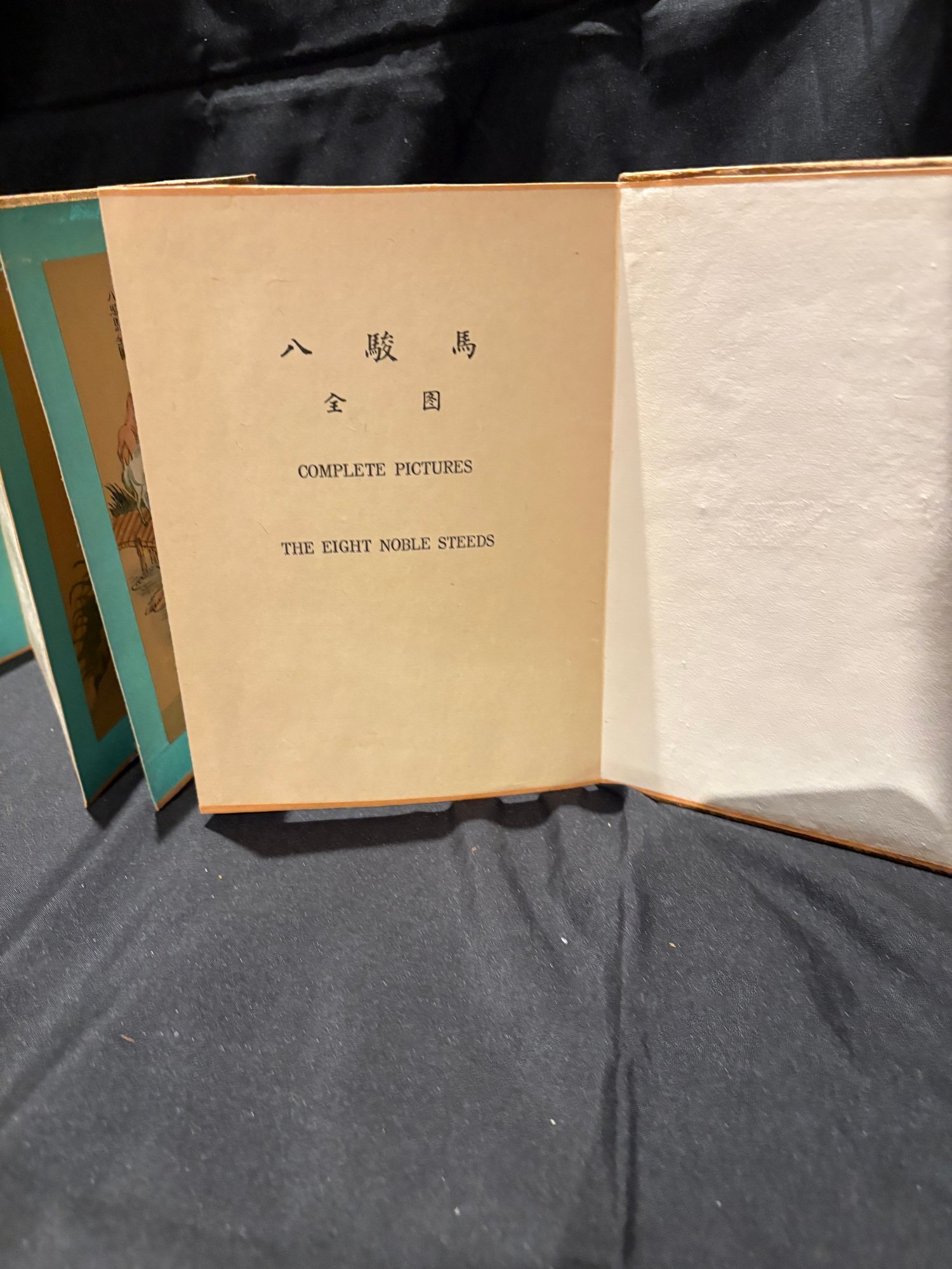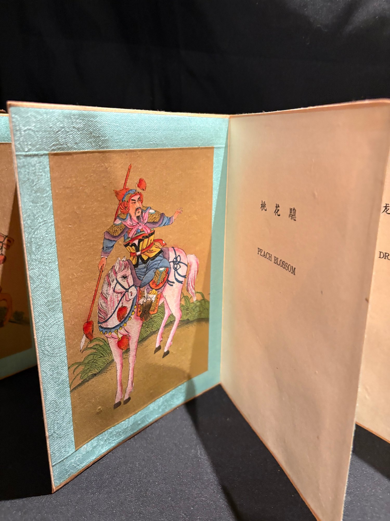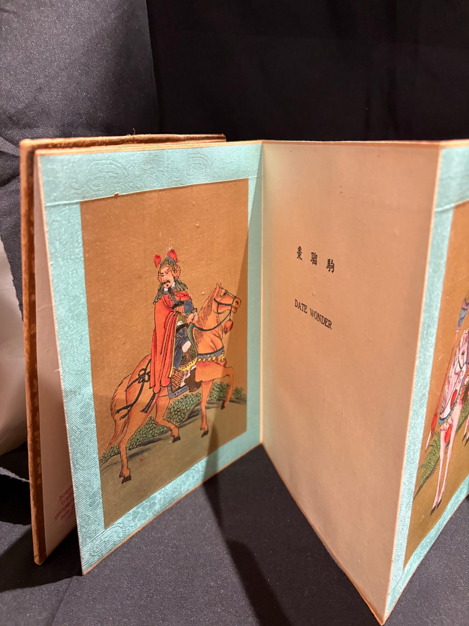 Antique hand painted Chinese. Eight Noble Steeds accordion book with silk and fabric.
