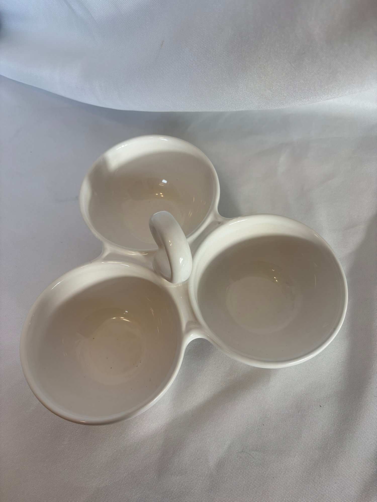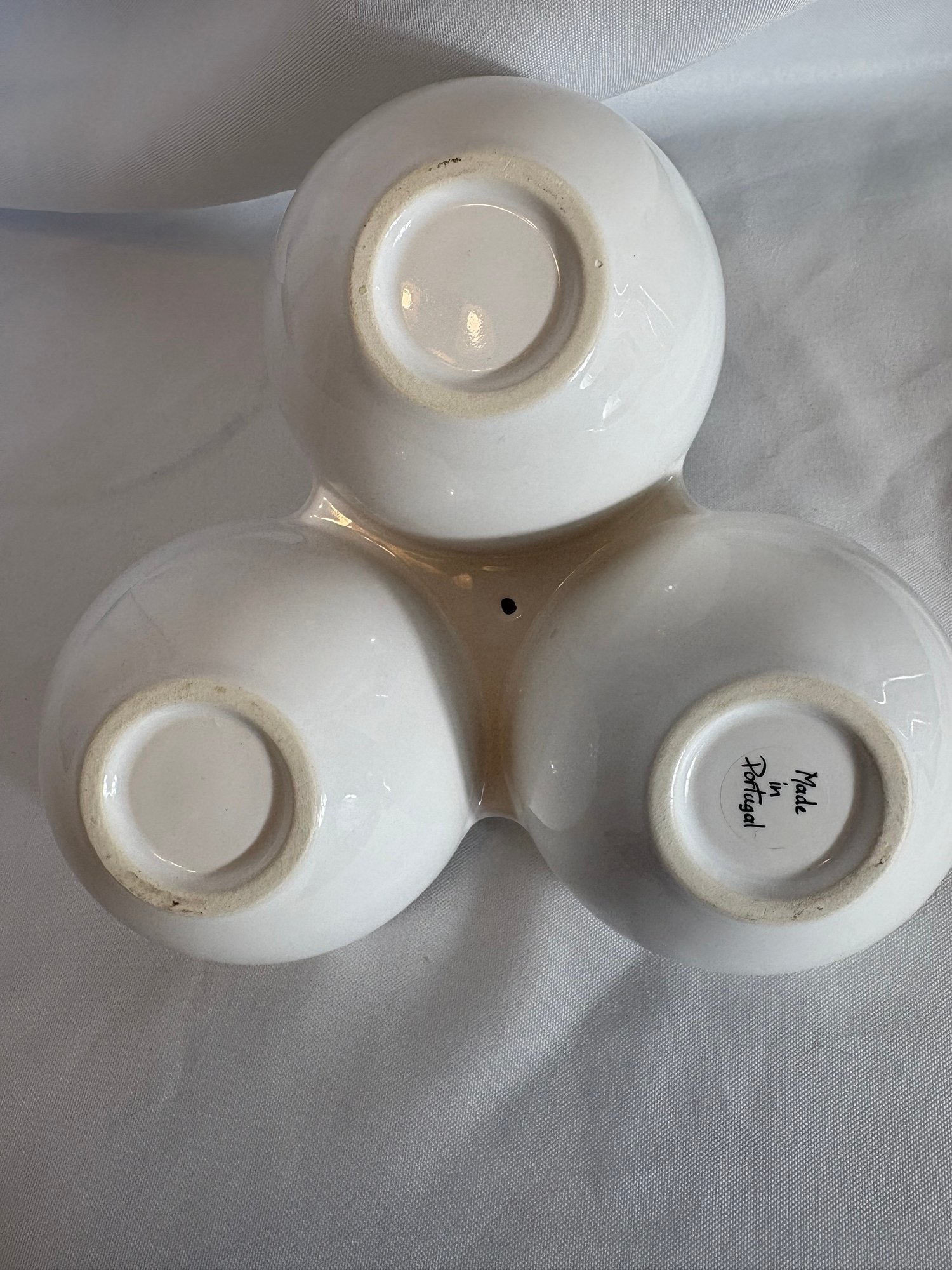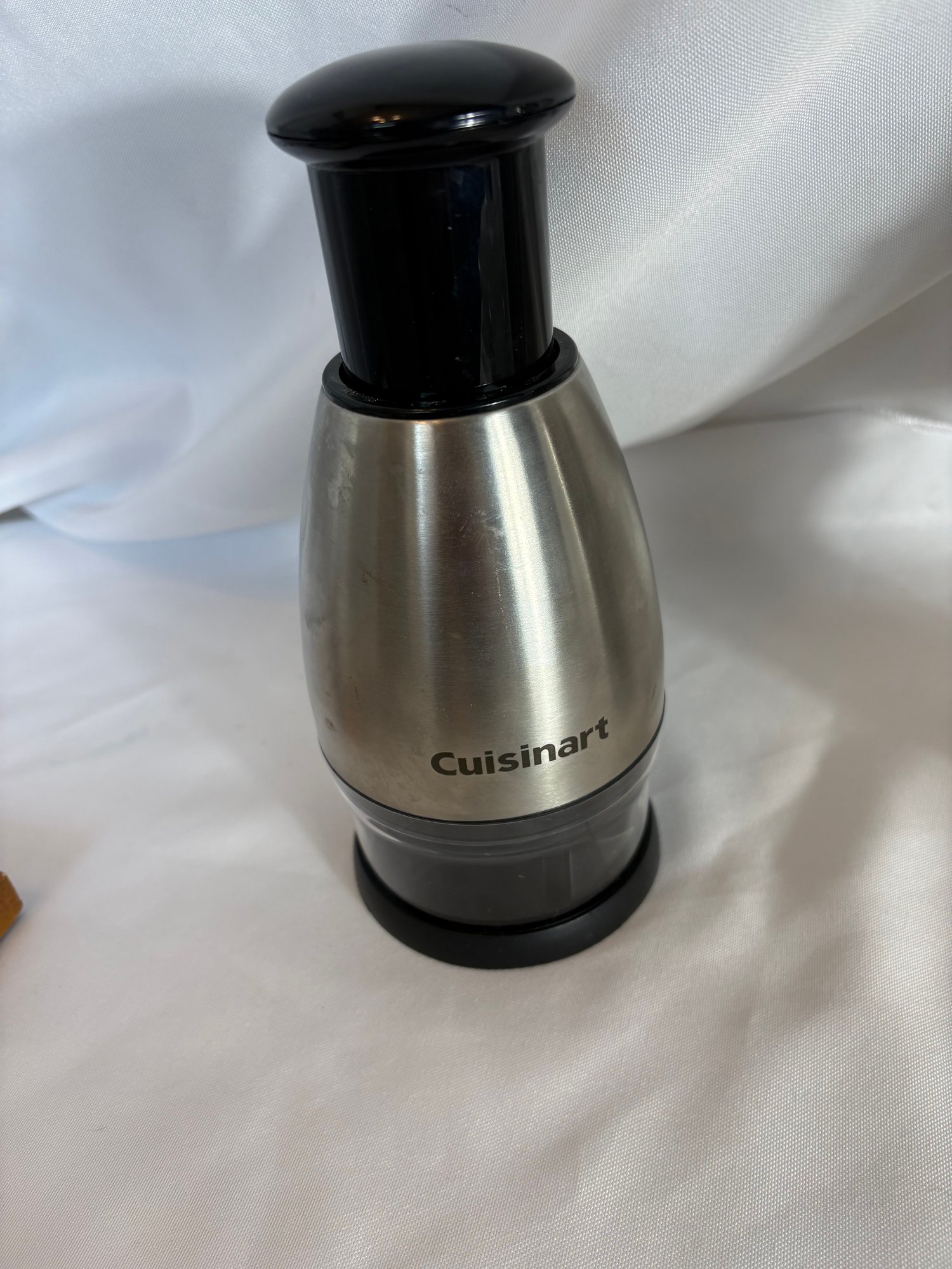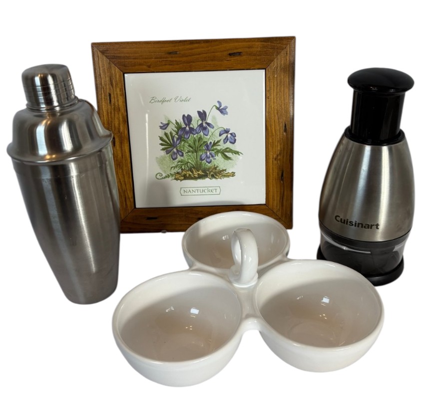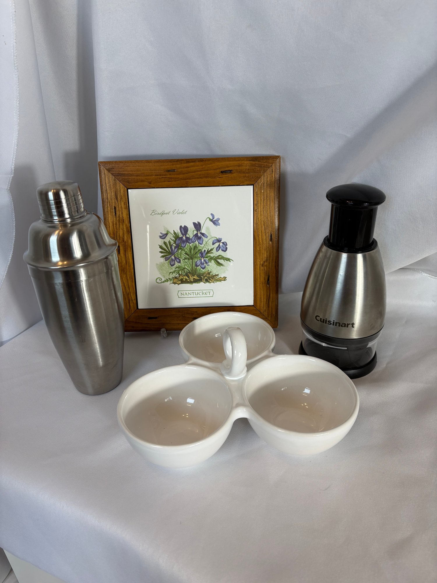 Four items there’s a Nantucket hot plate a made in Portugal white three container dip with the handle cocktail shaker and a Cuisinart chopper hand chopper