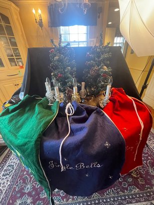 7-white and gold candle stick lights,6.5 inches without bulb, 3-homemade felt drawstring Christmas bags 20 inches wide, 29 inches long.