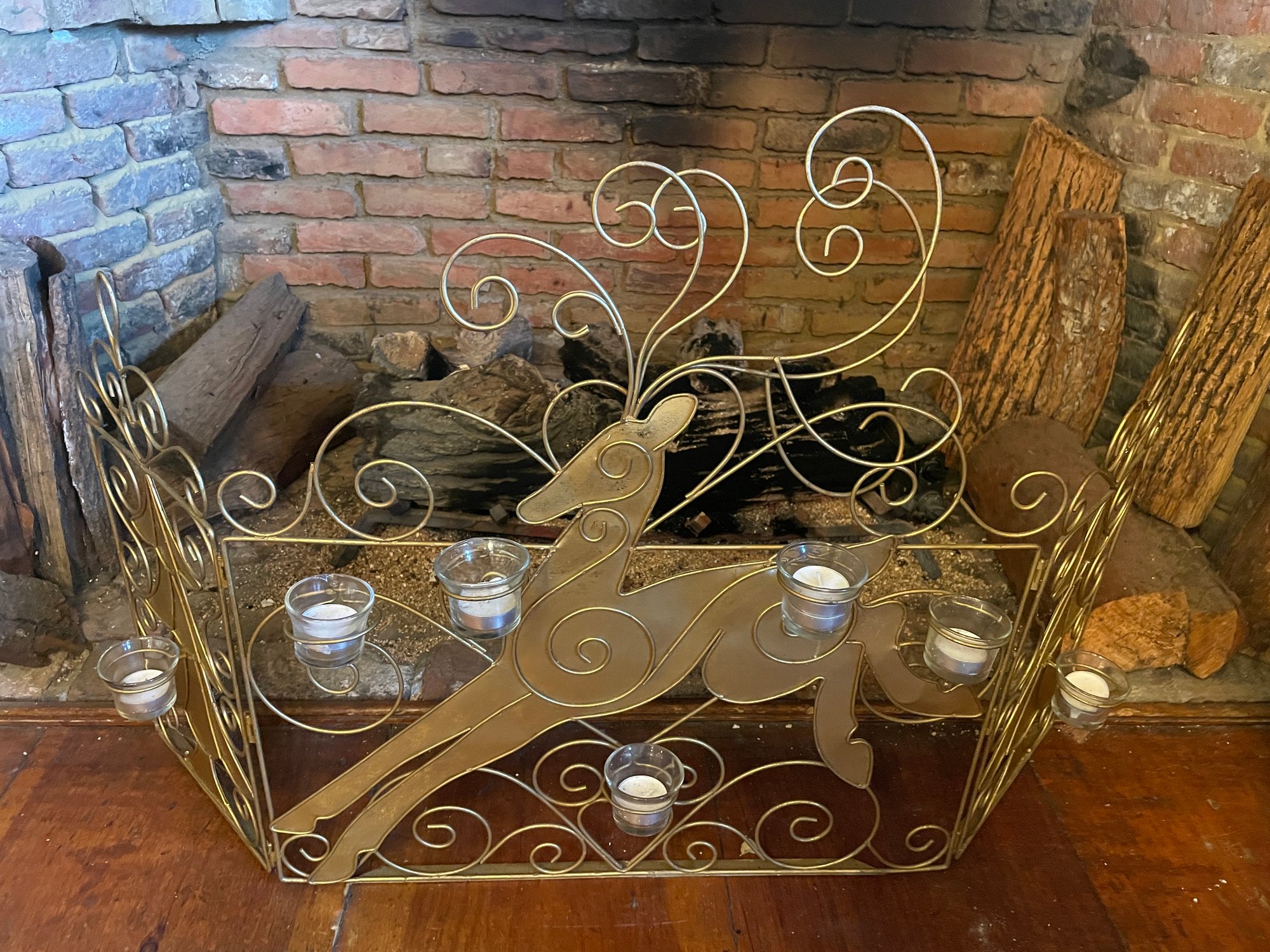 Gold , three section fireplace screen with votives, center section 23.5 inches wide, end sections 9.5 inches wide, height, 26 inches at center, 7 votives in clear glass cups