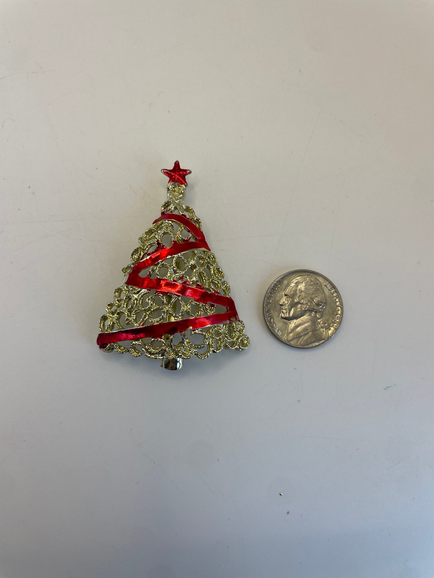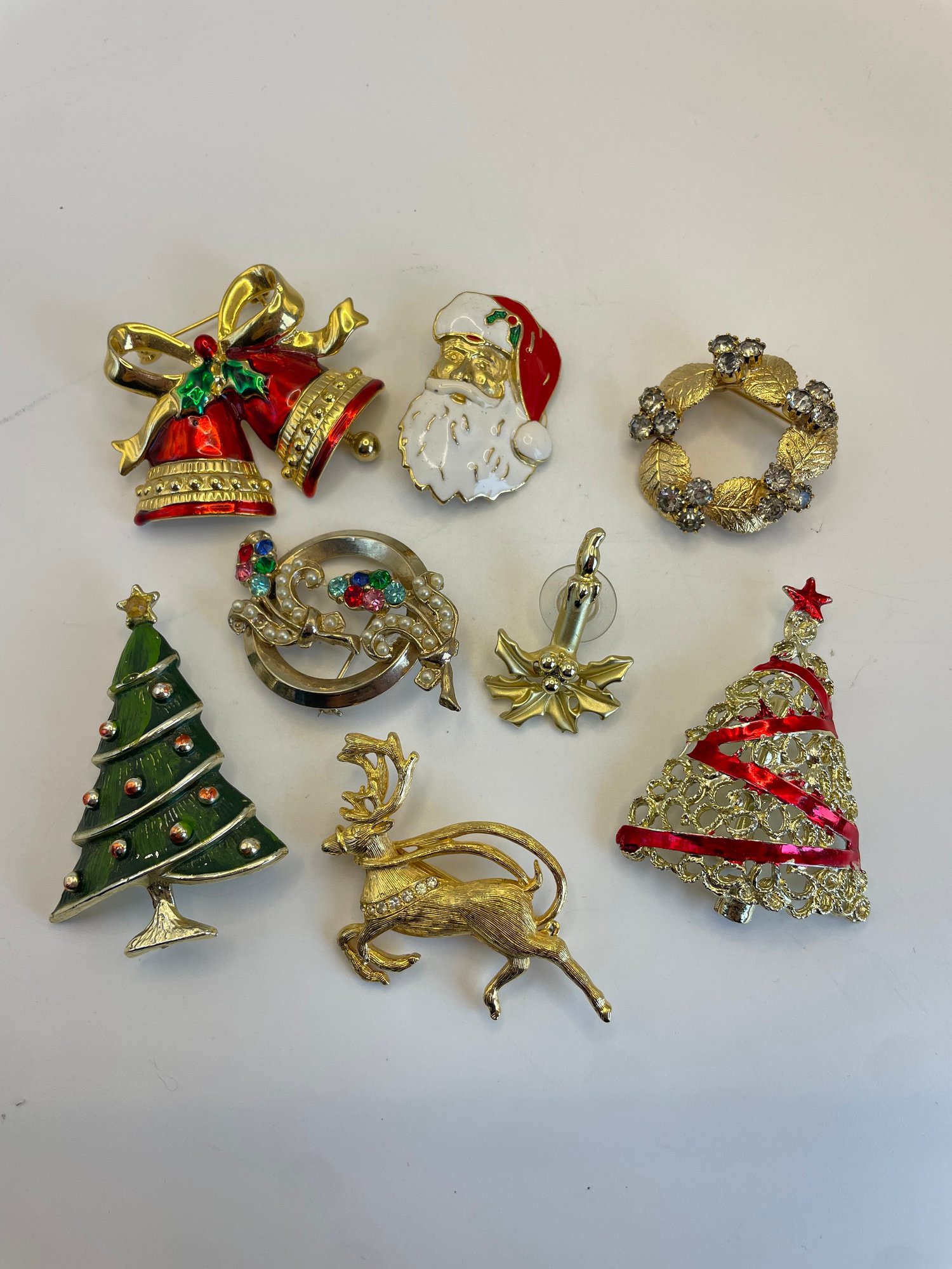 Gold toned collection of Christmas brooches, featuring Christmas trees, Christmas bells, reindeer and seasonal home decor