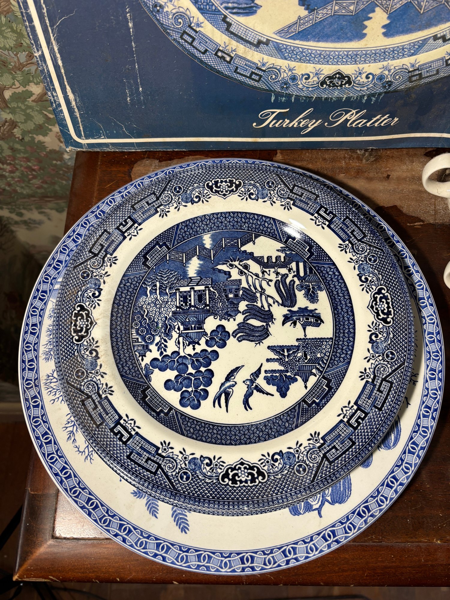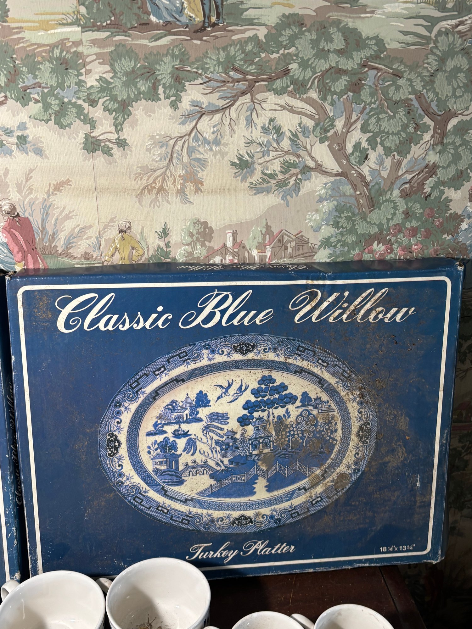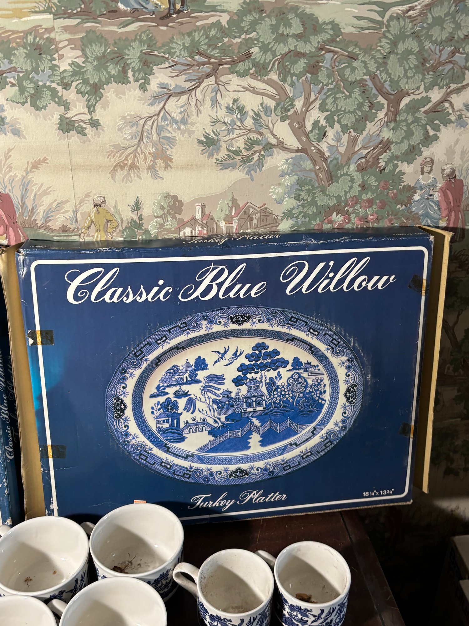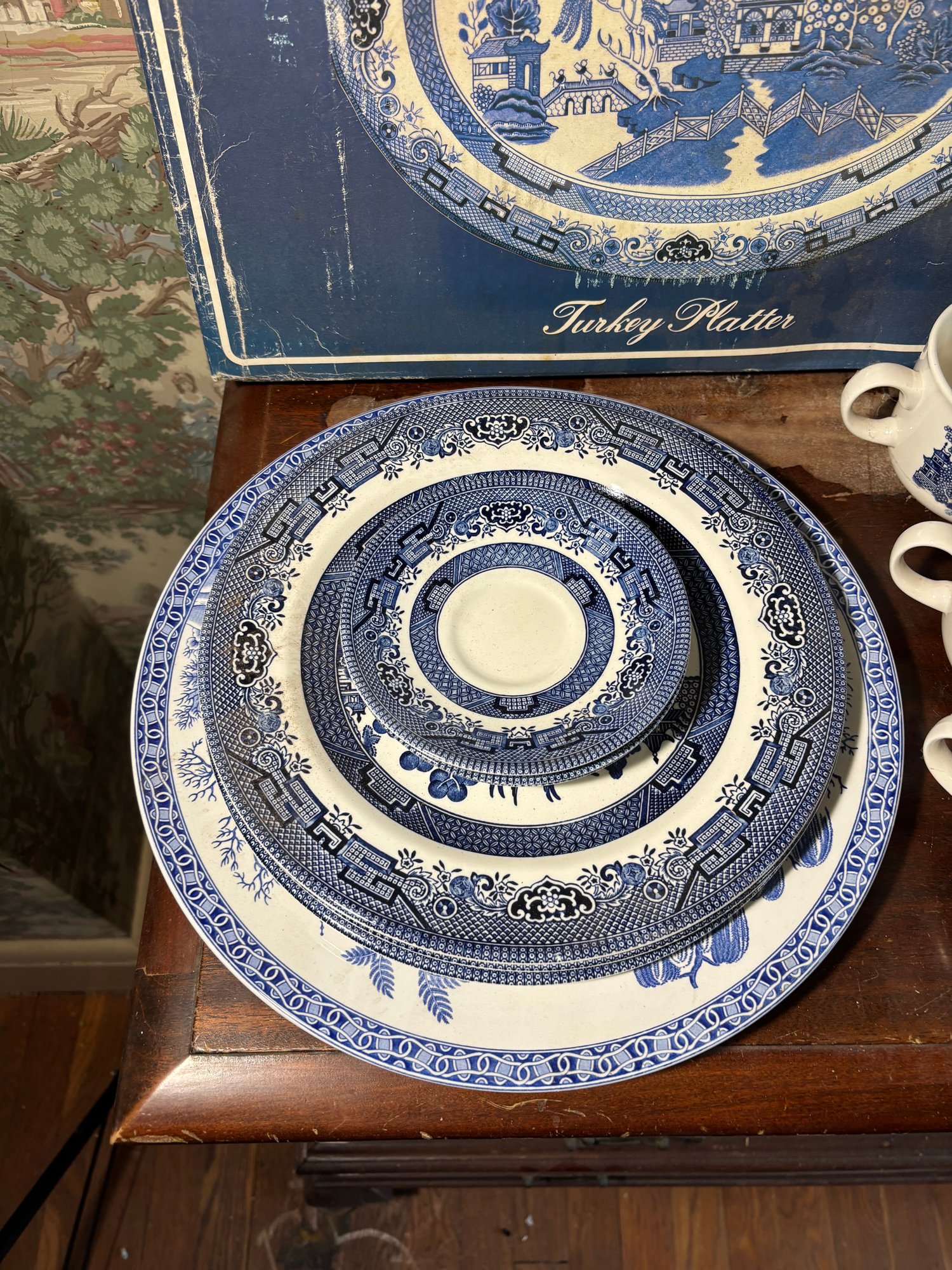 Includes 2 turkey platers, a large plate, 3 dinner plates, 3 saucers, 11 mugs, 3 cups