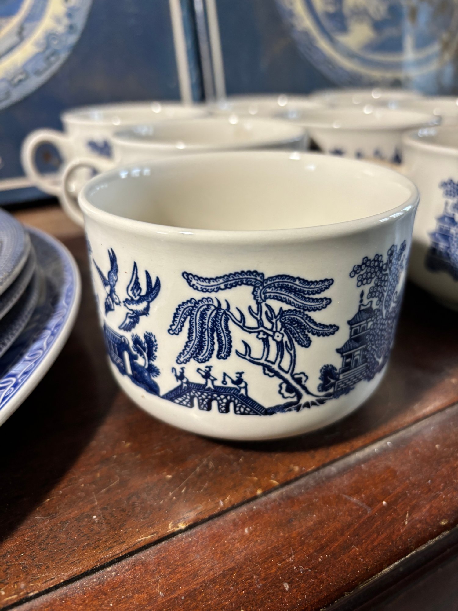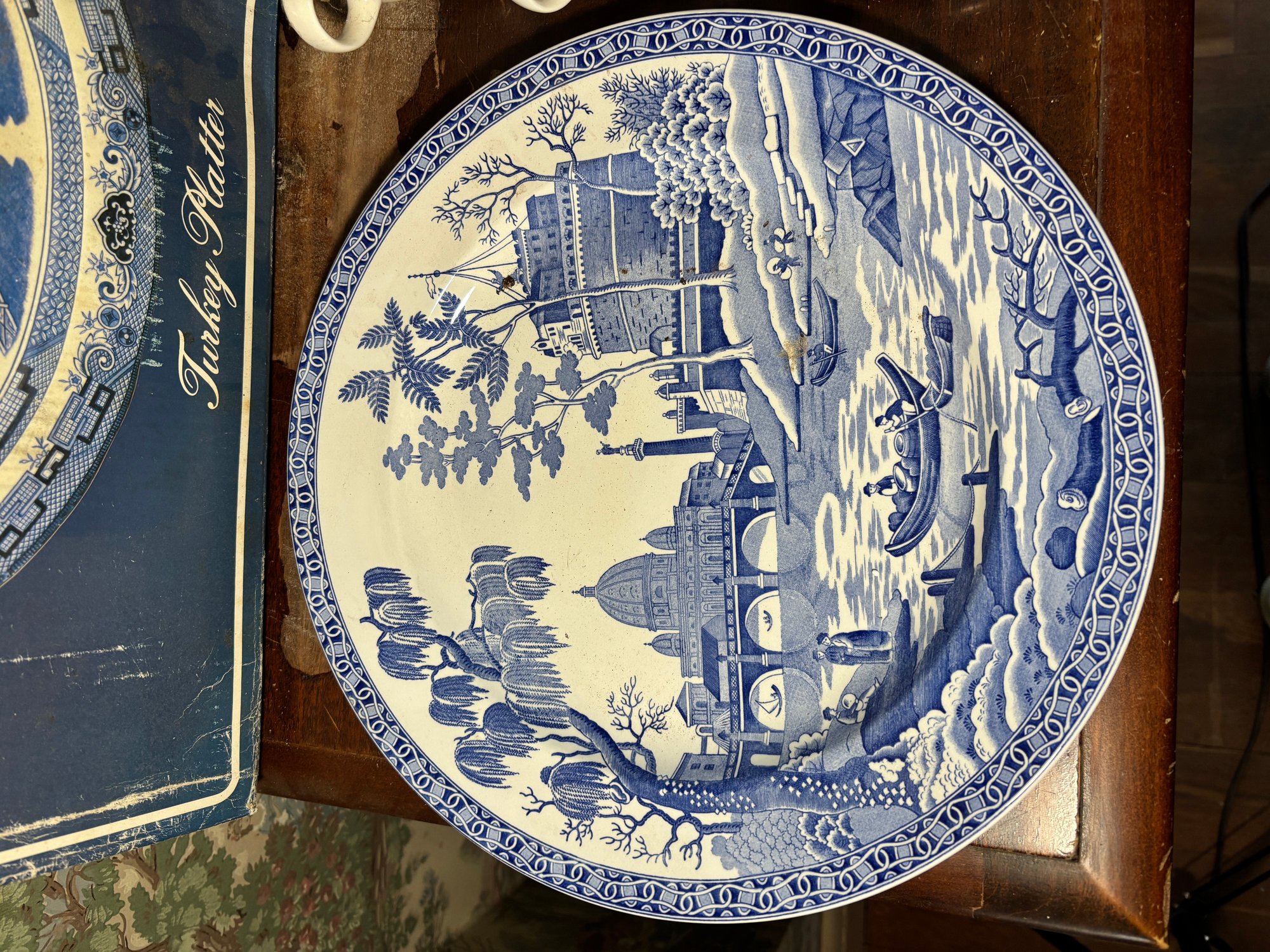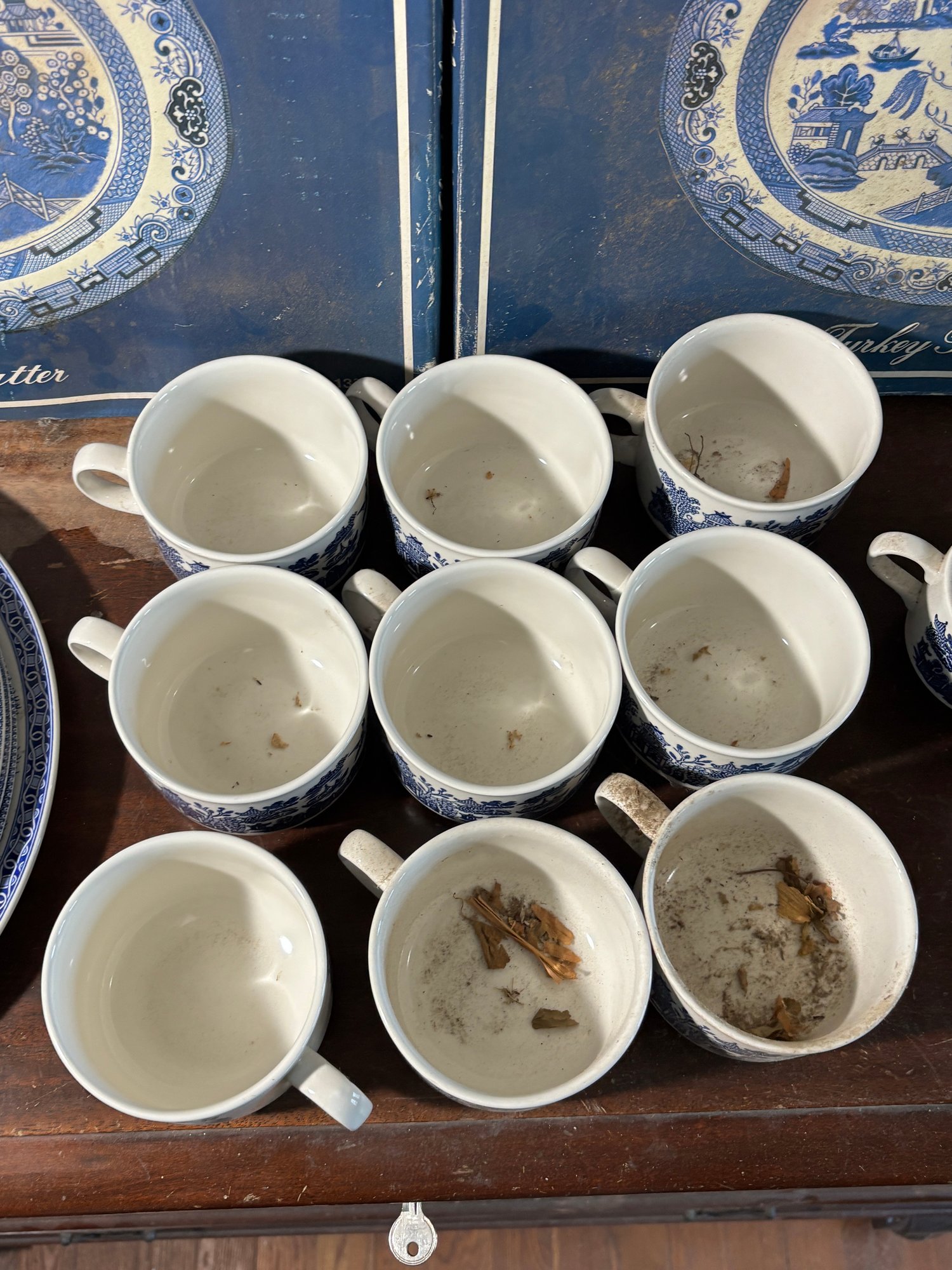 Includes 2 turkey platers, a large plate, 3 dinner plates, 3 saucers, 11 mugs, 3 cups