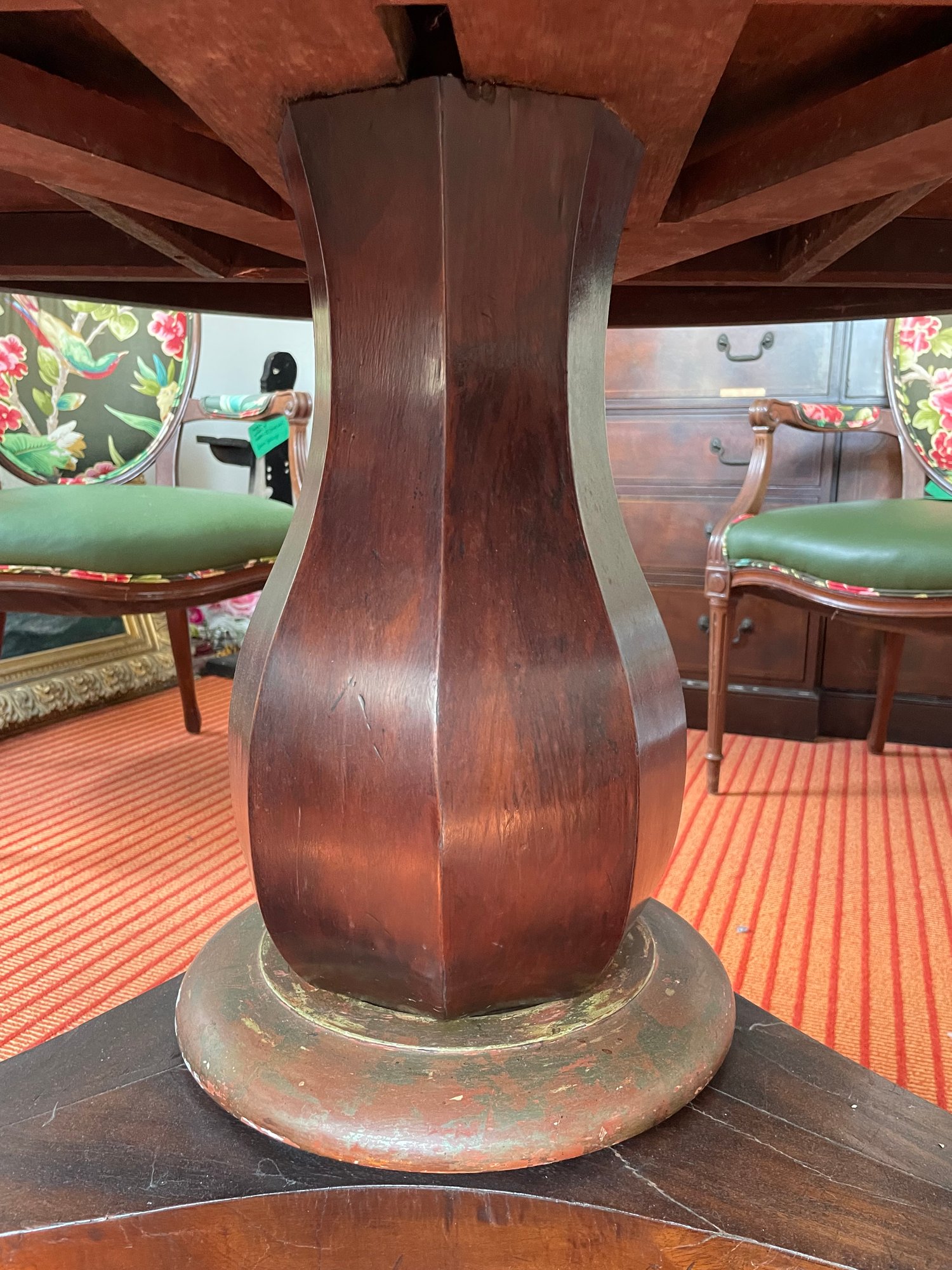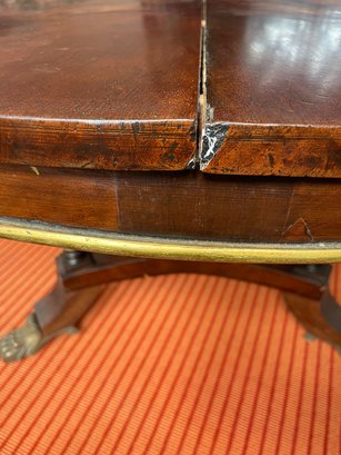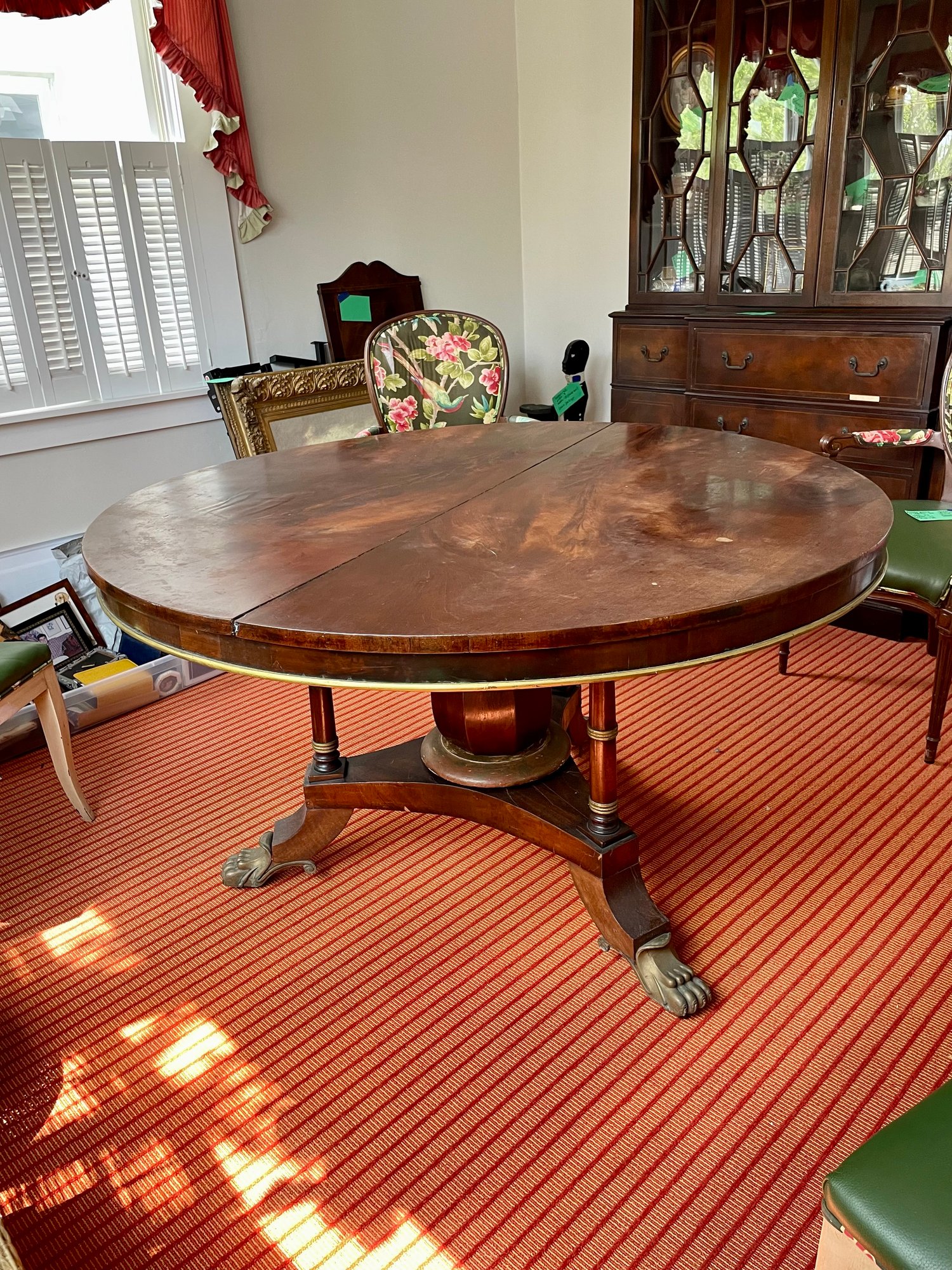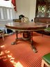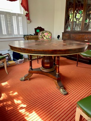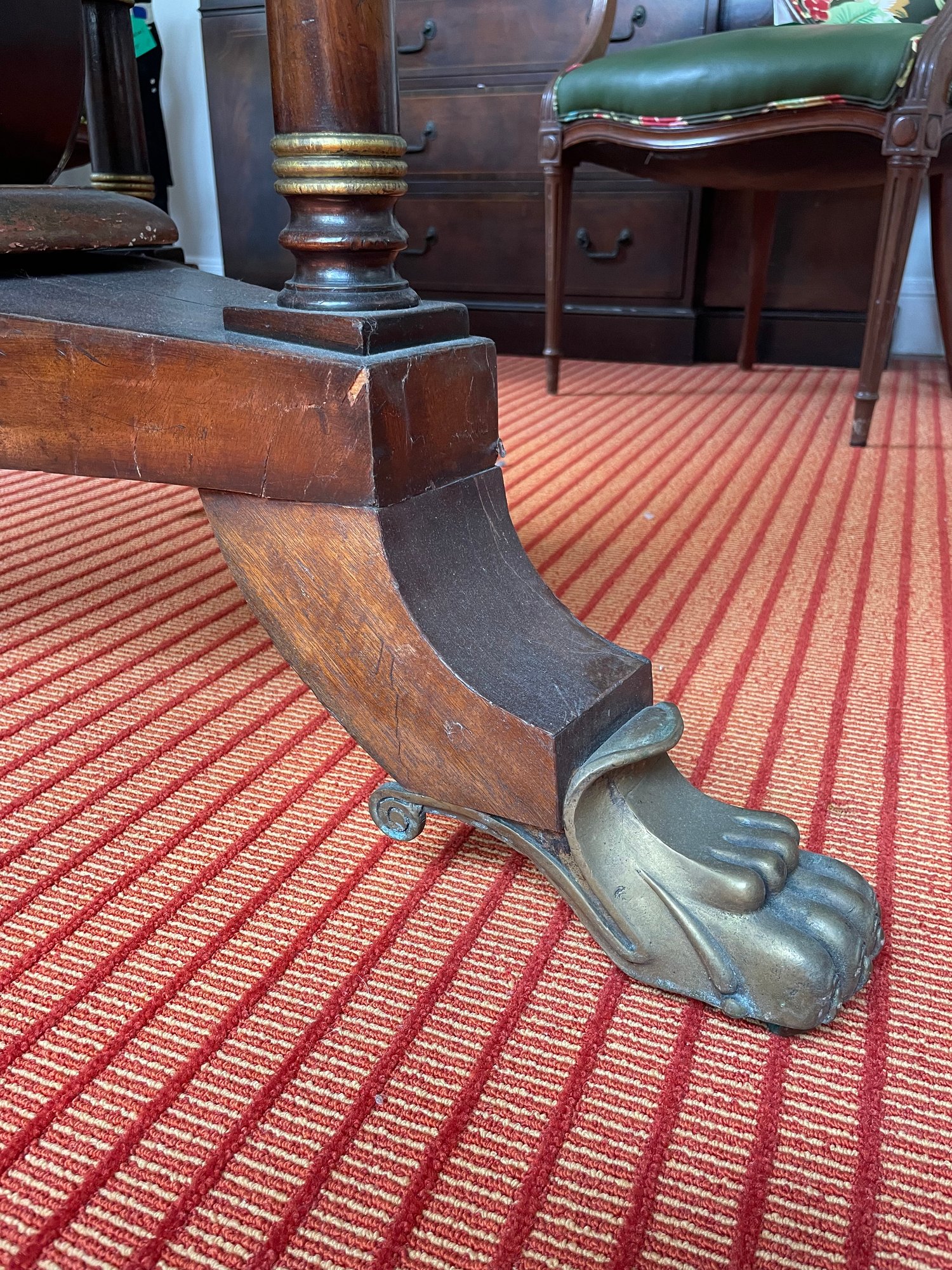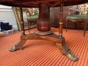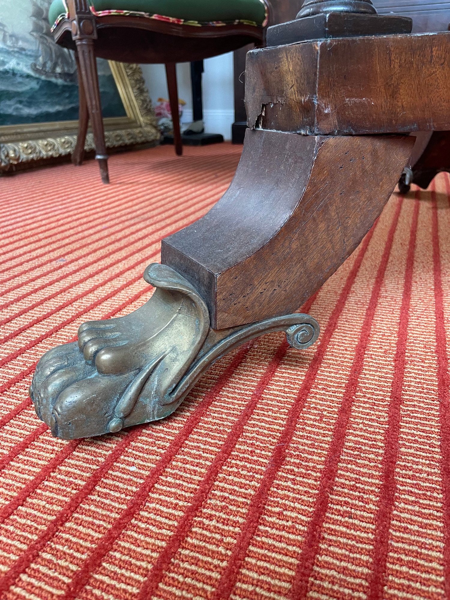 Pedestal table, 3 legs on wheels, solid brass claw feet