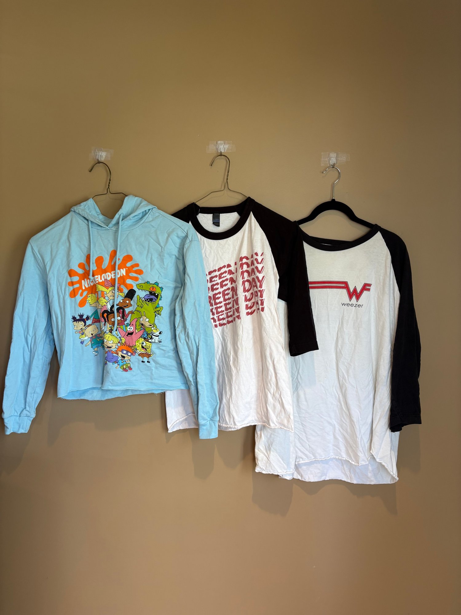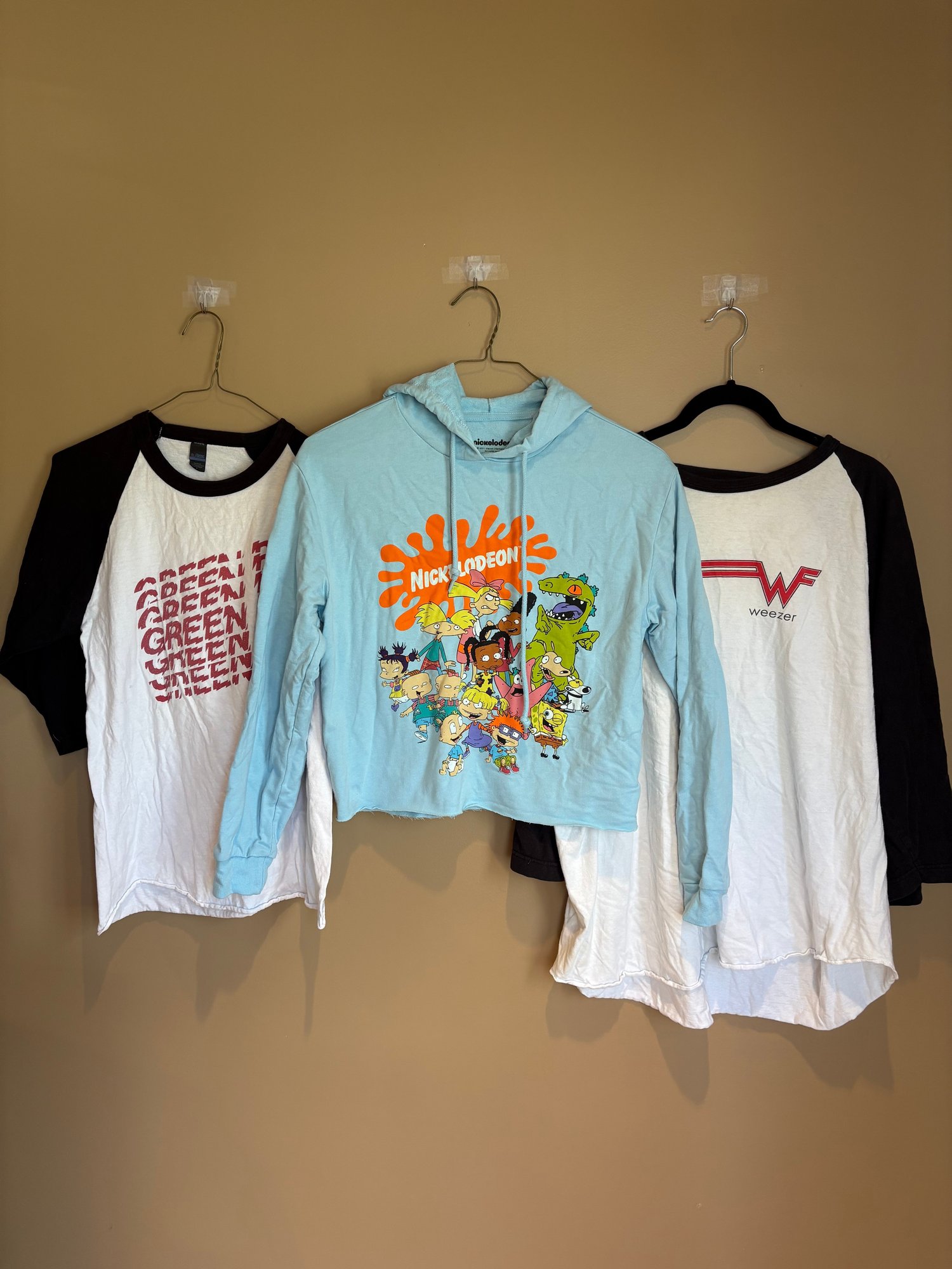 Two Coeur links concert tees ones Weezer the other ones Green Day Green Day small Weezer might be an extra large. There’s no tag and the Nickelodeon hooded blue is from 2021 and it’s a small crop.