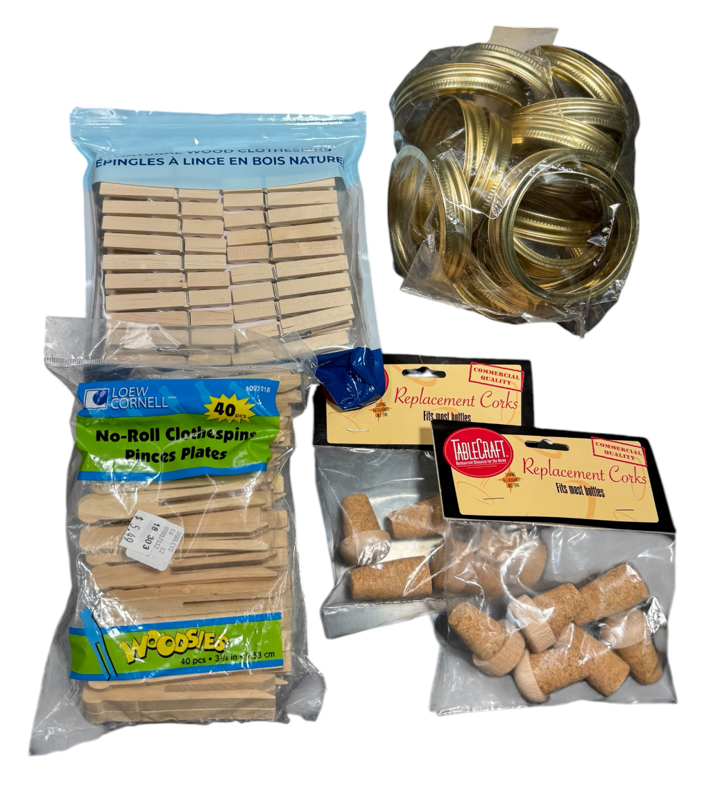 includes two packs of clothespins, two packs of replacement corks and a bag of mason jar lids