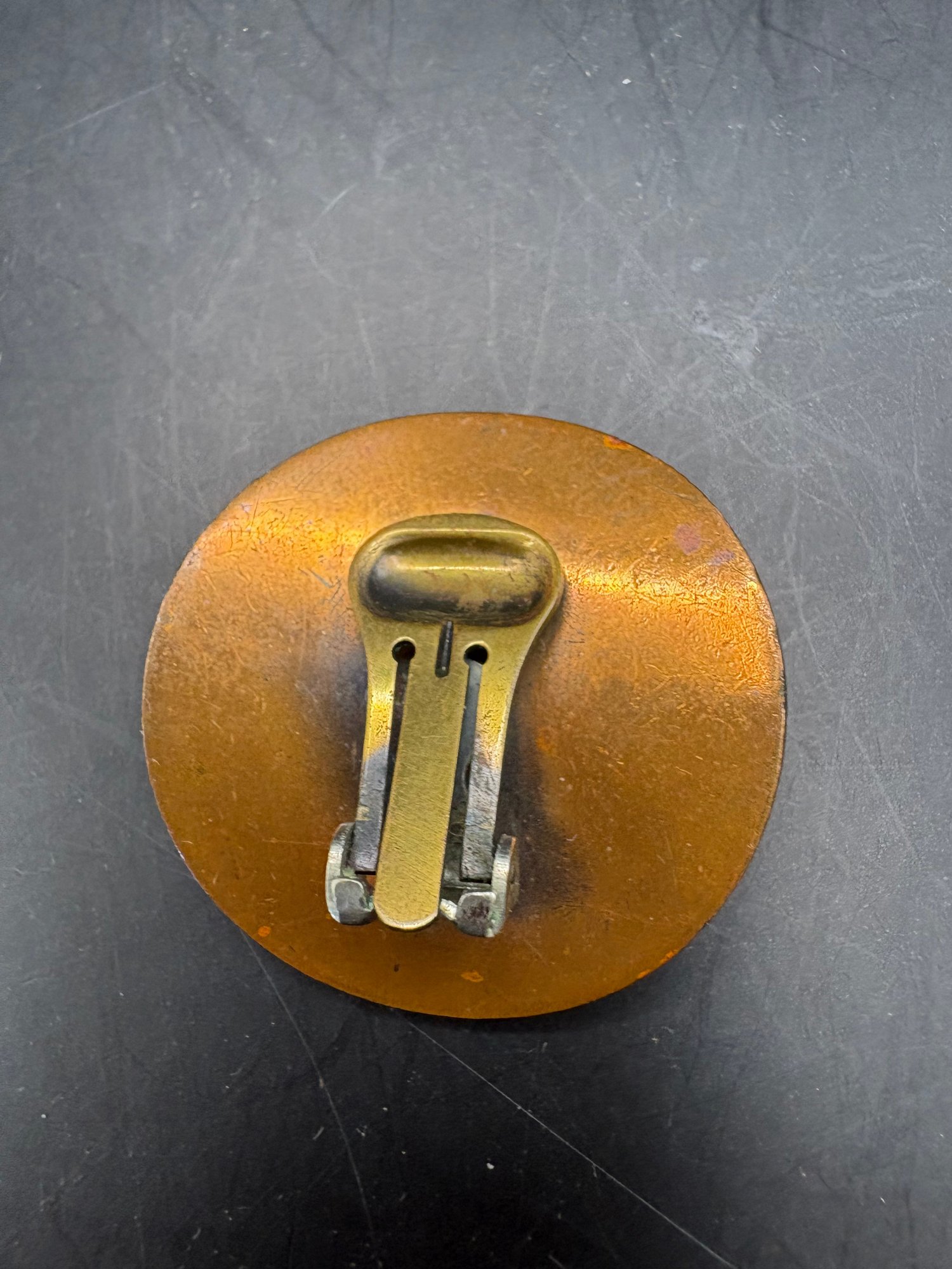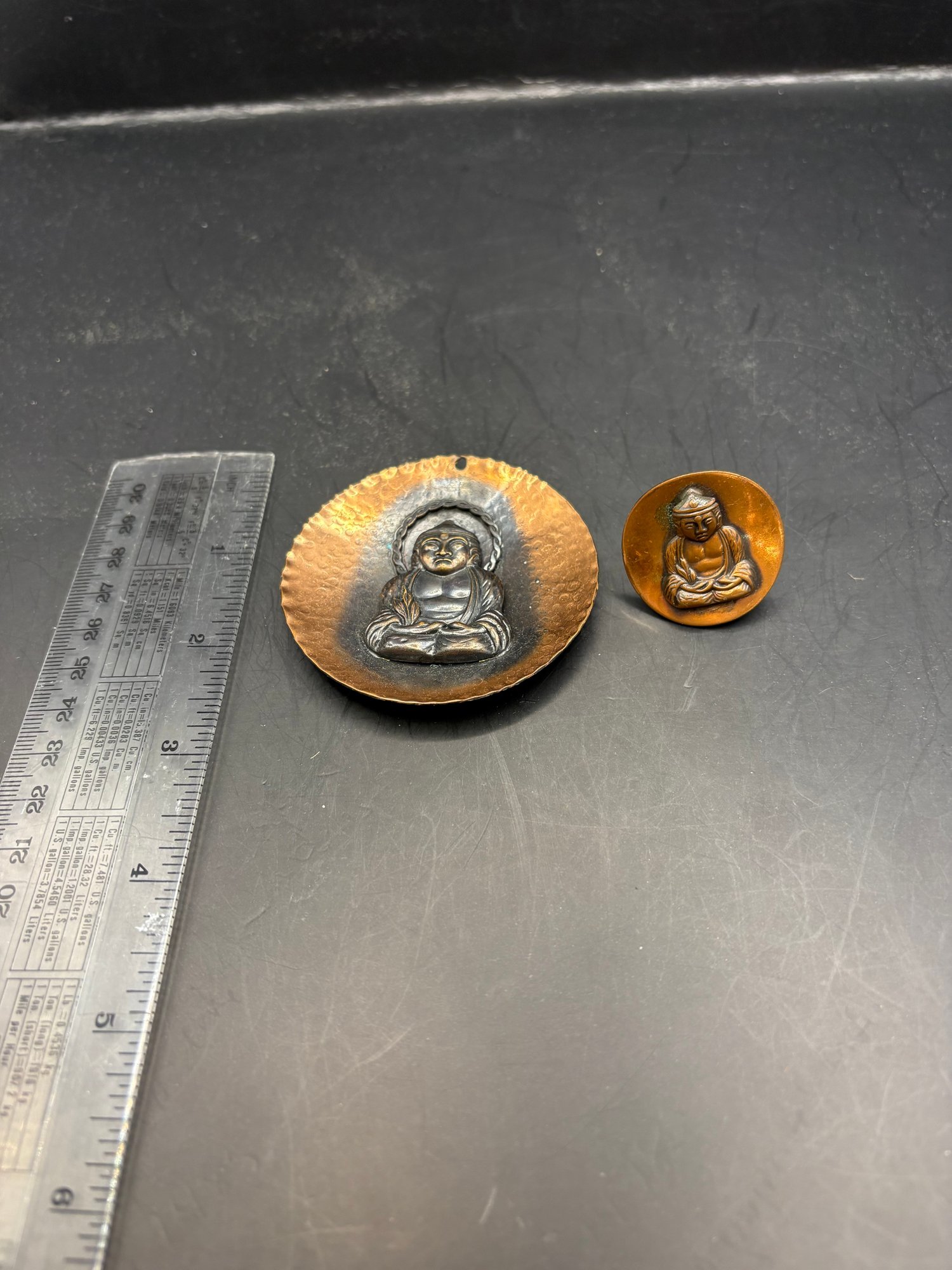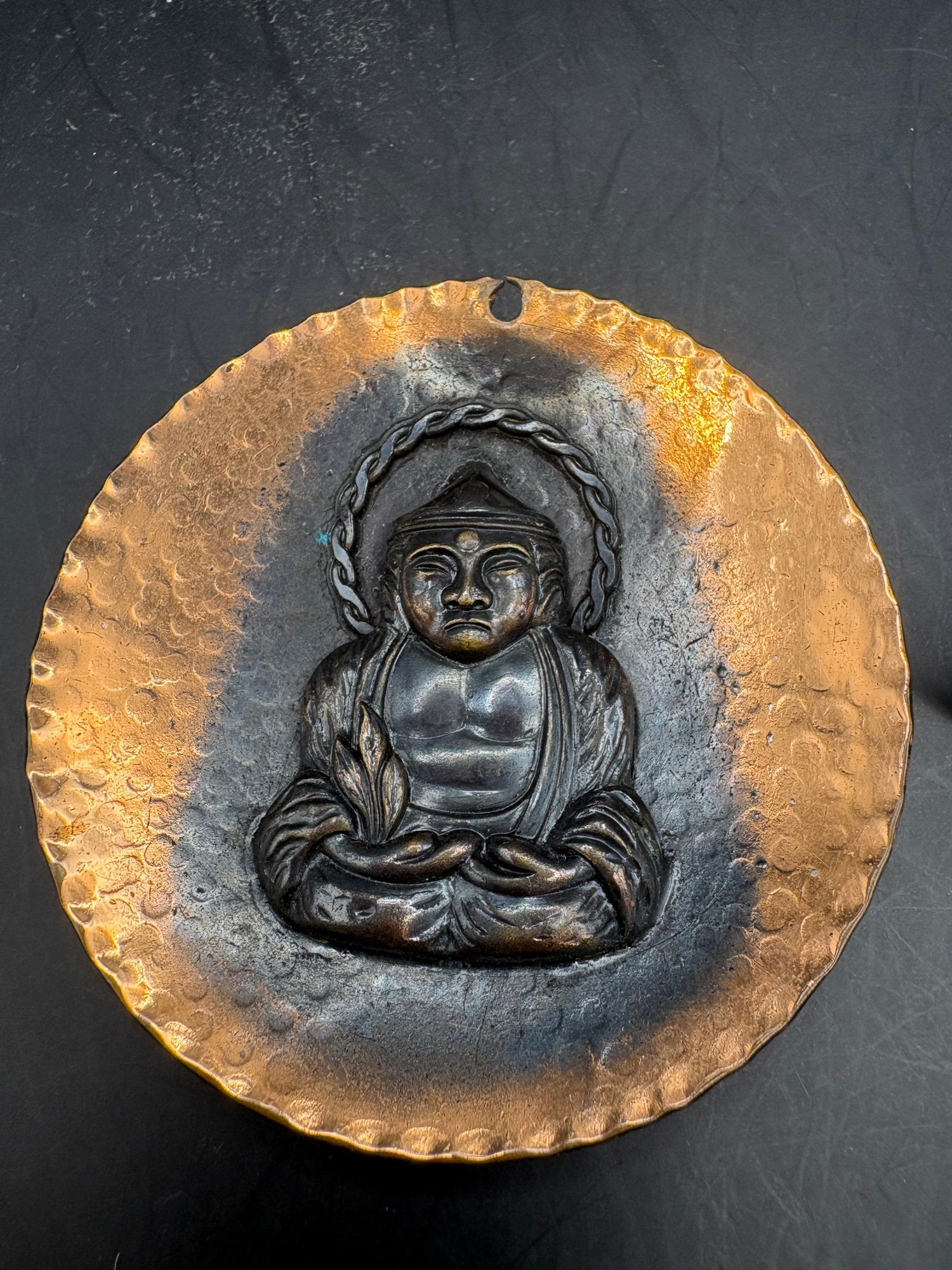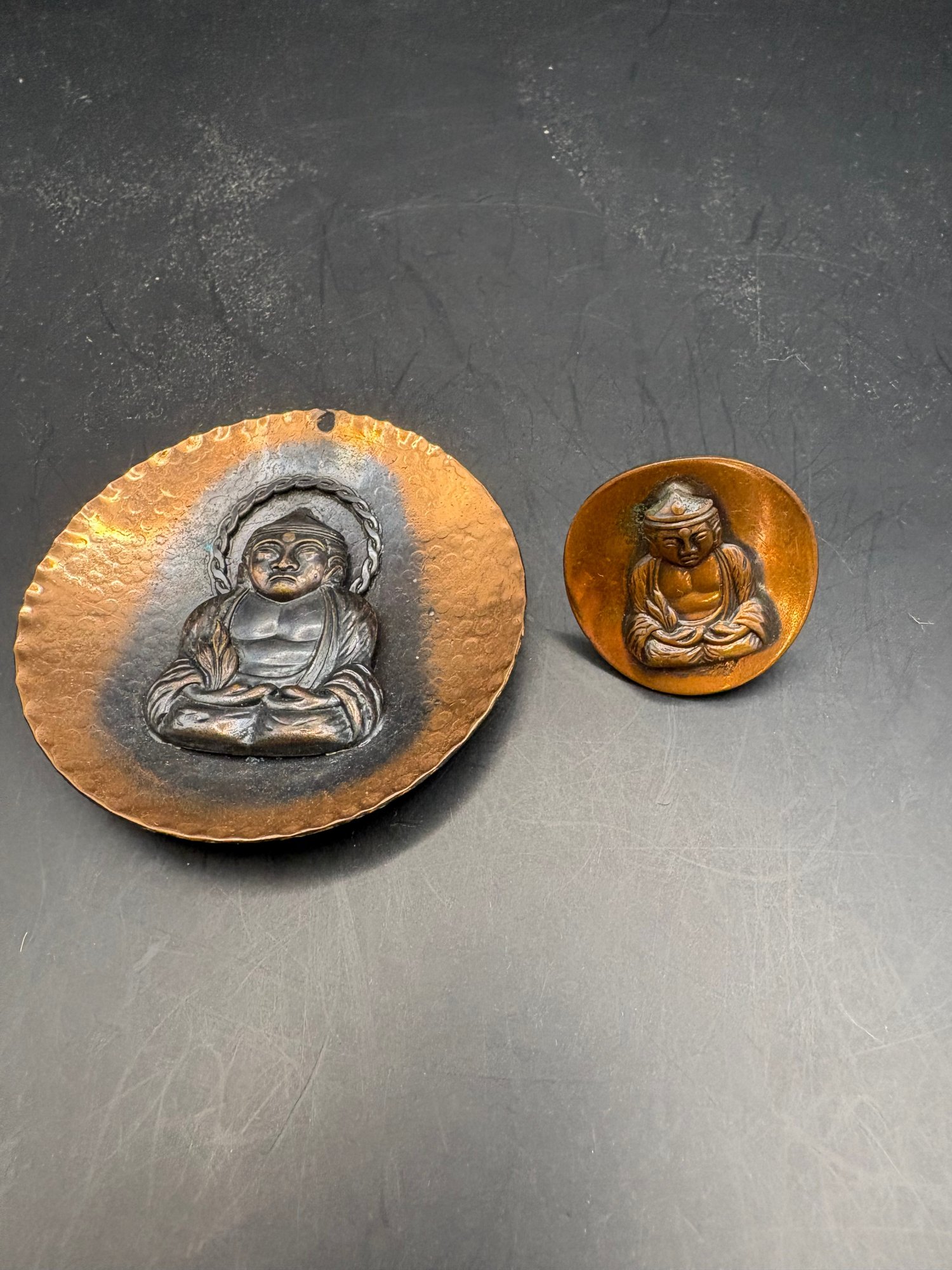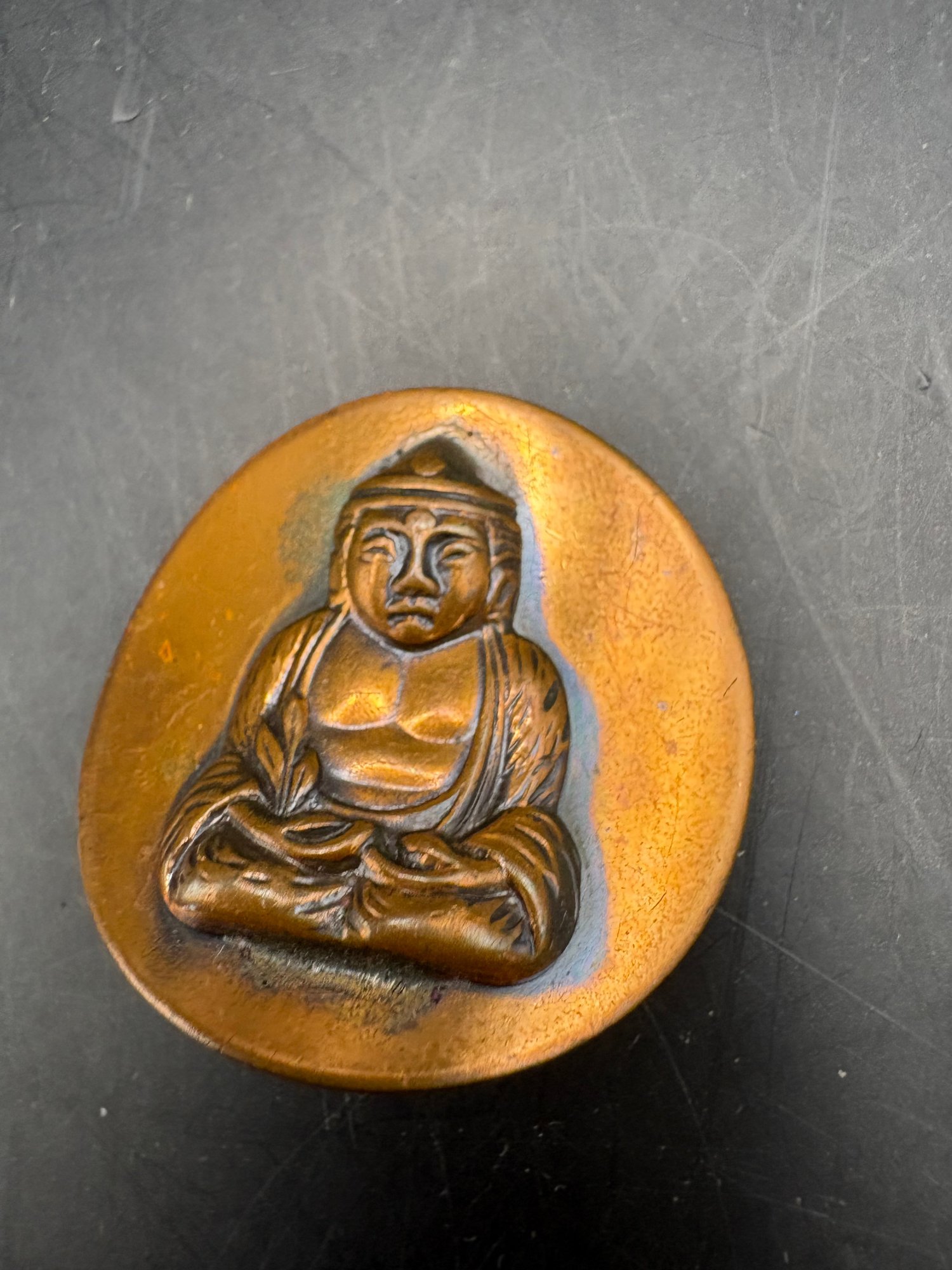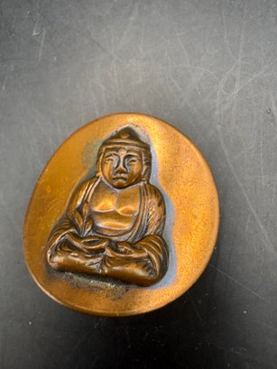 Two piece copper Buddha pendant hammered copper Buddha has a hole at the top to make a necklace and one clip on earring that we could probably make something with