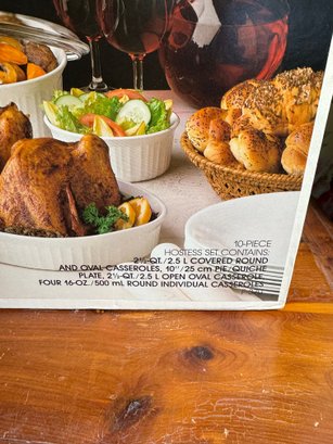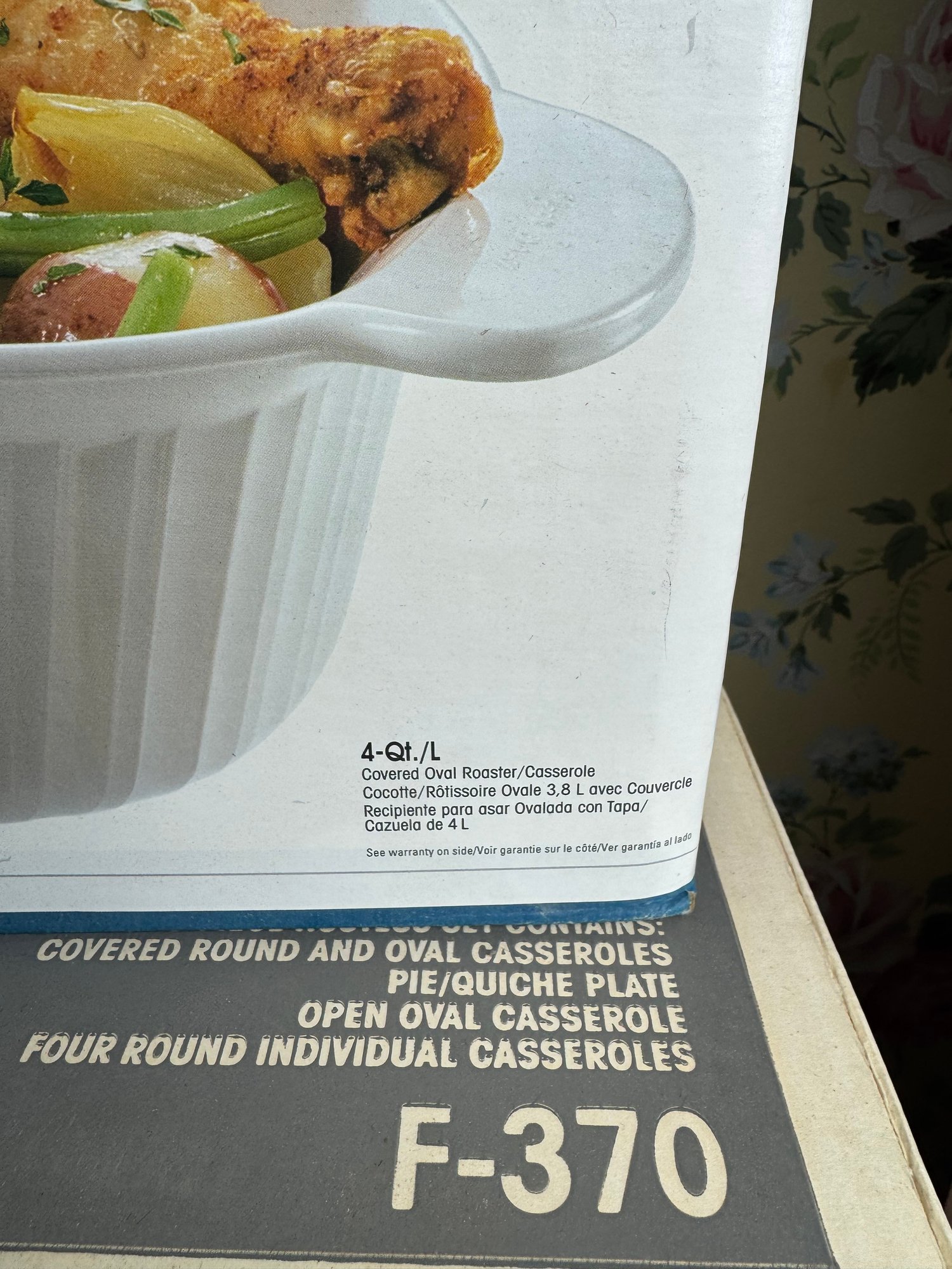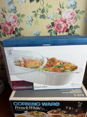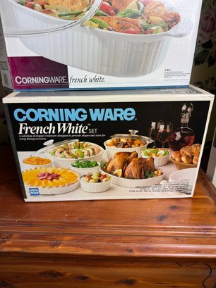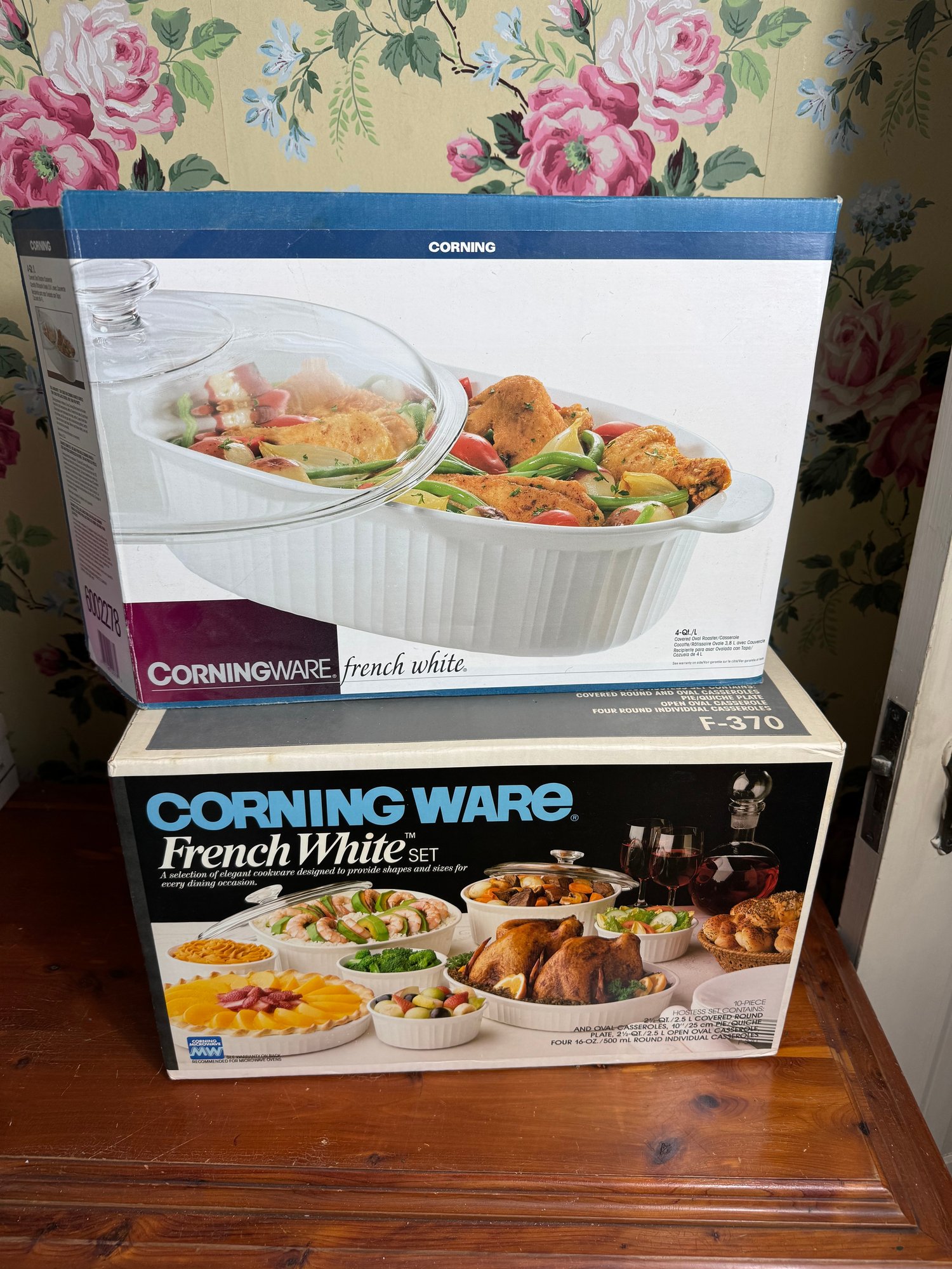 includes a brand new 10pc french white set, along with a 4QT casserole dish in good condition in open box