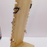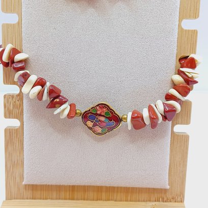 1 x 6.5" long; brick and ivory colored with cloisonné piece in middle of a bird and flowers
