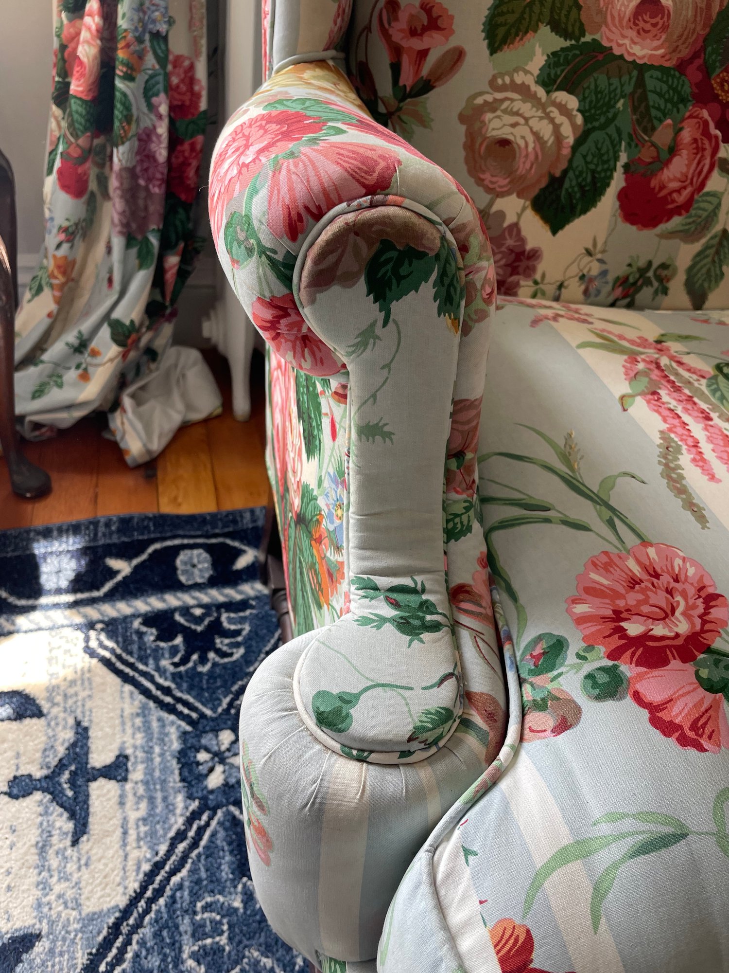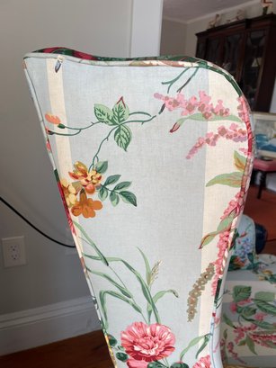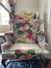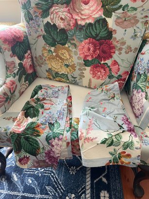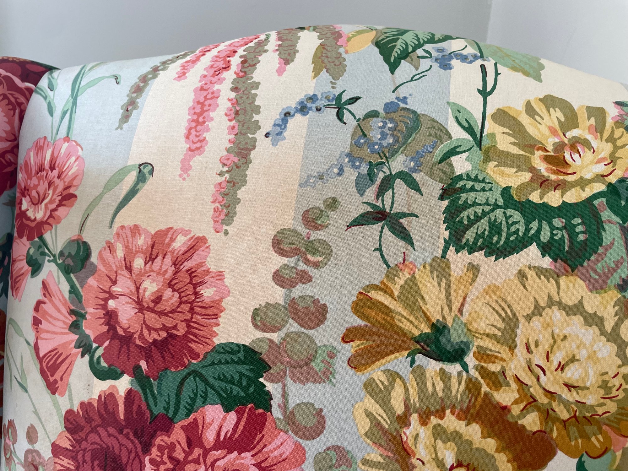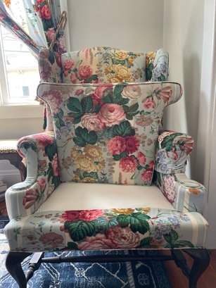 Cowtan & Tout ‘Le Rosier’ hand printed in France 1983, cotton chinz on a wing chair, cabbage roses on light blue & white stripes.
