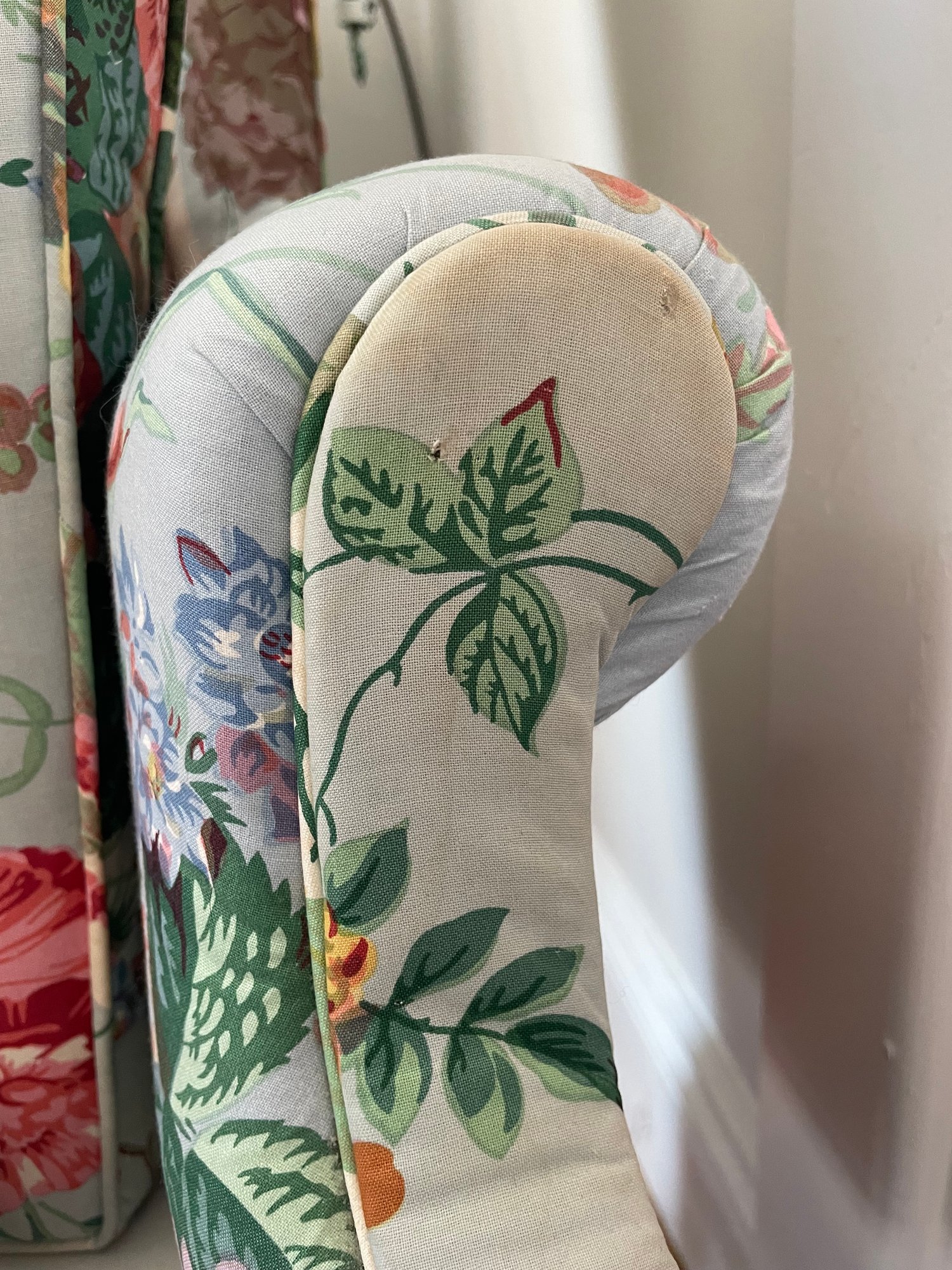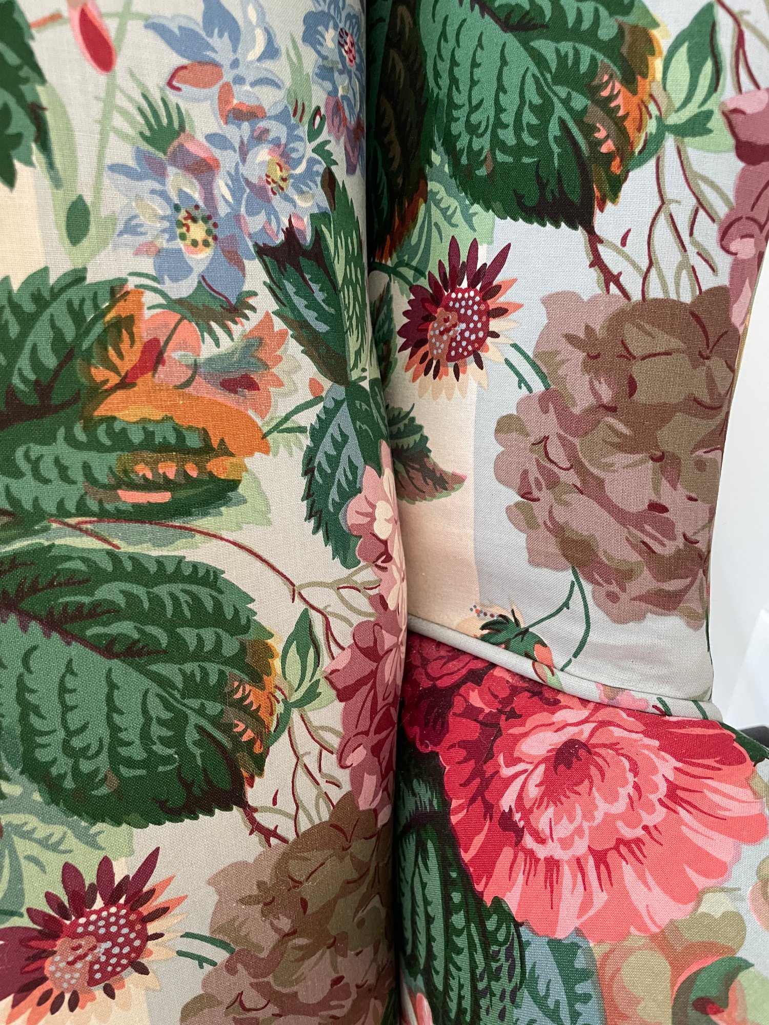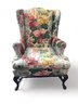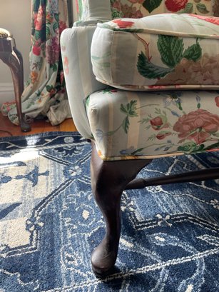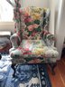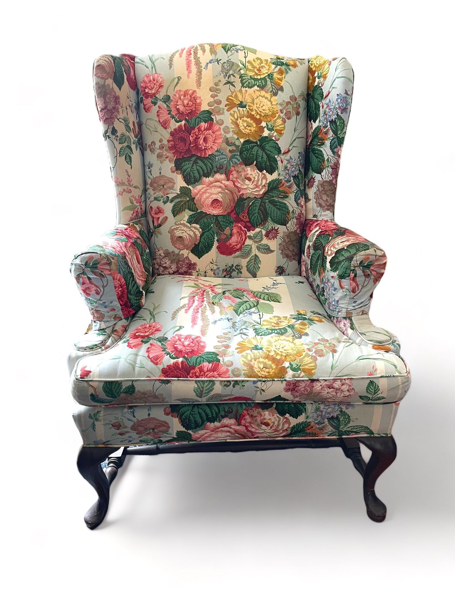 Cowtan & Tout ‘Le Rosier’ hand printed in France 1983, cotton chinz on a wing chair, cabbage roses on light blue & white stripes.