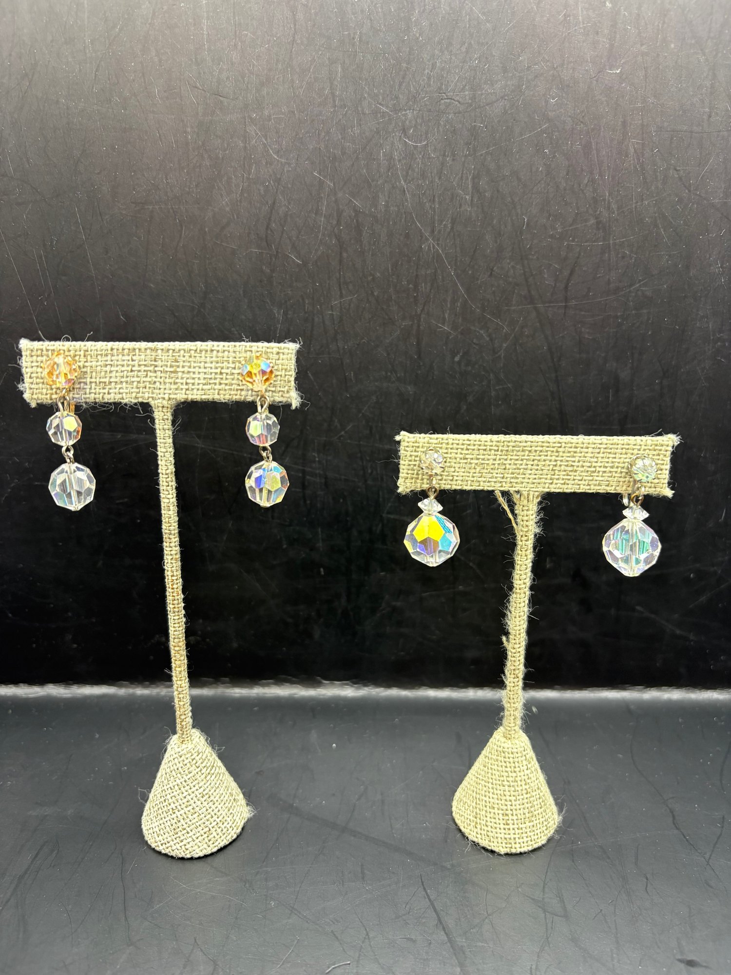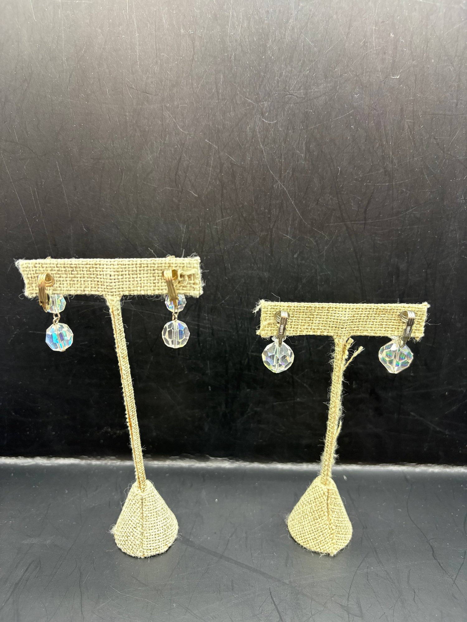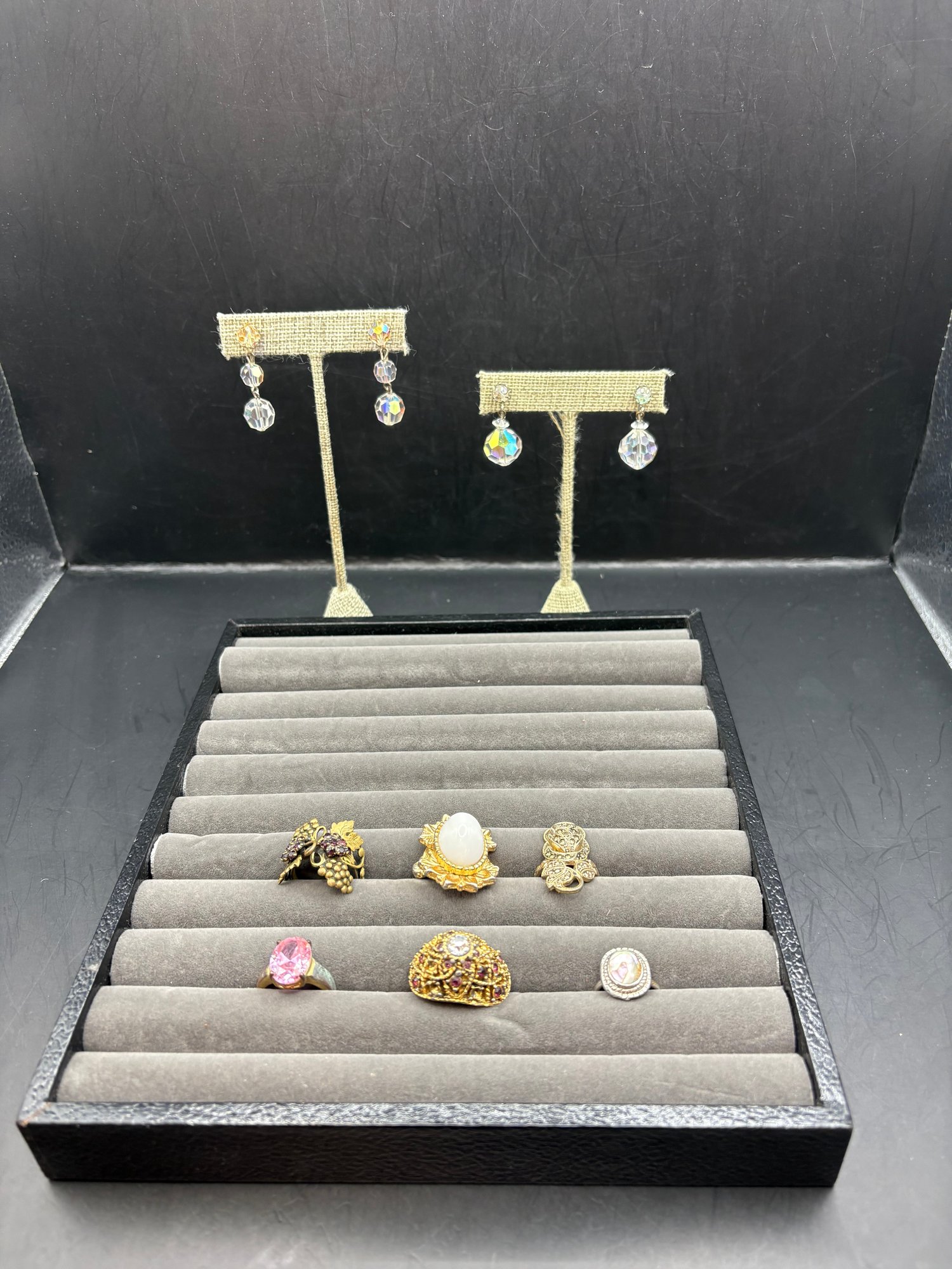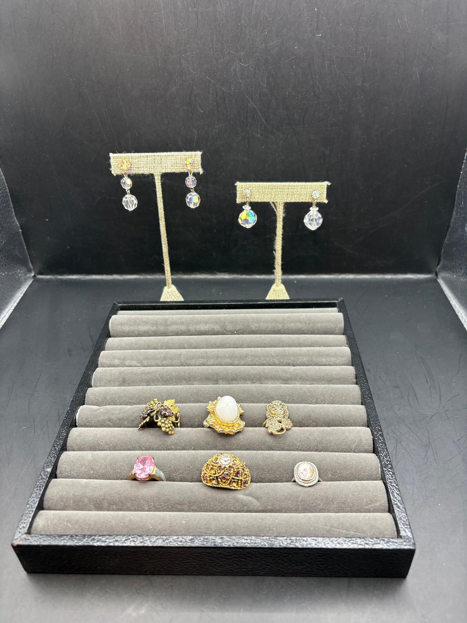 Two pairs of clip on crystal earrings and six rings in holder