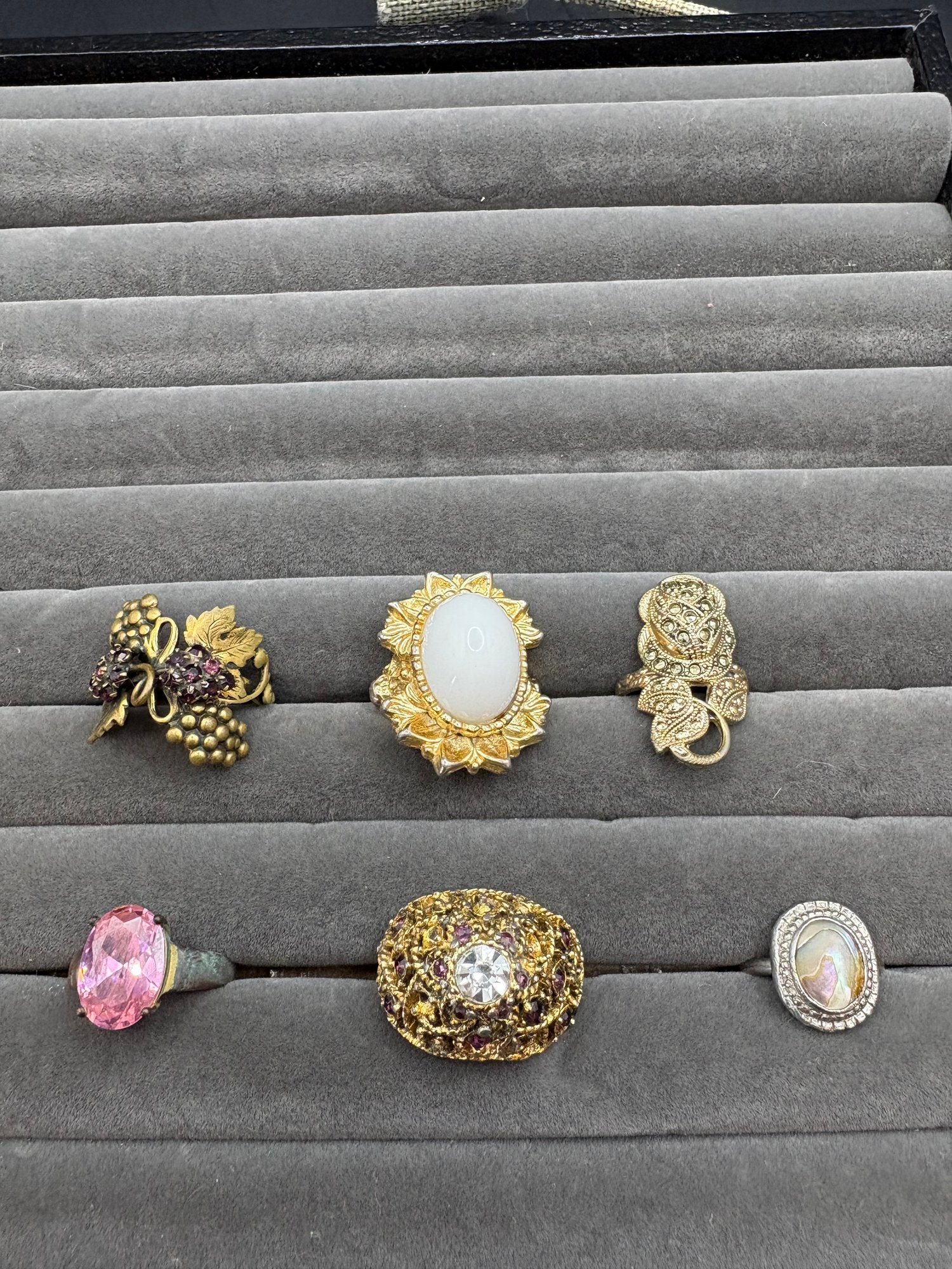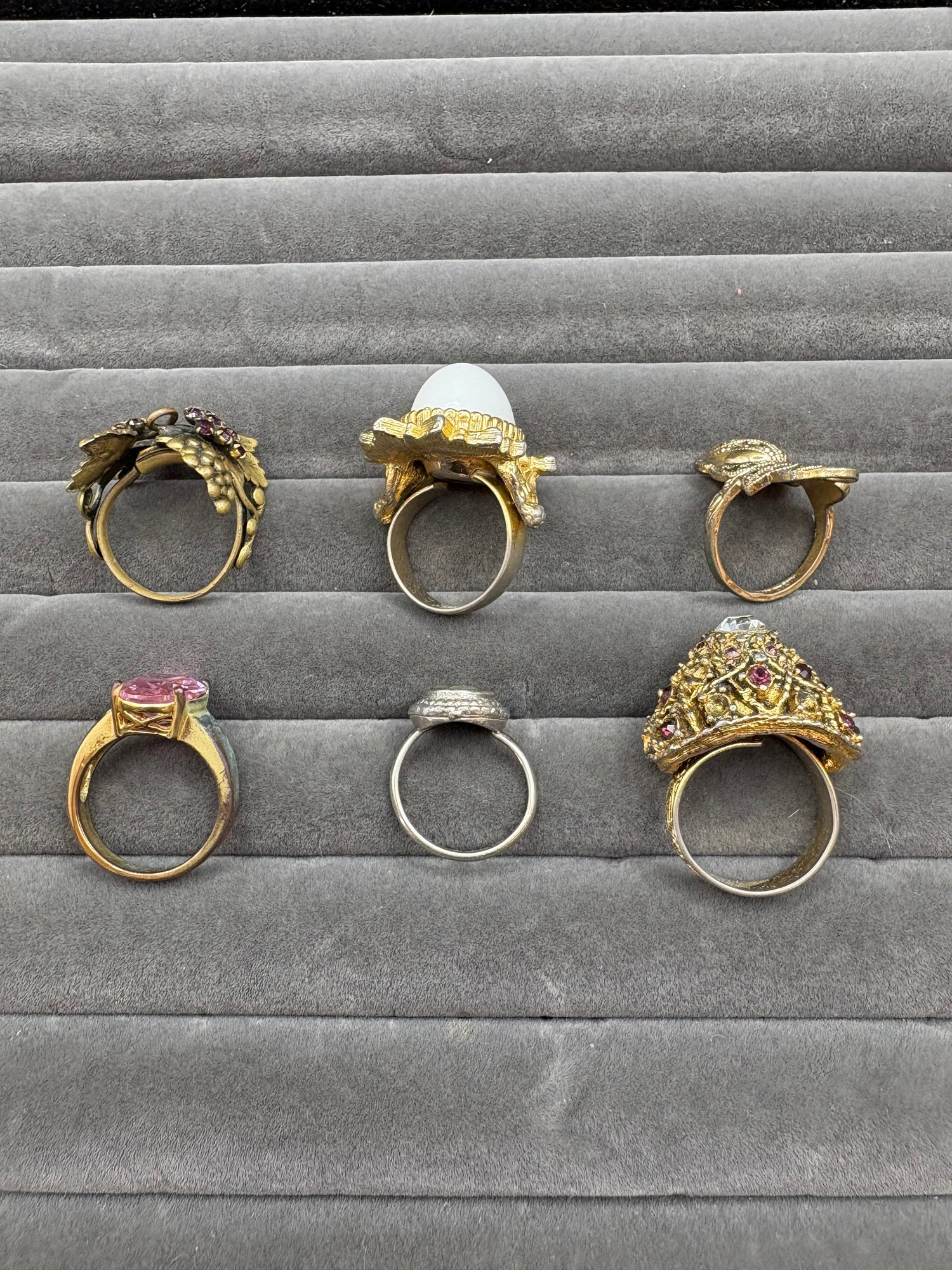 Ring sizes run from the smallest at 4.25 up to 7.25; 3 of the statement, brass toned are adjustable in size
