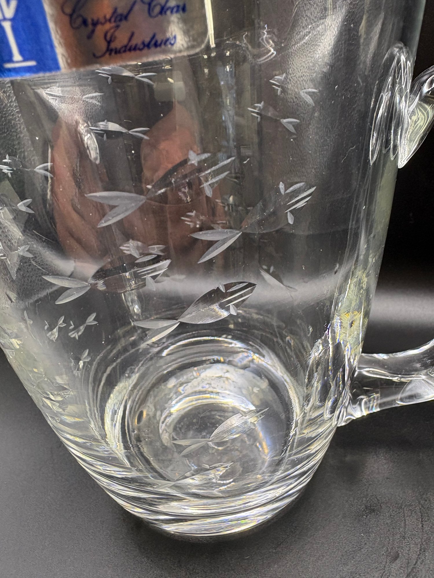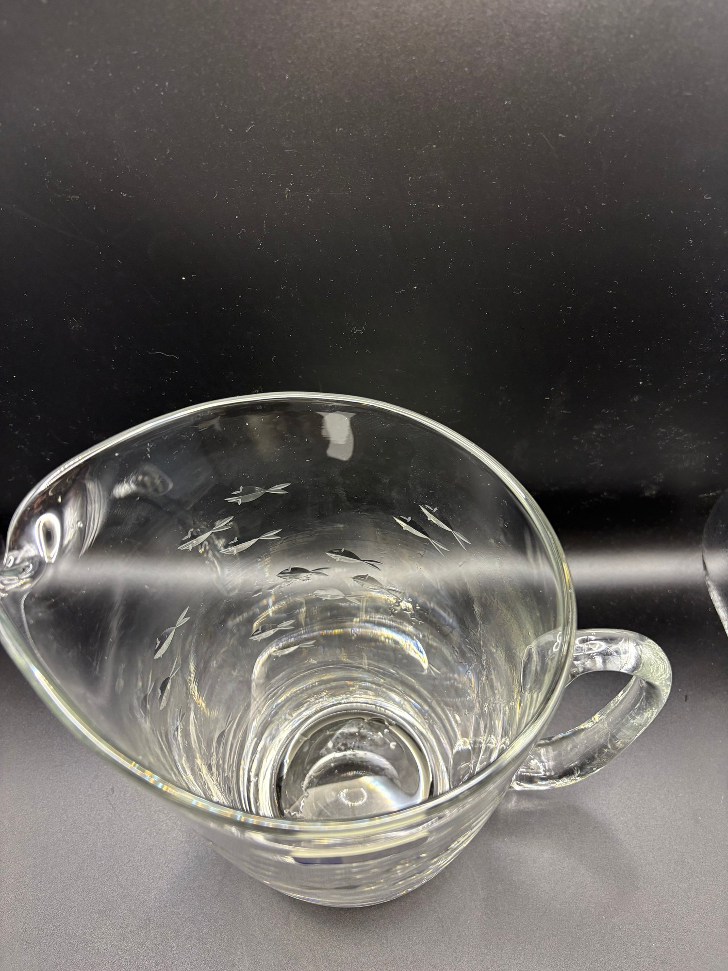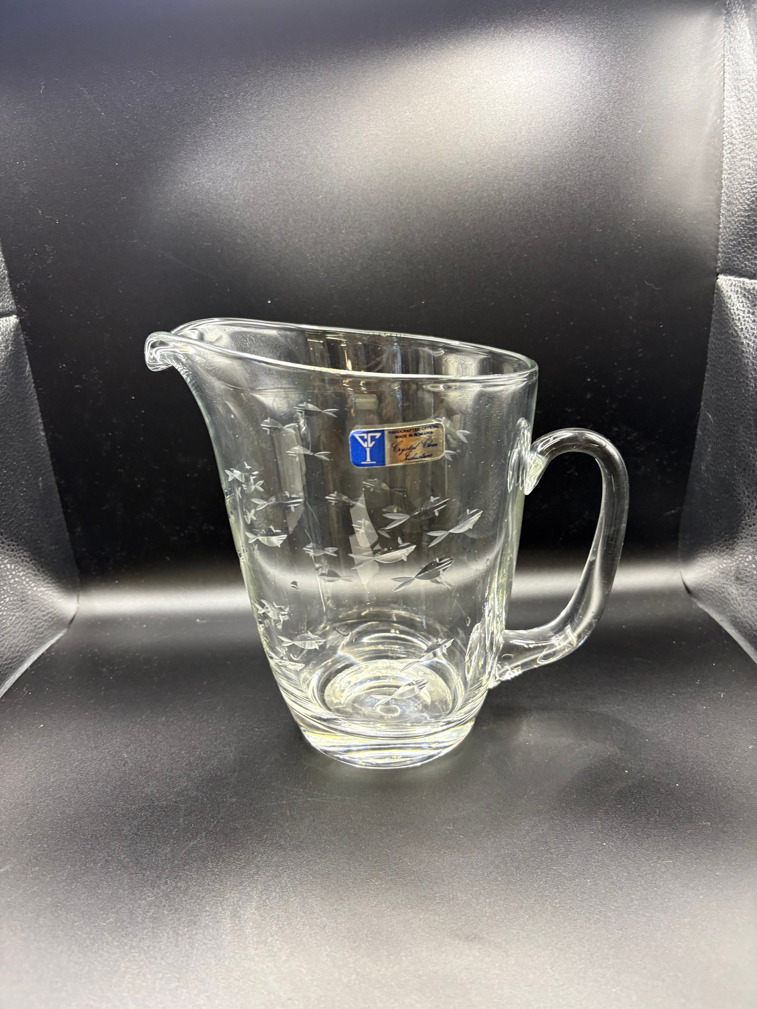 Crystal Clear Industries crystal glass, featuring various etched designs like fish or clusters. 8 by 10 in to handle