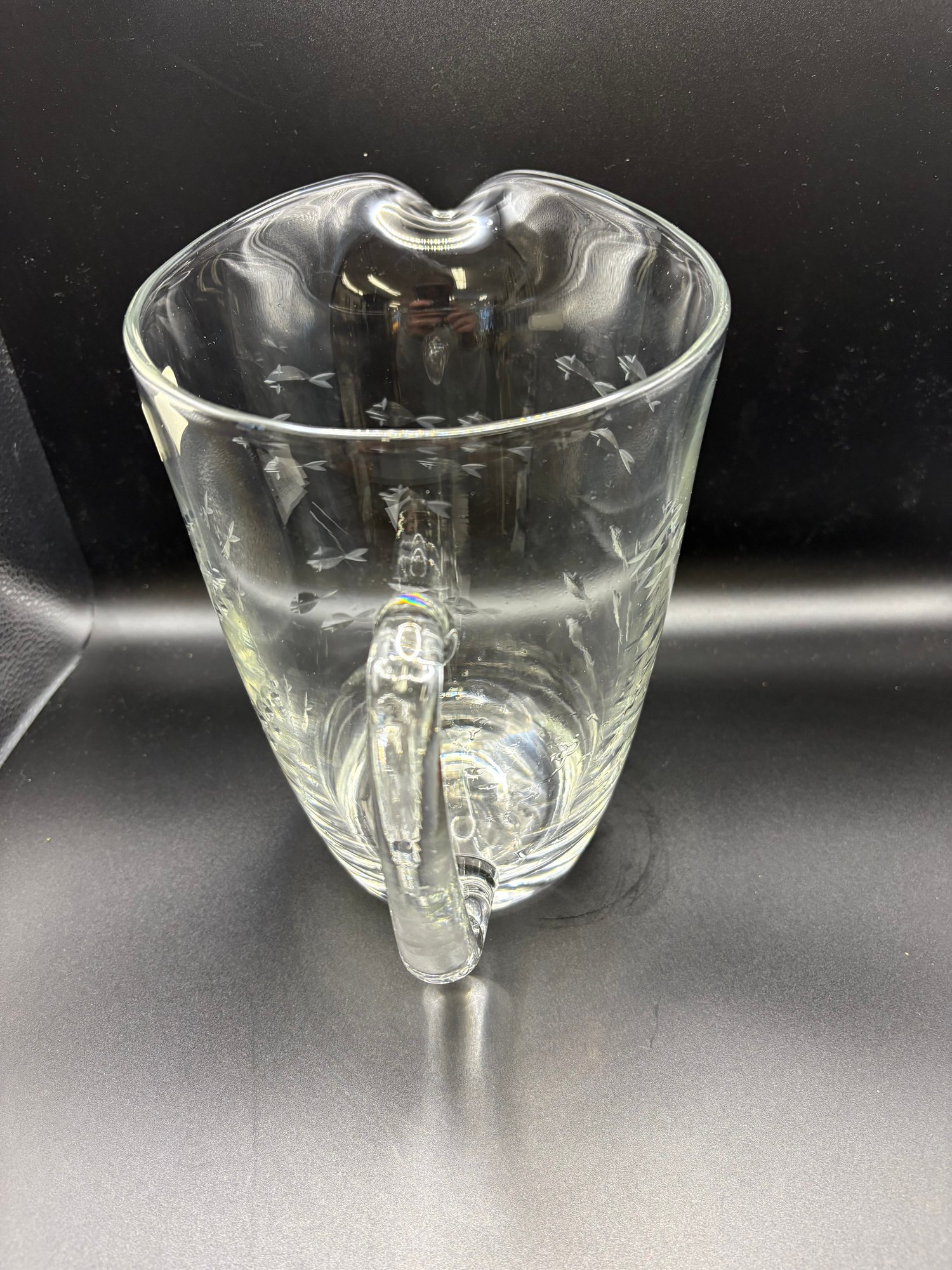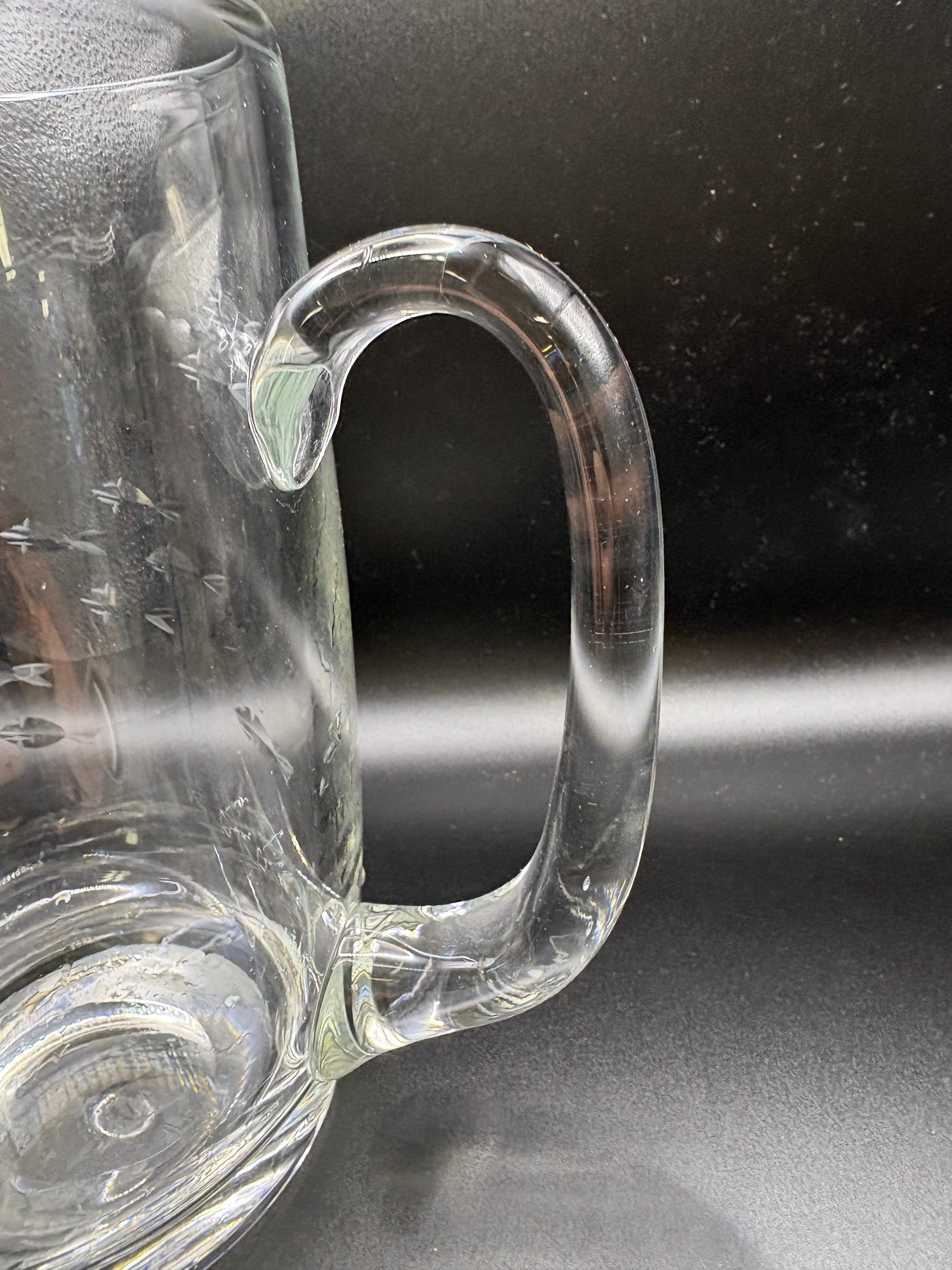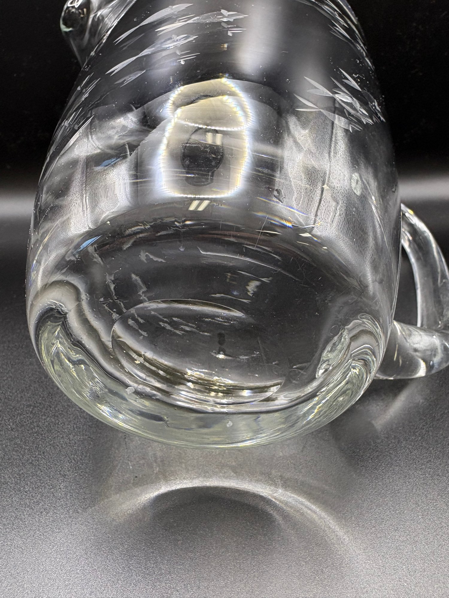 Crystal Clear Industries crystal glass, featuring various etched designs like fish or clusters. 8 by 10 in to handle