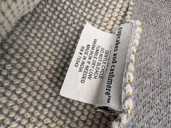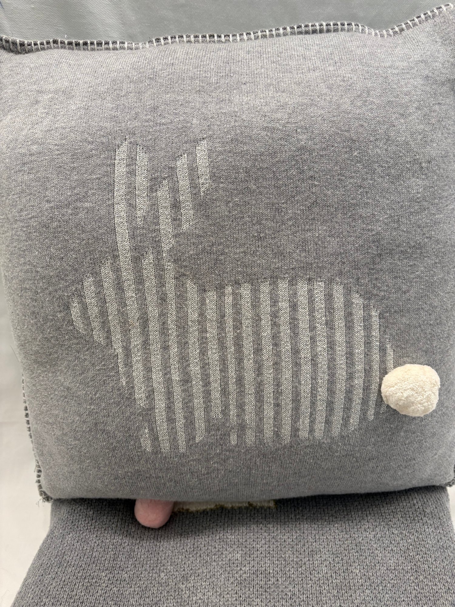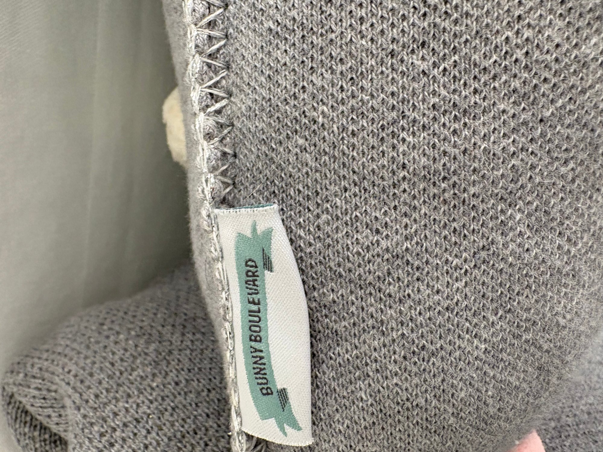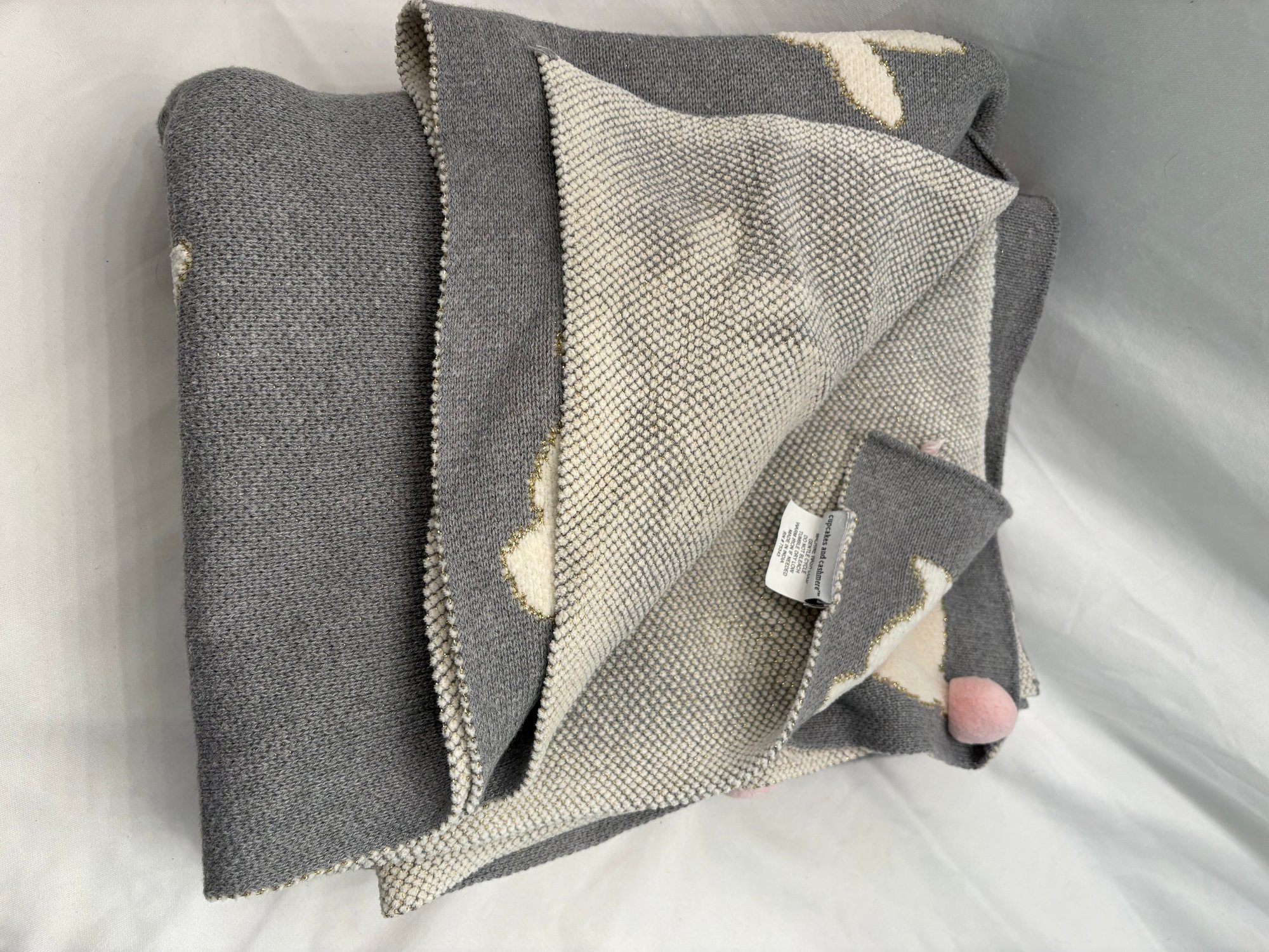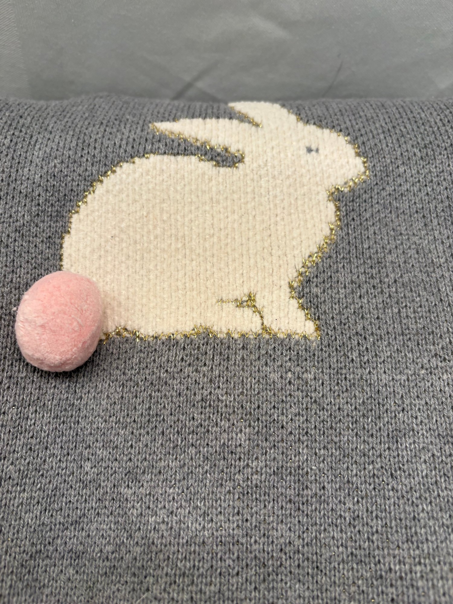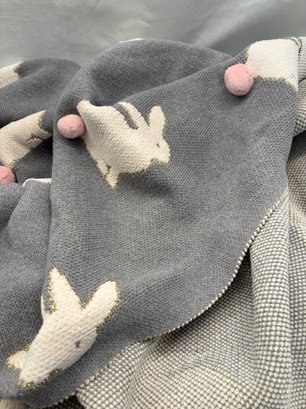 Adorable grey pink Pom Pom tail on white bunnies. 62 by 46.
