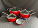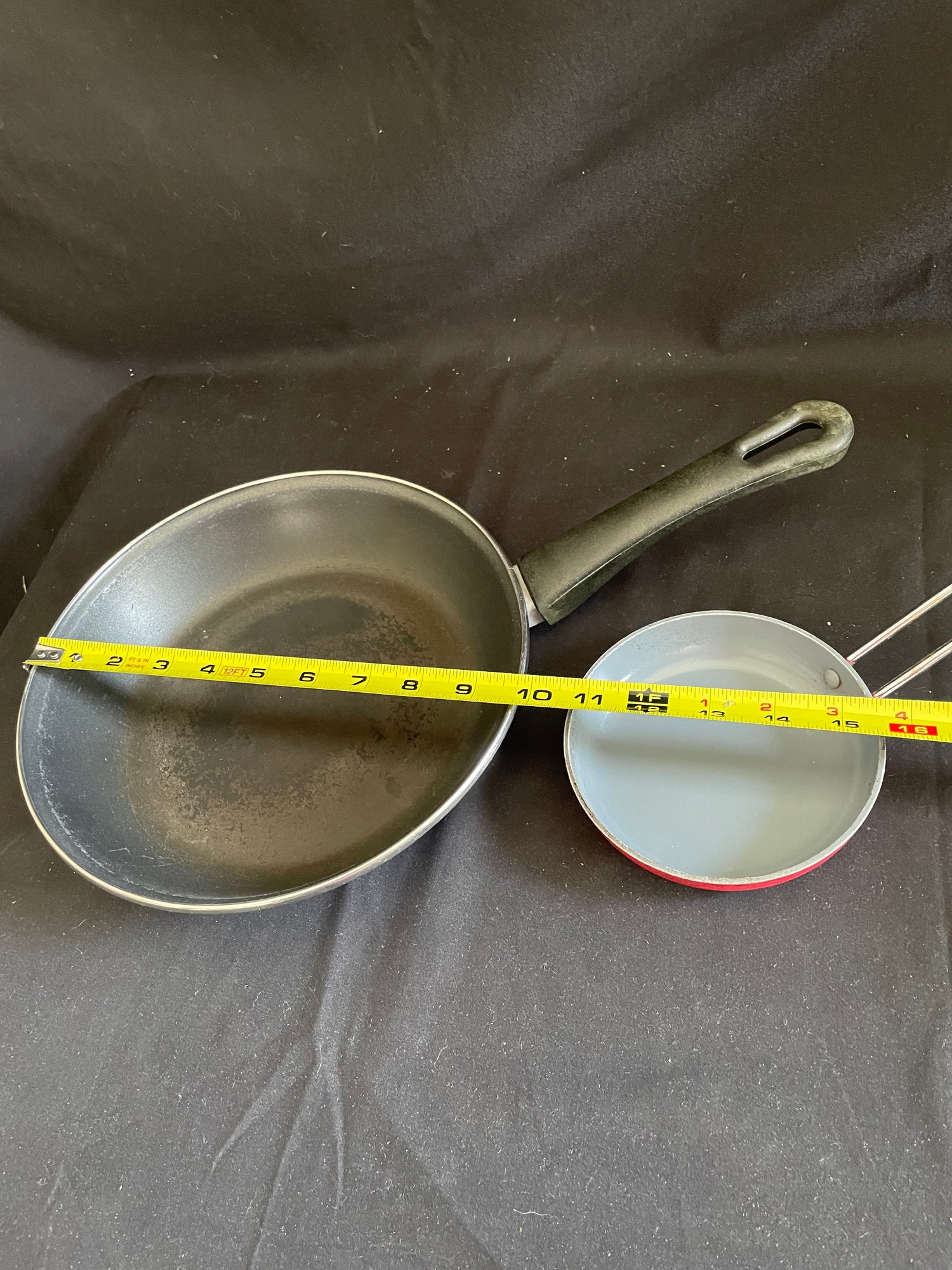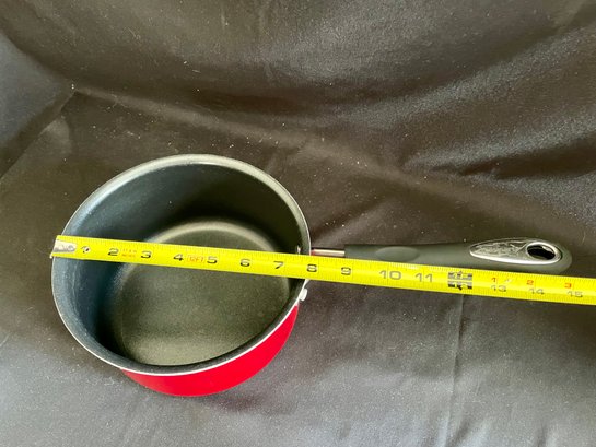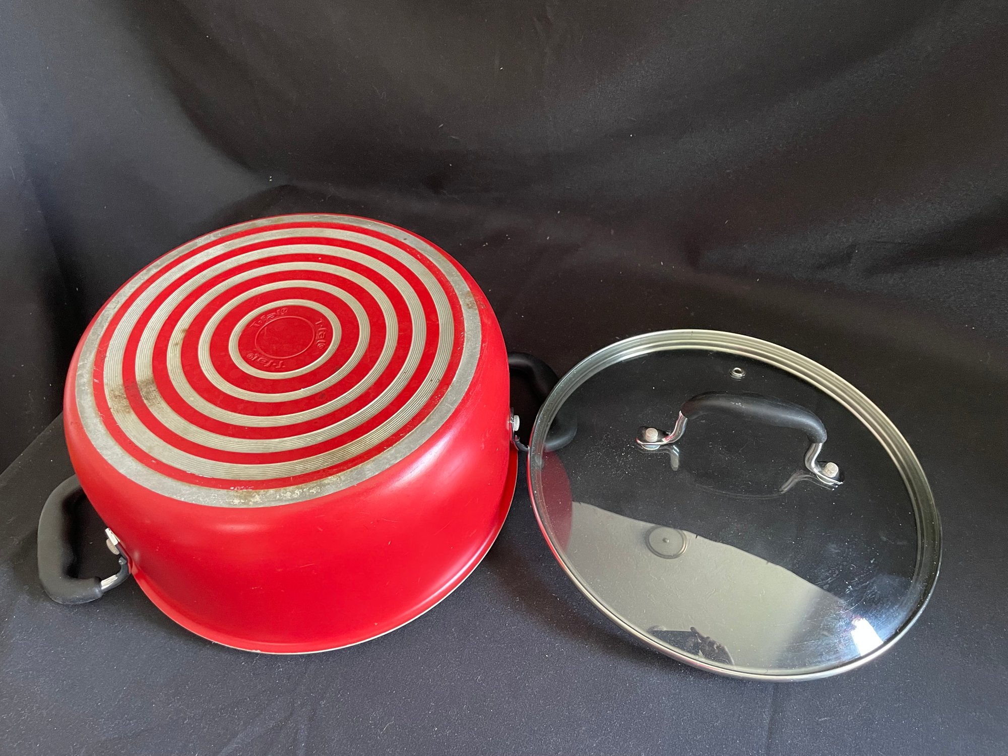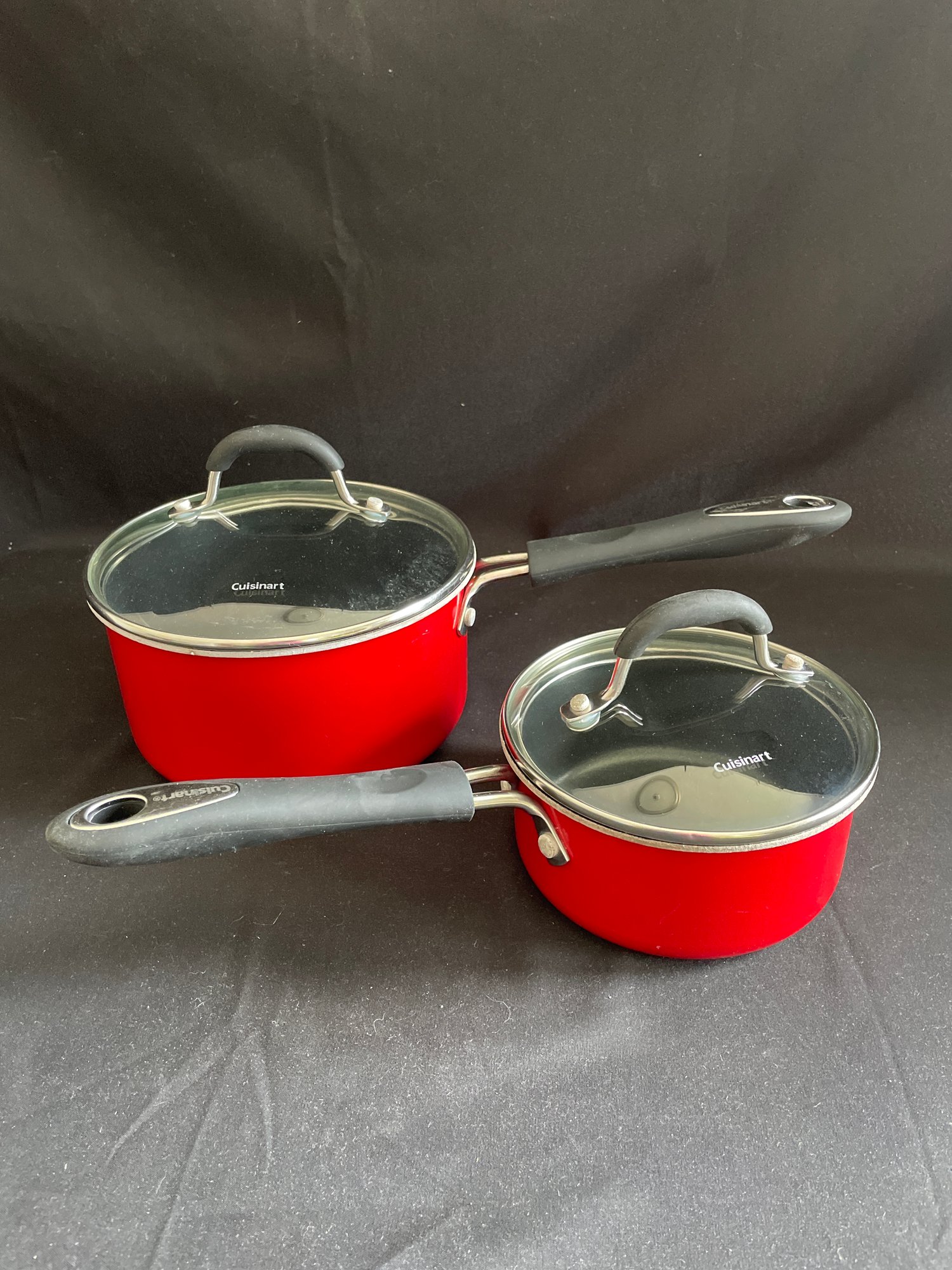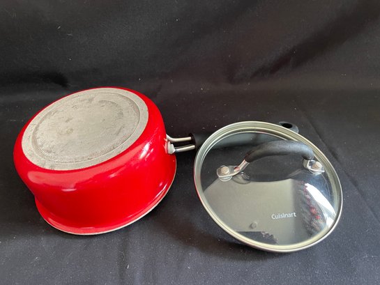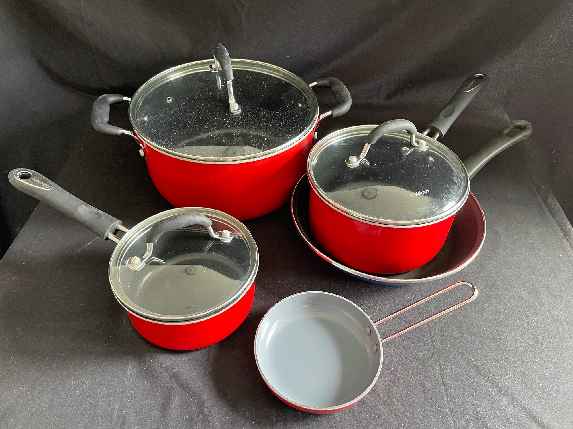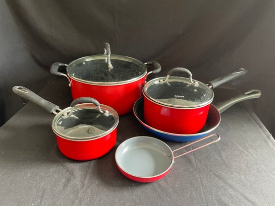 2 covered Cuisinart sauce pans, T-Fal covered Dutch oven, Fasga 10” frying pan, Fiesta sauté pan